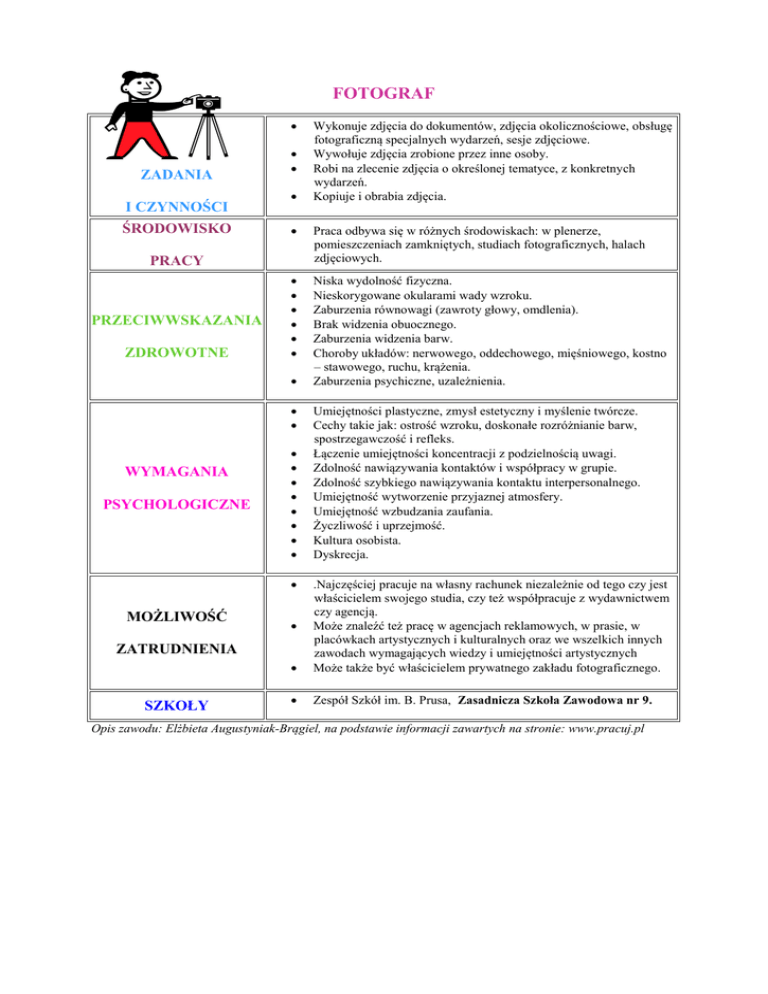FOTOGRAF ZADANIA I CZYNNOŚCI ŚRODOWISKO Praca odbywa się w różnych środowiskach: w plenerze, pomieszczeniach zamkniętych, studiach fotograficznych, halach zdjęciowych. Niska wydolność fizyczna. Nieskorygowane okularami wady wzroku. Zaburzenia równowagi (zawroty głowy, omdlenia). Brak widzenia obuocznego. Zaburzenia widzenia barw. Choroby układów: nerwowego, oddechowego, mięśniowego, kostno – stawowego, ruchu, krążenia. Zaburzenia psychiczne, uzależnienia. PRACY PRZECIWWSKAZANIA ZDROWOTNE WYMAGANIA PSYCHOLOGICZNE MOŻLIWOŚĆ Umiejętności plastyczne, zmysł estetyczny i myślenie twórcze. Cechy takie jak: ostrość wzroku, doskonałe rozróżnianie barw, spostrzegawczość i refleks. Łączenie umiejętności koncentracji z podzielnością uwagi. Zdolność nawiązywania kontaktów i współpracy w grupie. Zdolność szybkiego nawiązywania kontaktu interpersonalnego. Umiejętność wytworzenie przyjaznej atmosfery. Umiejętność wzbudzania zaufania. Życzliwość i uprzejmość. Kultura osobista. Dyskrecja. .Najczęściej pracuje na własny rachunek niezależnie od tego czy jest właścicielem swojego studia, czy też współpracuje z wydawnictwem czy agencją. Może znaleźć też pracę w agencjach reklamowych, w prasie, w placówkach artystycznych i kulturalnych oraz we wszelkich innych zawodach wymagających wiedzy i umiejętności artystycznych Może także być właścicielem prywatnego zakładu fotograficznego. Zespół Szkół im. B. Prusa, Zasadnicza Szkoła Zawodowa nr 9. ZATRUDNIENIA SZKOŁY Wykonuje zdjęcia do dokumentów, zdjęcia okolicznościowe, obsługę fotograficzną specjalnych wydarzeń, sesje zdjęciowe. Wywołuje zdjęcia zrobione przez inne osoby. Robi na zlecenie zdjęcia o określonej tematyce, z konkretnych wydarzeń. Kopiuje i obrabia zdjęcia. Opis zawodu: Elżbieta Augustyniak-Brągiel, na podstawie informacji zawartych na stronie: www.pracuj.pl