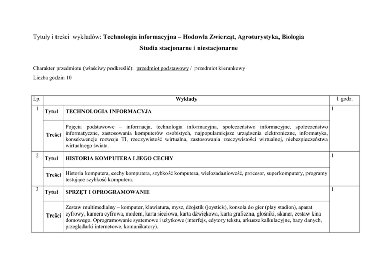 Tytuły i treści wykładów: Technologia informacyjna – Hodowla Zwierząt, Agroturystyka, Biologia Studia stacjonarne i niestacjonarne Charakter przedmiotu (właściwy podkreślić): przedmiot podstawowy / przedmiot kierunkowy Liczba godzin 10 Wykłady Lp. 1 Tytuł TECHNOLOGIA INFORMACYJA l. godz. 1 Pojęcia podstawowe – informacja, technologia informacyjna, społeczeństwo informacyjne, społeczeństwo Treści informatyczne, zastosowania komputerów osobistych, najpopularniejsze urządzenia elektroniczne, informatyka, konsekwencje rozwoju TI, rzeczywistość wirtualna, zastosowania rzeczywistości wirtualnej, niebezpieczeństwa wirtualnego świata. 2 Tytuł HISTORIA KOMPUTERA I JEGO CECHY 1 Treści Historia komputera, cechy komputera, szybkość komputera, wielozadaniowość, procesor, superkomputery, programy testujące szybkość komputera. 3 Tytuł SPRZĘT I OPROGRAMOWANIE Zestaw multimedialny – komputer, klawiatura, mysz, dżojstik (joystick), konsola do gier (play stadion), aparat Treści cyfrowy, kamera cyfrowa, modem, karta sieciowa, karta dźwiękowa, karta graficzna, głośniki, skaner, zestaw kina domowego. Oprogramowanie systemowe i użytkowe (interfejs, edytory tekstu, arkusze kalkulacyjne, bazy danych, przeglądarki internetowe, komunikatory). 1 4 5 Tytuł BUDOWA KOMPUTERA PC Treści CPU, RAM, ROM, Mother Board, I/O, HDD, inne nośniki informacji. Tytuł KODOWANIE INFORMACJI 1 1 Komunikacja – ujęcie informatyczne, rozwój sposobów komunikowania, sygnał, znak, telekomunikacja, Treści przedstawianie informacji w komputerze. Istota zapisu cyfrowego – znaki, barwy, położenia, – fotografia cyfrowa (CCD nobel z fizyki 2009). Jednostki pamięci. Formaty danych. Kompresja obrazu. Grafika rastrowa i wektorowa. Enigma. 6 7 Tytuł TELEFONIA KOMÓRKOWA. GPS Treści Telefonia komórkowa – Jak to działa? Nawigacja satelitarna – Jak to działa? Tytuł ALGORYTMY 1 1 Treści Zapis algorytmiczny – Co to jest? Zapis zadania w postaci algorytmu. Zapis prostych algorytmów za pomocą schematów blokowych – drzewa algorytmów. 8 Tytuł SIECI KOMPUTEROWE 1 Treści LAN, WAN, Intranet, Extranet, Internet (www). Modem, karta sieciowa, szybkość transferu, sposób przesyłu informacji w sieci www. 9 Tytuł USŁUGI SIECIOWE Treści Poczta elektroniczna, e-zakupy (sklepy, bilety), usługi bankowe, turystyczne, nauczanie na odległość, telewizja interaktywna. 1 10 Tytuł 1/3 BEZPIECZNE UŻYTKOWANIE SPRZETU KOMPUTEROWEGO Treści BHP, bezpieczeństwo w sieci – bezpieczeństwo systemów operacyjnych, danych, wirusy, robaki, kradzieże internetowe, (programy typu logger), wyłudzenia. 11 12 Tytuł WYBRANE ASPEKTY PRAWNE ZWIĄZANE Z UŻYTKOWNIEM KOMPUTERÓW Treści Prawo autorskie, ochrona danych osobowych, podpis elektroniczny. Tytuł ECDL – EUROPEAN COMPUTER DRIVING LICENCE Treści Omówienie modułów ECDL. Warunki uzyskania certyfikatu (licencji). Data: 25.09.2009 1/3 1/3 Podpis Kierownika przedmiotu