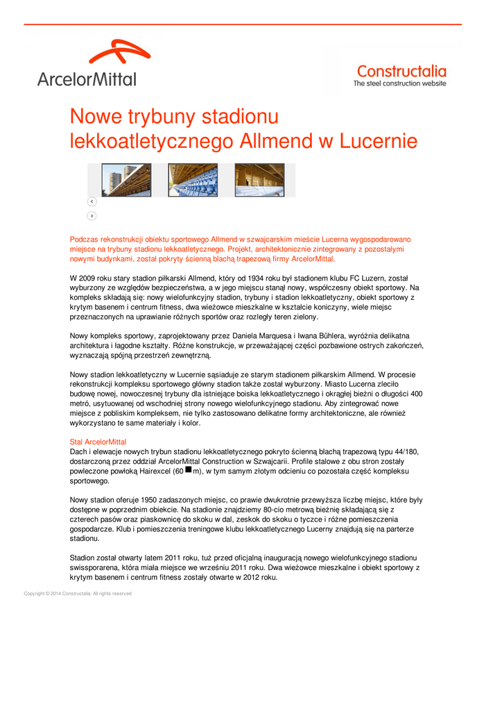 Nowe trybuny stadionu lekkoatletycznego Allmend w Lucernie Podczas rekonstrukcji obiektu sportowego Allmend w szwajcarskim mieście Lucerna wygospodarowano miejsce na trybuny stadionu lekkoatletycznego. Projekt, architektonicznie zintegrowany z pozostałymi nowymi budynkami, został pokryty ścienną blachą trapezową firmy ArcelorMittal. W 2009 roku stary stadion piłkarski Allmend, który od 1934 roku był stadionem klubu FC Luzern, został wyburzony ze względów bezpieczeństwa, a w jego miejscu stanął nowy, współczesny obiekt sportowy. Na kompleks składają się: nowy wielofunkcyjny stadion, trybuny i stadion lekkoatletyczny, obiekt sportowy z krytym basenem i centrum fitness, dwa wieżowce mieszkalne w kształcie koniczyny, wiele miejsc przeznaczonych na uprawianie różnych sportów oraz rozległy teren zielony. Nowy kompleks sportowy, zaprojektowany przez Daniela Marquesa i Iwana Bühlera, wyróżnia delikatna architektura i łagodne kształty. Różne konstrukcje, w przeważającej części pozbawione ostrych zakończeń, wyznaczają spójną przestrzeń zewnętrzną. Nowy stadion lekkoatletyczny w Lucernie sąsiaduje ze starym stadionem piłkarskim Allmend. W procesie rekonstrukcji kompleksu sportowego główny stadion także został wyburzony. Miasto Lucerna zleciło budowę nowej, nowoczesnej trybuny dla istniejące boiska lekkoatletycznego i okrągłej bieżni o długości 400 metró, usytuowanej od wschodniej strony nowego wielofunkcyjnego stadionu. Aby zintegrować nowe miejsce z pobliskim kompleksem, nie tylko zastosowano delikatne formy architektoniczne, ale również wykorzystano te same materiały i kolor. Stal ArcelorMittal Dach i elewacje nowych trybun stadionu lekkoatletycznego pokryto ścienną blachą trapezową typu 44/180, dostarczoną przez oddział ArcelorMittal Construction w Szwajcarii. Profile stalowe z obu stron zostały powleczone powłoką Hairexcel (60 m), w tym samym złotym odcieniu co pozostała część kompleksu sportowego. Nowy stadion oferuje 1950 zadaszonych miejsc, co prawie dwukrotnie przewyższa liczbę miejsc, które były dostępne w poprzednim obiekcie. Na stadionie znajdziemy 80-cio metrową bieżnię składającą się z czterech pasów oraz piaskownicę do skoku w dal, zeskok do skoku o tyczce i różne pomieszczenia gospodarcze. Klub i pomieszczenia treningowe klubu lekkoatletycznego Lucerny znajdują się na parterze stadionu. Stadion został otwarty latem 2011 roku, tuż przed oficjalną inauguracją nowego wielofunkcyjnego stadionu swissporarena, która miała miejsce we wrześniu 2011 roku. Dwa wieżowce mieszkalne i obiekt sportowy z krytym basenem i centrum fitness zostały otwarte w 2012 roku. Copyright © 2014 Constructalia. All rights reserved