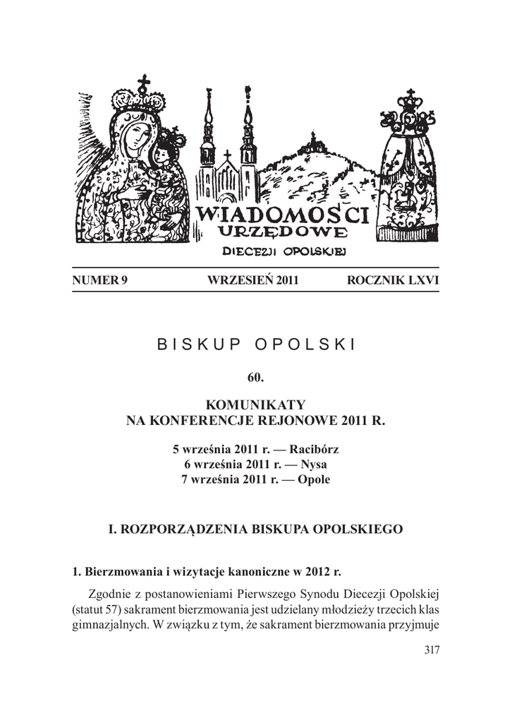 Numer 9 wrzesień 2011 Rocznik LXVI Biskup Opolski 60. Komunikaty na Konferencje Rejonowe 2011 r. 5 września 2011 r. — Racibórz 6 września 2011 r. — Nysa 7 września 2011 r. — Opole I. Rozporządzenia Biskupa Opolskiego 1. Bierzmowania i wizytacje kanoniczne w 2012 r. Zgodnie z postanowieniami Pierwszego Synodu Diecezji Opolskiej (statut 57) sakrament bierzmowania jest udzielany młodzieży trzecich klas gimnazjalnych. W związku z tym, że sakrament bierzmowania przyjmuje 317 młodzież wszystkich parafii, jest oczywistą sprawą, że udzielanie sakramentu bierzmowania musi się dokonywać w jednej lub kilku większych grupach na terenie dekanatu. Wizytacje kanoniczne (biskupie) w 2012 roku odbędą się w dekanatach: Kędzierzyn, Koźle, Leśnica, Nysa, Ozimek, Paczków. Księży dziekanów prosimy, podobnie jak w ubiegłych latach, o złożenie kwestionariuszy wizytacyjnych ze wszystkich parafii dekanatu biskupowi wizytującemu lub w kurii z miesięcznym wyprzedzeniem. Bardzo prosimy o wypełnienie nowych kwestionariuszy, które będą opublikowane w listopadzie br. Sposób przeprowadzenia wizytacji kancelarii parafialnej, świątyni oraz budynków kościelnych omówi ksiądz dziekan z biskupem wizytującym oraz wskazanymi przez biskupa jego delegatami, którzy odbędą spotkania z proboszczem wizytowanej parafii z kilku- lub kilkunastodniowym wyprzedzeniem. Przypomina się jednocześnie, że oficjalne powitanie biskupa w parafii ma miejsce tylko podczas wizytacji kanonicznej, natomiast w innych okolicznościach ma ono charakter zwyczajny, tj. przy okazji krótkiego wprowadzenia na początku Mszy św. Terminy bierzmowania i wizytacji biskupich księża dziekani powinni uzgodnić z biskupem Pawłem Stobrawą do końca listopada 2011 r. Prosimy o zachowanie tego terminu, by możliwie szybko można było poinformować, który biskup będzie na wizytacji i bierzmowaniu. Wizytacje dziekańskie odbędą się w dekanatach: Biała, Branice, Gościęcin, Grodków, Kietrz, Niemodlin, Otmuchów, Pietrowice Wielkie, Prószków, Prudnik, Siołkowice, Skoroszyce. 2. Instrukcja biskupa opolskiego o przygotowaniu i celebracji sakramentu bierzmowania w diecezji opolskiej Wprowadzenie Poprzez przyjęcie sakramentu bierzmowania ochrzczeni „jeszcze ściślej wiążą się z Kościołem, otrzymują szczególną moc Ducha Świętego i w ten sposób jeszcze mocniej zobowiązani są, jako prawdziwi świadkowie Chrystusa, do szerzenia wiary słowem i uczynkiem oraz do bro318 nienia jej” (Lumen gentium, 11). Chociaż sakrament chrztu jest ważny i skuteczny bez bierzmowania i Eucharystii, to jednak wtajemniczenie chrześcijańskie pozostaje jakby nie dopełnione (por. KKK 1306). Dlatego każdy ochrzczony może i powinien otrzymać sakrament bierzmowania (por. kan. 889 § 1 i 890 KPK). § 1. Przygotowanie młodzieży do sakramentu bierzmowania Parafia przygotowania 1. Miejscem właściwym przygotowania do przyjęcia sakramentu bierzmowania jest parafia, do której kandydat przynależy. W uzasadnionych przypadkach kandydat do bierzmowania może podjąć przygotowanie także poza własną parafią. Duszpasterz podejmujący się przygotowania kandydata jest zobowiązany powiadomić o tym fakcie jego własnego proboszcza. Miejscem przyjęcia sakramentu bierzmowania będzie parafia, w której miało miejsce przygotowanie. Kandydat, przygotowany poza własną parafią, a pragnący przyjąć sakrament bierzmowania we własnej parafii, musi własnemu proboszczowi przedstawić zaświadczenie o odbyciu przygotowania. Podmioty odpowiedzialne za przygotowanie do bierzmowania 2. Odpowiedzialność za przygotowanie i dopuszczenie kandydatów do przyjęcia sakramentu bierzmowania spoczywa na duszpasterzach i ich współpracownikach. Pierwszymi współpracownikami duszpasterzy w przygotowaniu kandydatów do bierzmowania są rodzice. Duszpasterze powinni ich zaprosić do udziału we wspólnych celebracjach i katechezach; powinni też informować rodziców o przebiegu przygotowania, zwłaszcza w sytuacjach trudnych. Współpracownikami duszpasterzy i rodziców w przygotowaniu kandydatów do bierzmowania są również szkolni katecheci. Z inicjatywy i z udziałem proboszcza powinny odbywać się regularne spotkania duszpasterzy i katechetów. Formy współpracy i zakres podejmowanych działań należy uzgodnić w drodze wzajemnego porozumienia. Do współpracy w przygotowaniu do bierzmowania można też zaprosić uformowanych wiernych świeckich, którzy podejmą funkcje animatorów małych grup. Formacja animatorów pastoralnych, zaangażowanych 319 w przygotowanie kandydatów do bierzmowania, odbywać się będzie w rejonowych centrach katechumenatu. 3. Zgodnie z zaleceniami Komisji Wychowania Katolickiego KEP, przygotowanie kandydatów do bierzmowania powinno trwać 3 lata. Przygotowanie kandydatów należy zatem rozpocząć w I klasie gimnazjum. W całym okresie przygotowania zaleca się spotkania formacyjne w małych grupach, połączone niekiedy ze wspólną celebracją liturgiczną. W pierwszym i drugim roku przygotowania formacja kandydatów odbywa się w rytmie spotkań miesięcznych, natomiast w trzecim roku przygotowania – spotkań cotygodniowych. Rozpoczęcie i kontynuowanie przygotowania do bierzmowania 4. Warunkiem rozpoczęcia przygotowania do bierzmowania jest osobiste zgłoszenie się kandydata w parafii przygotowania w ogłoszonym terminie, złożenie pisemnego uzasadnienia chęci przyjęcia bierzmowania oraz przedłożenie Indeksu nauki religii, potwierdzającego ukończenie katechizacji w zakresie szkoły podstawowej. Przygotowanie do bierzmowania może rozpocząć także kandydat, który nie ukończył katechizacji w zakresie szkoły podstawowej. Duszpasterz ma obowiązek zbadać okoliczności i powody niedopełnienia obowiązku udziału w katechezie. Jeśli uzna potrzebę uzupełnienia wiedzy katechizmowej kandydata, zorganizuje dla niego we współpracy ze szkolnym katechetą kurs katechumena