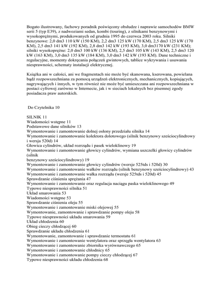 Bogato ilustrowany, fachowy poradnik poświęcony obsłudze i naprawie samochodów BMW serii 5 (typ E39), z nadwoziami sedan, kombi (touring), z silnikami benzynowymi i wysokoprężnymi, produkowanych od grudnia 1995 do czerwca 2003 roku. Silniki benzynowe: 2,0 dm3 110 kW (150 KM), 2,2 dm3 125 kW (170 KM), 2,5 dm3 125 kW (170 KM), 2,5 dm3 141 kW (192 KM), 2,8 dm3 142 kW (193 KM), 3,0 dm3170 kW (231 KM); silniki wysokoprężne: 2,0 dm3 100 kW (136 KM), 2,5 dm3 105 kW (143 KM), 2,5 dm3 120 kW (163 KM), 3,0 dm3 135 kW (184 KM), 3,0 dm3 142 kW (193 KM). Dane techniczne i regulacyjne, momenty dokręcania połączeń gwintowych, tablice wykrywania i usuwania niesprawności, schematy instalacji elektrycznej. Książka ani w całości, ani we fragmentach nie może być skanowana, kserowana, powielana bądź rozpowszechniana za pomocą urządzeń elektronicznych, mechanicznych, kopiujących, nagrywających i innych, w tym również nie może być umieszczana ani rozpowszechniana w postaci cyfrowej zarówno w Internecie, jak i w sieciach lokalnych bez pisemnej zgody posiadacza praw autorskich. Do Czytelnika 10 SILNIK 11 Wiadomości wstępne 11 Podstawowe dane silników 13 Wymontowanie i zamontowanie dolnej osłony przedziału silnika 14 Wymontowanie i zamontowanie kolektora dolotowego (silnik benzynowy sześciocylindrowy i wersja 520d) 14 Głowica cylindrów, układ rozrządu i pasek wieloklinowy 19 Wymontowanie i zamontowanie głowicy cylindrów, wymiana uszczelki głowicy cylindrów (silnik benzynowy sześciocylindrowy) 19 Wymontowanie i zamontowanie głowicy cylindrów (wersje 525tds i 520d) 30 Wymontowanie i zamontowanie wałków rozrządu (silnik benzynowy sześciocylindrowy) 43 Wymontowanie i zamontowanie wałka rozrządu (wersje 525tds i 520d) 45 Sprawdzanie ciśnienia sprężania 47 Wymontowanie i zamontowanie oraz regulacja naciągu paska wieloklinowego 49 Typowe niesprawności silnika 51 Układ smarowania 53 Wiadomości wstępne 53 Sprawdzanie ciśnienia oleju 55 Wymontowanie i zamontowanie miski olejowej 55 Wymontowanie, zamontowanie i sprawdzanie pompy oleju 58 Typowe niesprawności układu smarowania 59 Układ chłodzenia 60 Obieg cieczy chłodzącej 60 Sprawdzanie układu chłodzenia 61 Wymontowanie, zamontowanie i sprawdzanie termostatu 61 Wymontowanie i zamontowanie wentylatora oraz sprzęgła wentylatora 63 Wymontowanie i zamontowanie zbiornika wyrównawczego 65 Wymontowanie i zamontowanie chłodnicy 65 Wymontowanie i zamontowanie pompy cieczy chłodzącej 67 Typowe niesprawności układu chłodzenia 68 Układ zapłonowy, świece zapłonowe 69 Wiadomości wstępne 69 Wymontowanie, zamontowanie i sprawdzanie cewki zapłonowej 70 Wymontowanie i zamontowanie czujnika spalania stukowego 71 Sprawdzanie i wymiana czujnika indukcyjnego 72 Wymontowanie i zamontowanie nasadki świecy zapłonowej 74 Wymontowanie i zamontowanie sterownika układu zapłonowego i wtryskowego (DME) 74 Świece zapłonowe 76 Dane techniczne układu zapłonowego (DME) 76 Obwody doprowadzenia paliwa i powietrza 77 Wiadomości wstępne 77 Sprawdzanie przekaźnika pompy paliwa 78 Sprawdzanie wydajności pompy paliwa 79 Wymontowanie i zamontowanie pompy paliwa z czujnikiem poziomu paliwa 80 Wymontowanie i zamontowanie obudowy filtru powietrza oraz przepływomierza powietrza 82 Układ wtryskowy silnika benzynowego 83 Wiadomości wstępne 83 Sposób działania układu wtrysku benzyny 85 Sprawdzanie systemu sterowania wtryskiem benzyny i zapłonem 86 Regulacja linki przepustnicy 86 Wymontowanie i zamontowanie króćca zespołu przepustnicy 87 Sprawdzanie, wymontowanie i zamontowanie zaworu regulacyjnego biegu jałowego 88 Sprawdzanie, wymontowanie i zamontowanie czujnika temperatury 89 Sprawdzanie wtryskiwaczy 91 Wymontowanie i zamontowanie wtryskiwaczy 91 Typowe niesprawności układu wtrysku benzyny 93 Układ wtryskowy silnika wysokoprężnego 95 Wiadomości wstępne 95 Turbosprężarka 95 Obwód recyrkulacji spalin (układ EGR) 96 Urządzenie podgrzewające filtr paliwa 96 Układ podgrzewania silnika 96 Sprawdzanie, wymontowanie i zamontowanie świec żarowych (wersja 525tds) 97 Sprawdzanie świec żarowych (wersja 530d) 98 Wymontowanie i zamontowanie świec żarowych (wersja 530d) 99 Sprawdzanie, wymontowanie i zamontowanie przekaźnika świec żarowych (wersja 525 tds) 100 Odpowietrzanie obwodu doprowadzenia paliwa (wersja525tds) 101 Sprawdzanie, wymontowanie i zamontowanie elektromagnetycznego zaworu odcinającego dopływ paliwa (wersja525tds) 102 Wymontowanie i zamontowanie wtryskiwaczy (wersja 525tds) 103 Sprawdzanie i regulacja początku tłoczenia pompy wtryskowej 104 Wymontowanie i zamontowanie kolektora dolotowego 106 Dane techniczne układu nagrzewania i obwodu doprowadzenia paliwa (wersja 525 tds) 107 Typowe niesprawności układu wtryskowego silnika wysokoprężnego (wersja 525 tds) 108 Układ wylotowy 109 Działanie katalizatora spalin 109 Użytkowanie samochodu z katalizatorem 111 Wymontowanie i zamontowanie układu wylotowego 112 Wymiana tłumika tylnego 113 Wymontowanie i zamontowanie sondy lambda 114 Sprawdzanie szczelności układu wylotowego 115 SPRZĘGŁO 116 Wiadomości wstępne 116 Wymontowanie, zamontowanie i sprawdzanie sprzęgła 116 Odpowietrzanie urządzenia sterującego sprzęgłem 119 Wymontowanie i zamontowanie łożyska wyciskowego 120 Wymontowanie i zamontowanie siłownika sterowania sprzęgła 121 Typowe niesprawności sprzęgła 122 SKRZYNKA BIEGÓW i MECHANIZM ZMIANY BIEGÓW 124 Wymontowanie i zamontowanie skrzynki biegów 124 Wymontowanie i zamontowanie wału napędowego 129 Wymontowanie i zamontowanie dźwigni zmiany biegów 131 Automatyczna skrzynka biegów 132 Regulacja linki dźwigni wyboru biegów 133 Sprawdzanie poziomu oleju i wymiana oleju w automatycznej skrzynce biegów 134 ZAWIESZENIE PRZEDNIE 135 Wiadomości wstępne 135 Elektroniczna regulacja siły tłumienia amortyzatorów 136 Wymontowanie i zamontowanie kolumny zawieszenia 136 Rozkładanie kolumny zawieszenia, wymont