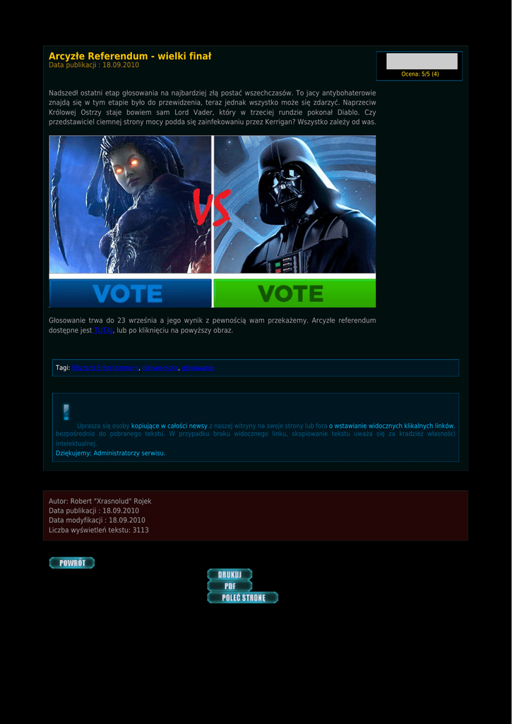 Arcyzłe Referendum - wielki finał Data publikacji : 18.09.2010 Ocena: 5/5 (4) Nadszedł ostatni etap głosowania na najbardziej złą postać wszechczasów. To jacy antybohaterowie znajdą się w tym etapie było do przewidzenia, teraz jednak wszystko może się zdarzyć. Naprzeciw Królowej Ostrzy staje bowiem sam Lord Vader, który w trzeciej rundzie pokonał Diablo. Czy przedstawiciel ciemnej strony mocy podda się zainfekowaniu przez Kerrigan? Wszystko zależy od was. Głosowanie trwa do 23 września a jego wynik z pewnością wam przekażemy. Arcyzłe referendum dostępne jest TUTAJ, lub po kliknięciu na powyższy obraz. Tagi: Blizzard Entertainment, ciekawostka, głosowanie Uprasza się osoby kopiujące w całości newsy z naszej witryny na swoje strony lub fora o wstawianie widocznych klikalnych linków, bezpośrednio do pobranego tekstu. W przypadku braku widocznego linku, skopiowanie tekstu uważa się za kradzież własności intelektualnej. Dziękujemy: Administratorzy serwisu. Autor: Robert "Xrasnolud" Rojek Data publikacji : 18.09.2010 Data modyfikacji : 18.09.2010 Liczba wyświetleń tekstu: 3113 Komentarz (11) dodaj komentarz Infested Lord Vader - to by było coś :D~xrasnolud Battlenet Network 2010/09/18 09:35 for the swarm :D~Mickey 2010/09/18 09:35 Kerrigan z marszu wygrywa~Katan 2010/09/18 09:47 Kto wygra? Laska zainfekowana przez obcą, drapieżną rasę i przemieniona w bezlitosną, zawziętą morderczynię czy stary facet przebrany w plastikowy kostium? Widać od razu ;D Z resztą teraz Kerri prowadzi 67% - 33% z Vaderem. Joker miał większe poparcie ;D~Garn 2010/09/18 10:02 Pozostało jeszcze 5 dni do końca głosowania, wiele może się wydarzyć. Dalej Kerrigan !~hellknight 2010/09/18 10:33 Nic dziwnego, że Kerri ma pzrewagę, pomijając już Wasz serwis nawet Husky się zaangażował :P Vader nie ma szans :P http://www.youtube.com/watch?v=PhfAZg12NOA&feature=sub~Reiz3N 2010/09/18 11:24 nie wiem co Vader robi w tym rankingu -_to nawet nie jest "zła" postać ! to się dopiero nazywa "Medialna Ofensywa" na biednego Anakina. powinien wygrać co najwyżej w rankingu tragiczny romantycznym ;) a tutaj zabrakło Imperatora Palpatine :P~VeR 2010/09/18 12:36 A ja nie rozumiem jak SHODAN mogła odpaść z rankingu tak szybko. Kerrigan i Vader razem wzięci nie dorastają jej nawet do... złącz...~Guderheinz 2010/09/18 13:36 Guderheinz ja także ubolewam nad SHODAN. Widocznie była zbyt wielką konkurencją i musieli się jej pozbyć:)~Adu 2010/09/18 23:03 a mi tu brakuje mengska... w końcu nasłał cały rój na niewinnych cywili i wybił przy pomocy zergów jakieś 10 16 miliardów ludzi ?~konrad1425 2010/09/19 10:02 Kerrigan rządzi!!! Ten Vader ma o połowę mniej głosów :).~morek1985 2010/09/20 00:37 dodaj komentarz 08.10.2015 Kampania "Szepty o zagładzie" dostępna za darmo (0 komentarzy) 27.09.2015 Kolejni bohaterowie w trybie Sprzymierzonych Dowódców (0 komentarzy) 22.09.2015 Cyfrowe gadżety za udział w BlizzCon 2015 (0 komentarzy) 15.07.2015 Legacy of the Void dostępne w przedsprzedaży! (0 komentarzy) 17.06.2015 Informacje z E3 - prolog kampanii Legacy of the Void (0 komentarzy) 30.05.2015 WCS Europe - sobota (30 maja) 18.00 grupa G - MaNa! (0 komentarzy) 07.05.2015 DreamHack Open France 2015 - już 8 maja - MaNa! (0 komentarzy) 03.05.2015 Na wesoło: postacie E-sportu 50 (0 komentarzy) 03.05.2015 IEM Katowice 2015 - jeszcze raz! (0 komentarzy) 03.05.2015 KeSPA Cup 2015 Season 1 - live! (0 komentarzy) 26.04.2015 Proleague - Top5 gier miesiąca (0 komentarzy) 26.04.2015 CJ Entus wygrywa 2 runde Proleague! (0 komentarzy) 18.04.2015 Wersja beta Legacy of the Void – aktualizacja 2.5.1 (0 komentarzy) 18.04.2015 WCS finals 2015 - galeria (0 komentarzy) 18.04.2015 Omówienie zmian w balansie Legacy of the Void (0 komentarzy) 11.04.2015 WCS Europe kwalifikacje z Polakami - dziś (sobota) 18.00 (0 komentarzy) 11.04.2015 Aktualizacja balansu Heart of the Swarm – 9 kwietnia (0 komentarzy) 11.04.2015 GSL Season1 2015 - galeria (0 komentarzy) 11.04.2015 Zbanowane konta w StarCraft II (0 komentarzy) 04.04.2015 Red Bull Battle Grounds powraca jesienią 2015 (0 komentarzy) (zobacz wszystkie)
