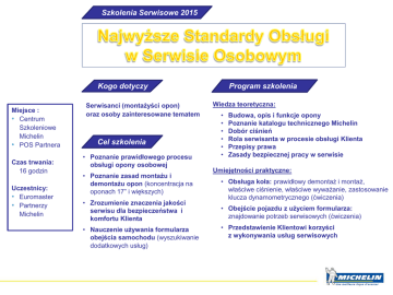Szkolenia Serwisowe 2015 Program szkolenia Kogo dotyczy Miejsce : • Centrum Szkoleniowe Michelin • POS Partnera Czas trwania: 16 godzin Uczestnicy: • Euromaster • Partnerzy Michelin Serwisanci (montażyści opon) oraz osoby zainteresowane tematem Cel szkolenia • Poznanie prawidłowego procesu obsługi opony osobowej • Poznanie zasad montażu i demontażu opon (koncentracja na oponach 17” i większych) • Zrozumienie znaczenia jakości serwisu dla bezpieczeństwa i komfortu Klienta • Nauczenie używania formularza obejścia samochodu (wyszukiwanie dodatkowych usług) Wiedza teoretyczna: • • • • • • Budowa, opis i funkcje opony Poznanie katalogu technicznego Michelin Dobór ciśnień Rola serwisanta w procesie obsługi Klienta Przepisy prawa Zasady bezpiecznej pracy w serwisie Umiejętności praktyczne: • Obsługa koła: prawidłowy demontaż i montaż, właściwe ciśnienie, właściwe wyważanie, zastosowanie klucza dynamometrycznego (ćwiczenia) • Obejście pojazdu z użyciem formularza: znajdowanie potrzeb serwisowych (ćwiczenia) • Przedstawienie Klientowi korzyści z wykonywania usług serwisowych