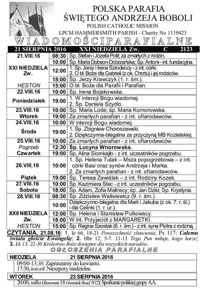 biuletyn 2016-08-21 - St. Andrew Bobola Polish RC Church in London
