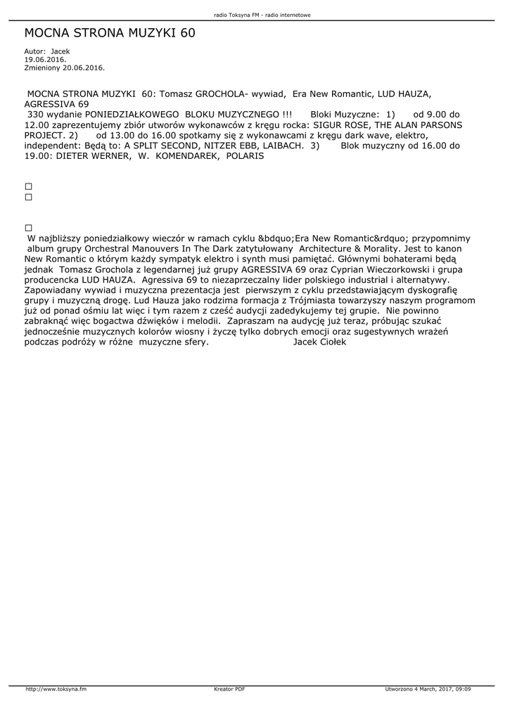 radio Toksyna FM - radio internetowe MOCNA STRONA MUZYKI 60 Autor: Jacek 19.06.2016. Zmieniony 20.06.2016. MOCNA STRONA MUZYKI 60: Tomasz GROCHOLA- wywiad, Era New Romantic, LUD HAUZA, AGRESSIVA 69 330 wydanie PONIEDZIAŁKOWEGO BLOKU MUZYCZNEGO !!! Bloki Muzyczne: 1) od 9.00 do 12.00 zaprezentujemy zbiór utworów wykonawców z kręgu rocka: SIGUR ROSE, THE ALAN PARSONS PROJECT. 2) od 13.00 do 16.00 spotkamy się z wykonawcami z kręgu dark wave, elektro, independent: Będą to: A SPLIT SECOND, NITZER EBB, LAIBACH. 3) Blok muzyczny od 16.00 do 19.00: DIETER WERNER, W. KOMENDAREK, POLARIS W najbliższy poniedziałkowy wieczór w ramach cyklu „Era New Romantic” przypomnimy album grupy Orchestral Manouvers In The Dark zatytułowany Architecture & Morality. Jest to kanon New Romantic o którym każdy sympatyk elektro i synth musi pamiętać. Głównymi bohaterami będą jednak Tomasz Grochola z legendarnej już grupy AGRESSIVA 69 oraz Cyprian Wieczorkowski i grupa producencka LUD HAUZA. Agressiva 69 to niezaprzeczalny lider polskiego industrial i alternatywy. Zapowiadany wywiad i muzyczna prezentacja jest pierwszym z cyklu przedstawiającym dyskografię grupy i muzyczną drogę. Lud Hauza jako rodzima formacja z Trójmiasta towarzyszy naszym programom już od ponad ośmiu lat więc i tym razem z cześć audycji zadedykujemy tej grupie. Nie powinno zabraknąć więc bogactwa dźwięków i melodii. Zapraszam na audycję już teraz, próbując szukać jednocześnie muzycznych kolorów wiosny i życzę tylko dobrych emocji oraz sugestywnych wrażeń podczas podróży w różne muzyczne sfery. Jacek Ciołek http://www.toksyna.fm Kreator PDF Utworzono 4 March, 2017, 09:09
