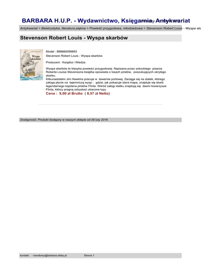 Utworzono Antykwariat : 04 marzec 2017 BARBARA H.U.P. - Wydawnictwo, Księgarnia, Antykwariat > Beletrystyka, literatura piękna > Powieść przygodowa, młodzieżowa > Stevenson Robert Louis - Wyspa ska Stevenson Robert Louis - Wyspa skarbów Model : 888880099893 Stevenson Robert Louis - Wyspa skarbów Producent : Książka i Wiedza Wyspa skarbów to klasyka powieści przygodowej. Napisana przez szkockiego pisarza Roberta Louisa Stevensona książka opowiada o losach piratów, poszukujących ukrytego skarbu. Kilkunastoletni Jim Hawkins pracuje w tawernie portowej. Zaciąga się na statek, którego załoga płynie na tajemniczą wysp� gdzie, jak pokazuje stara mapa, znajduje się skarb legendarnego kapitana piratów Flinta. Wśród załogi statku znajdują się dawni towarzysze Flinta, którzy pragną odzyskać utracone łupy. Cena : 9,00 zł Brutto ( 8,57 zł Netto) Dostępność: Produkt dostępny w naszym sklepie od 08 luty 2016 kontakt : - [email protected] Strona 1