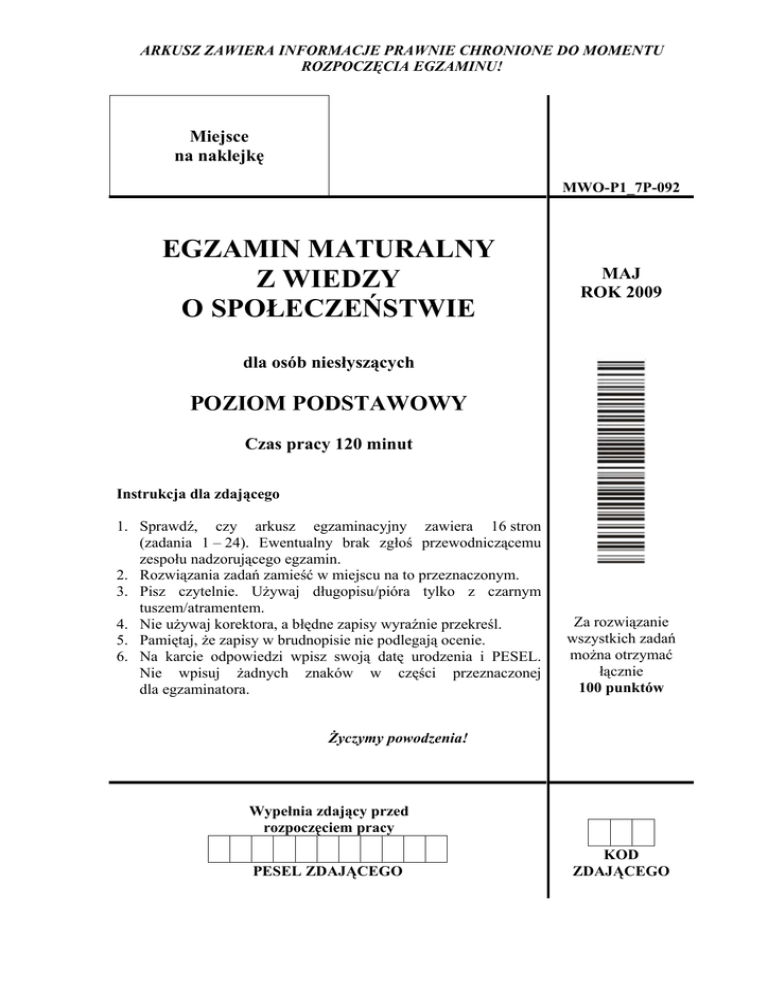 ARKUSZ ZAWIERA INFORMACJE PRAWNIE CHRONIONE DO MOMENTU ROZPOCZĘCIA EGZAMINU! Miejsce na naklejkę MWO-P1_7P-092 EGZAMIN MATURALNY Z WIEDZY O SPOŁECZEŃSTWIE MAJ ROK 2009 dla osób niesłyszących POZIOM PODSTAWOWY Czas pracy 120 minut Instrukcja dla zdającego 1. Sprawdź, czy arkusz egzaminacyjny zawiera 16 stron (zadania 1 – 24). Ewentualny brak zgłoś przewodniczącemu zespołu nadzorującego egzamin. 2. Rozwiązania zadań zamieść w miejscu na to przeznaczonym. 3. Pisz czytelnie. Używaj długopisu/pióra tylko z czarnym tuszem/atramentem. 4. Nie używaj korektora, a błędne zapisy wyraźnie przekreśl. 5. Pamiętaj, że zapisy w brudnopisie nie podlegają ocenie. 6. Na karcie odpowiedzi wpisz swoją datę urodzenia i PESEL. Nie wpisuj żadnych znaków w części przeznaczonej dla egzaminatora. Za rozwiązanie wszystkich zadań można otrzymać łącznie 100 punktów Życzymy powodzenia! Wypełnia zdający przed rozpoczęciem pracy PESEL ZDAJĄCEGO KOD ZDAJĄCEGO 2 Egzamin maturalny z wiedzy o społeczeństwie dla osób niesłyszących Poziom podstawowy W zadaniach 1 – 4 podkreśl jedną prawidłową odpowiedź. Zadanie 1. (1 pkt) W Polsce starosta stoi na czele A. rady gminy. B. sejmiku województwa. C. zarządu powiatu. D. zarządu województwa. Zadanie 2. (1 pkt) Spośród form demokracji bezpośredniej obecnie w Polsce występuje A. plebiscyt. B. referendum ogólnokrajowe. C. weto ludowe. D. zgromadzenie wszystkich obywateli. Zadanie 3. (1 pkt) Rada Gabinetowa w Polsce to A. pierwsze posiedzenie nowowybranego rządu. B. nadzwyczajne posiedzenie rządu po ustąpieniu1 Prezesa Rady Ministrów. C. posiedzenie rządu pod przewodnictwem Prezydenta Rzeczypospolitej. D. ostatnie posiedzenie ustępującej Rady Ministrów. Zadanie 4. (1 pkt) Według polskiego prawa ratyfikowanie2 umowy międzynarodowej jest uprawnieniem A. Prezydenta Rzeczypospolitej Polskiej. B. Sejmu Rzeczypospolitej Polskiej. C. Senatu Rzeczypospolitej Polskiej. D. Zgromadzenia Narodowego. Zadanie 5. (3 pkt) Wybierz i zaznacz trzy organizacje międzynarodowe, które istnieją obecnie. A. Organizacja Narodów Zjednoczonych (ONZ) B. Organizacja Bezpieczeństwa i Współpracy w Europie (OBWE) C. Organizacja Paktu Południowo – Wschodniej Azji (SEATO) D. Rada Wzajemnej Pomocy Gospodarczej (RWPG) E. Rada Europy (RE) 1 2 ustąpić – zrezygnować, zakończyć urzędowanie ratyfikowanie – zatwierdzenie, zgoda na umowę podpisaną przez rząd Egzamin maturalny z wiedzy o społeczeństwie dla osób niesłyszących Poziom podstawowy 3 Zadanie 6. (1 pkt) Z podanej poniżej definicji wybierz trzy elementy opisujące państwo. Państwo to typ wspólnoty politycznej obejmującej zespół norm politycznych oraz zbiorowość społeczną zajmującą określony obszar terytorialny i podporządkowany jednemu ośrodkowi suwerennej władzy politycznej. Źródło: Leksykon politologii, pod red. A. Antoszewskiego i R. Herberta, Wrocław, 2002. 1. ................................................................................................................................................... 2. ................................................................................................................................................... 3. ................................................................................................................................................... W zadaniach 7 – 8 zaznacz, które zdania są prawdziwe, a które fałszywe. Wpisz w wyznaczone miejsca tabeli Prawda (zdanie prawdziwe) lub Fałsz (zdanie fałszywe). Zadanie 7. (4 pkt) Zdania A. Społeczeństwo obywatelskie przeciwdziała3 nadużyciom4 władzy państwowej. B. W społeczeństwie obywatelskim tylko organizacje rządowe kierują działaniami obywateli. C. Członkowie społeczeństwa obywatelskiego korzystają z prawa do obywatelskiego nieposłuszeństwa. D. Członkowie społeczeństwa obywatelskiego przejawiają5 dużą aktywność społeczną. Prawda lub Fałsz Zadanie 8. (4 pkt) Zdania 3 A. W Polsce są samorządy terytorialne i zawodowe. B. Rzeczpospolita Polska jest państwem federacyjnym. C. Wszystkie władze wykonawcze samorządu terytorialnego pochodzą z wyborów pośrednich. D. Pieniądze na wykonywanie przez samorząd gminy zadań zleconych pochodzą z budżetu państwa. przeciwdziałanie – walka przeciwko nadużycie – np. łapówka 5 przejawiają – mają 4 Prawda lub Fałsz Egzamin maturalny z wiedzy o społeczeństwie dla osób niesłyszących Poziom podstawowy 4 W zadaniach 9 – 10 przyporządkuj opisom odpowiadające im nazwy. Wpisz w wyznaczone miejsca właściwe litery. Zadanie 9. (4 pkt) Funkcje prawa 1. 2. 3. 4. Wyznacza zasady działania organów władzy publicznej i organizacji społecznych – ....... . Określa, jakie zachowania są pozytywne (dobre), a jakie zakazane – ......... . Ułatwia społeczną kontrolę nad ludzkim zachowaniem – ......... . Wymierza6 kary za przestępstwa – ......... . A. Funkcja represyjna B. Funkcja wychowawcza C. Funkcja kontrolna D. Funkcja organizacyjna E. Funkcja ochronna Zadanie 10. (4 pkt) Fundacje w Polsce 1. 2. 3. 4. Fundacja zbiera pieniądze np. na zakup sprzętu medycznego dla szpitali – ....... . Fundacja mobilizuje7 obywateli do angażowania8 się w proces jednoczenia Europy – ....... . Fundacja pomaga ludziom na całym świecie, np. ofiarom wojen – ....... . Fundacja pomaga w rozwoju młodych ludzi – ....... . A. Fundacja im. Stefana Batorego B. Polska Akcja Humanitarna C. Wielka Orkiestra Świątecznej Pomocy D. Polska Fundacja Dzieci i Młodzieży E. Polska Fundacja im. Roberta Schumana Zadanie 11. (4 pkt) Nazwij prawa lub wolności człowieka, które zostały naruszone9 w sytuacjach opisanych poniżej. Wpisz ich nazwy w odpowiednią kolumnę tabeli. Naruszone prawa lub wolności Sytuacja człowieka 6 A. Kontrolowanie korespondencji obywateli. B. Wymuszanie zeznań10 przez stosowanie tortur. C. Zakazywanie utworzenia stowarzyszenia, np. w ob