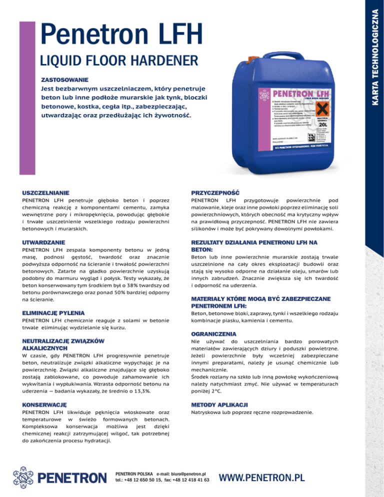 KARTA TECHNOLOGICZNA Penetron LFH LIQUID FLOOR HARDENER ZASTOSOWANIE Jest bezbarwnym uszczelniaczem, który penetruje beton lub inne podłoże murarskie jak tynk, bloczki betonowe, kostka, cegła itp., zabezpieczając, utwardzając oraz przedłużając ich żywotność. USZCZELNIANIE PRZYCZEPNOŚĆ PENETRON LFH penetruje głęboko beton i poprzez chemiczną reakcję z komponentami cementu, zamyka wewnętrzne pory i mikropęknięcia, powodując głębokie i trwałe uszczelnienie wszelkiego rodzaju powierzchni betonowych i murarskich. PENETRON LFH przygotowuje powierzchnie pod malowanie, kleje oraz inne powłoki poprzez eliminację soli powierzchniowych, których obecność ma krytyczny wpływ na prawidłową przyczepność. PENETRON LFH nie zawiera silikonów i może być pokrywany dowolnymi powłokami. UTWARDZANIE REZULTATY DZIAŁANIA PENETRONU LFH NA BETON: PENETRON LFH zespala komponenty betonu w jedną masę, podnosi gęstość, twardość oraz znacznie podwyższa odporność na ścieranie i trwałość powierzchni betonowych. Zatarte na gładko powierzchnie uzyskują podobny do marmuru wygląd i połysk. Testy wykazały, że beton konserwowany tym środkiem był o 38% twardszy od betonu porównawczego oraz ponad 50% bardziej odporny na ścieranie. ELIMINACJĘ PYLENIA PENETRON LFH chemicznie reaguje z solami w betonie trwale eliminując wydzielanie się kurzu. Beton lub inne powierzchnie murarskie zostają trwale uszczelnione na cały okres eksploatacji budowli oraz stają się wysoko odporne na działanie oleju, smarów lub innych zabrudzeń. Znacznie zwiększa się ich twardość i odporność na uderzenia. MATERIAŁY KTÓRE MOGĄ BYĆ ZABEZPIECZANE PENETRONEM LFH: Beton, betonowe bloki, zaprawy, tynki i wszelkiego rodzaju kombinacje piasku, kamienia i cementu. OGRANICZENIA NEUTRALIZACJĘ ZWIĄZKÓW ALKALICZNYCH W czasie, gdy PENETRON LFH progresywnie penetruje beton, neutralizuje związki alkaliczne wypychając je na powierzchnię. Związki alkaliczne znajdujące się głęboko zostają zablokowane, co powoduje zahamowanie ich wykwitania i wypłukiwania. Wzrasta odporność betonu na uderzenia — badania wykazały, że średnio o 13,3%. Nie używać do uszczelniania bardzo porowatych materiałów zawierających dziury i poduszki powietrzne. Jeżeli powierzchnie były wcześniej zabezpieczane innymi preparatami, należy je usunąć chemicznie lub mechanicznie. Środek rozlany na szkło lub inną powłokę wykończeniową należy natychmiast zmyć. Nie używać w temperaturach poniżej 2°C. KONSERWACJĘ METODY APLIKACJI PENETRON LFH likwiduje pęknięcia włoskowate oraz temperaturowe w świeżo formowanych betonach. Kompleksowa konserwacja możliwa jest dzięki chemicznej reakcji zatrzymującej wilgoć, tak potrzebnej do zakończenia procesu hydratacji. Natryskowa lub poprzez ręczne rozprowadzenie. PENETRON POLSKA e-mail: [email protected] tel.: +48 12 650 50 15, fax: +48 12 418 41 63 WWW.PENETRON.PL POTRZEBNE NARZĘDZIA OGRANICZENIA TEMPERATUROWE: Niskociśnieniowy aparat natryskowy, miękka szczotka szczecinowa, wąż wodny, odkurzacz. <57°C, >2°C. W niskich temperaturach całkowicie zabezpiecza nowo formowany beton przed zamarznięciem przez okres 6 dni. PRZYGOTOWANIE POWIERZCHNI Oczyścić powierzchnię w celu usunięcia kurzu, brudu i innych zanieczyszczeń. Jeżeli powierzchnia jest wilgotna lub mokra należy odczekać do chwili jej wyschnięcia, aby zapewnić prawidłowe działanie PENETRON LFH. APLIKACJA Etap 1. Nałożyć PENETRON LFH w momencie, gdy powierzchnia jest już wystarczająco twarda, aby po niej chodzić, a w przypadku nowo formowanych betonów przed rozpoczęciem procesu pękania włoskowatowego i temperaturowego. Utrzymać całą powierzchnię zwilżoną preparatem przez okres 30 minut. Etap 2. Gdy powierzchnia pokryta PENETRONem LFH zrobi się śliska, delikatnie zraszamy powierzchnię wodą. Spowoduje to ustąpienie tej śliskości. Etap 3. Po upływie około 30 minut przemyć dokładnie powierzchnię wodą. W celu usunięcia alkaliów i pozostałości PENETRON LFH należy dokładnie zebrać pozostały płyn, używając do tego gumowych ściągaczek i odkurzacza. Niewykonanie tych czynności spowoduje powstanie przebarwień na powierzchni. CZAS WYSYCHANIA: 1–3 godzin. Powierzchnia może być używana po zakończeniu aplikacji w chwili gdy jest sucha przy dotknięciu. Przy nowo formowanym betonie należy odczekać wymagany technologicznie czas do jego utwardzenia się. Malowanie lub pokrywanie innymi powłokami: Stare betony 3 do 7 dni od chwili aplikacji. Nowo formowane betony — pozwolić na 30 dniowe dojrzewanie betonu. CHROŃ PRZED DOSTĘPEM DZIECI. PRODUKTY PENETRONU SĄ NIETOKSYCZNE. DANE TECHNICZNE Przepuszczalność wodna: Przy 211 cm słupa wody, na powierzchni 31,2 cm2 stopień przepuszczalności wynosi 0,022 cm3 na godzinę. Zużycie: Około 0,2 l/m2. ROZPUSZCZALNIKI: Niepotrzebne. Narzędzia wystarczy umyć czystą wodą. OKRES DZIAŁANIA: Beton staje się twardszy i lepiej doszczelniony w miarę upływu czasu. Czas potrzebny do pełnej konserwacji, uszczelnienia i utwardzenia: 60–90 dni. W przeciwieństwie do zabezpieczeń powłokowych, które zużywają się w miarę upływu czasu, PENETRON LFH uszczelnia beton od wewnątrz poprzez trwałe zablokowanie porów, czyniąc beton samym w sobie odpornym na penetrację wody i nie podlega zużyciu powierzchniowemu. KOLOR: Bezbarwny. PENETRON LFH nie zmienia naturalnego wyglądu pokrywanych powierzchni. Tam, gdzie alkalia, wapno lub inne składniki poprzez działanie PENETRONu LFH są wypychane na powierzchnię, a naturalny wygląd musi być utrzymany, powierzchnie obficie spłukać wodą. PENETRON POLSKA e-mail: [email protected] tel.: +48 12 650 50 15, fax: +48 12 418 41 63 WWW.PENETRON.PL KARTA TECHNOLOGICZNA Penetron LFH (LIQUID FLOOR HARDENER)
