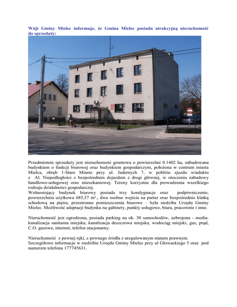 Wójt Gminy Mielec informuje, że Gmina Mielec posiada atrakcyjną nieruchomość do sprzedaży: Przedmiotem sprzedaży jest nieruchomość gruntowa o powierzchni 0.1402 ha, zabudowana budynkiem o funkcji biurowej oraz budynkiem gospodarczym, położona w centrum miasta Mielca, obręb 1-Stare Miasto przy ul. Jadernych 7, w pobliżu zjazdu wiaduktu z Al. Niepodległości z bezpośrednim dojazdem z drogi głównej, w otoczeniu zabudowy handlowo-usługowej oraz mieszkaniowej. Tereny korzystne dla prowadzenia wszelkiego rodzaju działalności gospodarczej. Wolnostojący budynek biurowy posiada trzy kondygnacje oraz podpiwniczenie, powierzchnia użytkowa 685,57 m²., dwa osobne wejścia na parter oraz bezpośrednio klatką schodową na piętra, przestronne pomieszczenia biurowe – była siedziba Urzędu Gminy Mielec. Możliwość adaptacji budynku na gabinety, punkty usługowe, biura, pracownie i inne. Nieruchomość jest ogrodzona, posiada parking na ok. 30 samochodów, uzbrojona - media: kanalizacja sanitarna miejska, kanalizacja deszczowa miejska, wodociąg miejski, gaz, prąd, C.O. gazowe, internet, telefon stacjonarny. Nieruchomość z pewnej ręki, z pewnego źródła z uregulowanym stanem prawnym. Szczegółowe informacje w siedzibie Urzędu Gminy Mielec przy ul Głowackiego 5 oraz pod numerem telefonu 177745631.