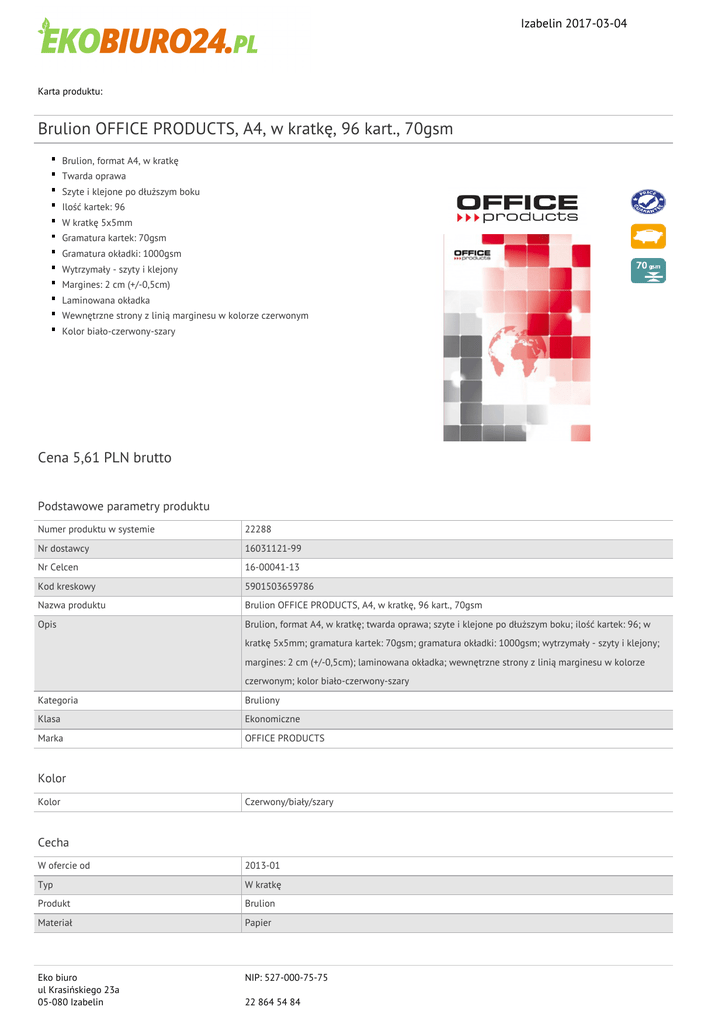 Izabelin 2017-03-04 Karta produktu: Brulion OFFICE PRODUCTS, A4, w kratkę, 96 kart., 70gsm Brulion, format A4, w kratkę Twarda oprawa Szyte i klejone po dłuższym boku Ilość kartek: 96 W kratkę 5x5mm Gramatura kartek: 70gsm Gramatura okładki: 1000gsm Wytrzymały - szyty i klejony Margines: 2 cm (+/-0,5cm) Laminowana okładka Wewnętrzne strony z linią marginesu w kolorze czerwonym Kolor biało-czerwony-szary Cena 5,61 PLN brutto Podstawowe parametry produktu Numer produktu w systemie 22288 Nr dostawcy 16031121-99 Nr Celcen 16-00041-13 Kod kreskowy 5901503659786 Nazwa produktu Brulion OFFICE PRODUCTS, A4, w kratkę, 96 kart., 70gsm Opis Brulion, format A4, w kratkę; twarda oprawa; szyte i klejone po dłuższym boku; ilość kartek: 96; w kratkę 5x5mm; gramatura kartek: 70gsm; gramatura okładki: 1000gsm; wytrzymały - szyty i klejony; margines: 2 cm (+/-0,5cm); laminowana okładka; wewnętrzne strony z linią marginesu w kolorze czerwonym; kolor biało-czerwony-szary Kategoria Bruliony Klasa Ekonomiczne Marka OFFICE PRODUCTS Kolor Kolor Czerwony/biały/szary Cecha W ofercie od 2013-01 Typ W kratkę Produkt Brulion Materiał Papier Eko biuro ul Krasińskiego 23a 05-080 Izabelin NIP: 527-000-75-75 22 864 54 84 Izabelin 2017-03-04 Karta katalogowa produktu cd. Brulion OFFICE PRODUCTS, A4, w kratkę, 96 kart., 70gsm Wymiary Format A4 Gramatura (g/m2) 70/1000 Wspólny słownik zamówień CPV 30197210-1 Skoroszyty kołowe Certyfikaty Hit Hit Nowy produkt w ofercie Standard Ilość Ilość kartek 96 Serdecznie zapraszamy do współpracy Eko biuro zespół. Eko biuro ul Krasińskiego 23a 05-080 Izabelin NIP: 527-000-75-75 22 864 54 84