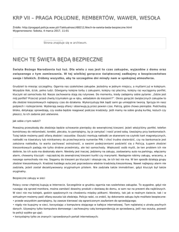 KRP VII – PRAGA POŁUDNIE, REMBERTÓW, WAWER, WESOŁA Źródło: http://pragapd.policja.waw.pl/r7/aktualnosci/68212,Niech-te-swieta-beda-bezpieczne.html Wygenerowano: Sobota, 4 marca 2017, 11:01 Strona znajduje się w archiwum. NIECH TE ŚWIĘTA BĘDĄ BEZPIECZNE Święta Bożego Narodzenia tuż tuż. Dla wielu z nas jest to czas zakupów, wyjazdów z domu oraz związanego z tym zamieszania. W tej wielkiej gorączce świątecznej zadbajmy o bezpieczeństwo swoje i bliskich. Zróbmy wszystko, aby te szczególne dni minęły nam w spokojnej atmosferze. Grudzień to miesiąc szczególny. Ogarnia nas szaleństwo zakupów. Jesteśmy w jednym miejscu, a myślami już w kolejnym. Wszędzie tłok, ścisk, pełno ludzi. Dźwigamy kolejne torby z zakupami, kolejny raz płacimy, kolejny raz wyciągamy portfel, kluczyki od samochodu itd. Nasze zachowania stają się rutynowe. Do momentu, kiedy zadajemy sobie pytanie: „Gdzie jest mój portfel? Przecież przed chwilą trzymałem go w ręku, wkładałem do kieszeni!?”. Okres gorączki świątecznych zakupów to dla złodziei kieszonkowych najlepszy czas do działania. Wykorzystują tłok bądź sami go umiejętnie tworzą. Sprzyja im nasz pośpiech i rozkojarzenie. Wybierają swoją ofiarę i obserwują ją przez pewien czas. Patrzą, gdzie chowa pieniądze. Podchodzą blisko, dotykając sprawdzają, czy osoba będzie reagować podczas kradzieży. Jeśli mamy na sobie grubą kurtkę, kożuch czy płaszcz, to ich zadanie jest ułatwione. Jak sobie z tym radzić? Poważną przeszkodą dla złodzieja będzie schowanie pieniędzy do wewnętrznej kieszeni. Jeżeli włożyliśmy portfel, telefon komórkowy do reklamówki, torebki, plecaka, to pamiętajmy, by je zamykać i nosić przed sobą. Uważajmy przy bankomatach. Tutaj także możemy paść ofiarą złodziei i oszustów. Oszuści montują nakładki ze skanerami na czytniki kart magnetycznych, nakładki na klawiatury lub minikamery do przechwycenia numerów PIN. I choć trudno stwierdzić, czy na bankomacie jest założona nakładka, to warto zachować ostrożność, a swoimi podejrzeniami podzielić się z Policją. Łupem złodziei kieszonkowych padają nie tylko drobne przedmioty, ale też samochody. Większość osób myśli, że ten problem ich nie dotknie, bo ich auto ma doskonały alarm. Niestety jest inaczej. Jedziemy na zakupy, zostawiamy auto na parkingu, włączamy alarm, chowamy kluczyki - najczęściej do zewnętrznej kieszeni kurtki czy marynarki. Następnie robimy zakupy, wracamy, a naszego samochodu nie ma. Sięgamy do kieszeni po kluczyki i okazuje się, że ich też nie ma. W ten sposób działają grupy złodziei kieszonkowych. Kradzież każdego auta jest poprzedzona właśnie kradzieżą kieszonkową. Nawet najlepszy alarm nie zadziała, jeżeli został dezaktywowany oryginalnym pilotem. Nie zadziała także immobiliser, gdyż kluczyk był także oryginalny. Bezpieczne zakupy w sieci Polacy coraz chętniej kupują w Internecie. Szczególnie w grudniu ogarnia nas szaleństwo zakupów. To wygodne, gdyż nie ruszając się sprzed monitora, można zamówić dowolny produkt z dostawą do domu, w sam raz na prezent dla najbliższych. W sieci nie ma kolejek, godzin spędzonych na chodzeniu między półkami. Niestety, tak jak w realnym świecie, tak i w wirtualnym możemy paść ofiarą oszusta lub złodzieja. Policja radzi, co zrobić, by dokonanie zakupu było możliwie bezpieczne: • przede wszystkim pamiętajmy, by zawsze kierować się ograniczonym zaufaniem do sprzedającego; • nigdy nie kupujmy w sieci, korzystając z komputera stojącego w kafejce internetowej. Tam najłatwiej o utratę poufnych danych. Używajmy tylko komputera domowego i zachowujmy całą korespondencję ze sprzedawcą. Jeśli nas oszuka, pozwoli to policji szybko go ująć; • korzystajmy tylko ze znanych i sprawdzonych portali internetowych; • przed zakupem w wirtualnym sklepie zasięgnijmy opinii o nim i sprawdźmy jego rzetelność. Można to zrobić u znajomych lub na forach internetowych. Zwracajmy też uwagę, czy sklep podaje swój adres i numer telefonu. Wtedy, w razie jakichkolwiek wątpliwości, możemy tam zadzwonić; • przy płaceniu kartą kredytową zwracajmy uwagę, czy połączenie internetowe jest bezpieczne i czy przesyłane przez nas dane nie zostaną wykorzystane przez osoby nieuprawnione. Na dole strony powinien pojawić się symbol zamkniętej kłódki, a na końcu adresu – literki "https". Zazwyczaj można też zamówić towar z opcją płatności przy odbiorze; • gdy kupujemy na aukcji internetowej, przeczytajmy komentarze o sprzedającym. Brak komentarzy pozytywnych lub ich niewielka liczba powinny wzbudzić naszą szczególną czujność; • otrzymując ofertę e-mailem, nie korzystajmy z linków - na stronę sklepu wejdźmy wpisując adres w oknie przeglądarki, unikniemy w ten sposób stron podszywających się pod legalnie działające sklepy; • zamawiając sprzęt zapytajmy, czy sprzedawca dołącza oryginalne oprogramowanie na płytach i instrukcję obsługi; • kupując telefon komórkowy zapytajmy o ładowarkę i dowód zakupu, telefony kradzione sprzedawane są często bez ładowarki i dokumentacji; • jeśli, mimo zachowania zasad ostrożności, dostaniemy zamiast zamówionego produktu puste pudełko, natychmiast zadzwońmy na policję. Wtedy zapisana korespondencja i przesłana przez oszusta paczka będą stanowiły dowód przestępstwa. Włamywacze nie świętują Wiele osób ograniczy szaleństwo świątecznych zakupów jedynie do kupna prezentów. Wyjadą na święta do rodziny. Pamiętajmy wówczas o właściwym zabezpieczeniu mieszkania lub domu. Włamywacze nie świętują, wykorzystując kilkudniową nieobecność domowników. Idealnego zabezpieczenia nie ma, ale możemy ograniczyć ryzyko włamania do minimum. Dobre zamki to jedno, jednak nie spełniają one swej roli, jeżeli zamocowane zostaną do słabych drzwi. A zatem dobre drzwi wejściowe 