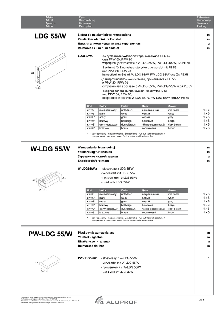 Artykuł Artikel Apтикyл Article Opis Beschreibung Название Description LDG 55/W 64 13,85 Pakowanie Verpackung Упаковка Packing Listwa dolna aluminiowa wzmocniona Verstärkter Aluminium Endstab Нижняя алюминиевая планка укрепленная Reinforced aluminum endslat LDG55/W/x - do systemu antywłamaniowego, stosowana z PE 55 oraz PPW 80, PPW 90 współpracuje w zestawie z W-LDG 55/W, PW-LDG 55/W, ZA PE 55 - Bestimmt für Einbruchschutzsystem, verwendet mit PE 55 und PPW 80, PPW 90 kompatibel im Set mit W-LDG 55/W, PW-LDG 55/W und ZA PE 55 - для противовзломной системы, применяется с PE 55 и PPW 80, PPW 90 сотрудничает в составе с W-LDG 55/W, PW-LDG 55/W и ZA PE 55 - designed for anti-burglar system, used with PE 55 and PPW 80, PPW 90, cooperetes in set with W-LDG 55/W, PW-LDG 55/W and ZA PE 55 Kod Kolor: Farbe: Цвет: Colour: x = 00 x = 02* x = 03* x = 05* x = 08* x = 09* nielakierowany biały szary beżowy ciemnobrązowy brązowy unlackiert weiß grau hellbeige dunkelbraun braun некрашенный белый серый бежевый тёмно-коричневый коричневый mill finish white grey beige dark brown brown m m м m 1x6 1x6 1x6 1x6 1x6 1x6 * - kolor specjalny - na zamówienie / Sonderfarbe - nur auf Sonderbestellung / специальный цвет - под заказ / extra colour - with extra order W-LDG 55/W Wzmocnienie listwy dolnej Verstärkung für Endstab Укрепление нижней планки Endslat reinforcement m m м m W-LDG55/W/x - stosowane z LDG 55/W 28,7 15,7 - verwendet mit LDG 55/W - применяется с LDG 55/W - used with LDG 55/W 34 Kod Kolor: Farbe: Цвет: Colour: x = 00 x = 02* x = 03* x = 05* x = 08* x = 09* nielakierowany biały szary beżowy ciemnobrązowy brązowy unlackiert weiß grau hellbeige dunkelbraun braun некрашенный белый серый бежевый тёмно-коричневый коричневый mill finish white grey beige dark brown brown 1x6 1x6 1x6 1x6 1x6 1x6 * - kolor specjalny - na zamówienie / Sonderfarbe - nur auf Sonderbestellung / специальный цвет - под заказ / extra colour - with extra order PW-LDG 55/W 10 30 Płaskownik wzmacniający Verstärkungsstab Штаба укрепительная Reinforced flat bar PW-LDG55/W - stosowany z W-LDG 55/W - verwendet mit W-LDG 55/W - применяется с W-LDG 55/W - used with W-LDG 55/W Zastrzegamy sobie prawo do zmian technicznych. Stan na dzień 2013.01.28 Technische Änderungen vorbehalten! Stand 2013.01.28 Оставляем за собой право до технических изменений. Состояние на день 2013.01.28 We reserve the right to any technical change. Valid on 2013.01.28 m m м m 1 X/1 Artykuł Artikel Apтикyл Article ZA PE 55 RY Opis Beschreibung Название Description Pakowanie Verpackung Упаковка Packing Zespół antywłamaniowy dla profilu PE 55 Einbruchschutzset für PE 55 Profil Противовзломный состав для профиля PE 55 Anti-burglary set for profile PE 55 ZAPE55/x - stosowane z LDG 55/W oraz W-LDG 55/W - verwendet mit LDG 55/W und W-LDG 55/W - применяется с LDG 55/W и W-LDG 55/W - used with LDG 55/W and W-LDG 55/W Kod Kolor: Farbe: Цвет: Colour: x = 20 czarny schwarz чёрный black 1 Zasuwka (rygiel) Riegel Задвижка - ригель Bolt RY - montaż w listwie dolnej LDG 40, LDG, LDG-E komplet zawiera: zasuwka (rygiel) - 1 szt. sprężyna płaska - 1 szt. wkręt (blokada zasuwki) - 1 szt. RA X/2 kpl. Satz компл. set - für Montage in den Endstäben LDG 40, LDG, LDG-E den Satz bilden: Riegel Plattenfeder Schraube mit Schlitz (Riegelsperre) - 1 St. - 1 St. - 1 St. - монтаж в нижней планке LDG 40, LDG, LDG-E в комплект входят: задвижка плоская пружина шуруп (блокада задвижки) - 1 шт - 1 шт - 1 шт - installed in LDG 40, LDG, LDG-E endslats the set includes: bolt spring screw - 1 pcs - 1 pcs - 1 pcs Rygiel automatyczny Automatischer Riegel Замок автоматический Automatic bolt RA - stosowany do listwy dolnej: LDG, LDG-E, LDG 52, LDG 52/OPT - für Endstäbe: LDG, LDG-E, LDG 52, LDG 52/OPT - применяется для нижней планки: LDG, LDG-E, LDG 52, LDG 52/OPT - used with: LDG, LDG-E, LDG 52, LDG 52/OPT endslats kpl. Satz компл. set 100 para Paar пар pair 25 Zastrzegamy sobie prawo do zmian technicznych. Stan na dzień 2013.01.28 Technische Änderungen vorbehalten! Stand 2013.01.28 Оставляем за собой право до технических изменений. Состояние на день 2013.01.28 We reserve the right to any technical change. Valid on 2013.01.28 Artykuł Artikel Apтикyл Article Opis Beschreibung Название Description ZM ANR Pakowanie Verpackung Упаковка Packing Zamek do ANR Schloss für NHK замок для АРУ Lock for MO NEW 25 Ø 16 Ø 20 22 PZMB ZMANR - komplet zawiera: zamek klucz do zamka nakrętkę mocującą - 1 szt. - 2 szt. - 1 szt. - den Satz bilden: Schloß Schlüssel Haltemutter - 1 St. - 2 St. - 1 St. - в комплект входят: замок ключ для замка предохр. гайка - 1 шт - 2 шт - 1 шт - the set includes: - 1 pcs - 2 pcs - 1 pcs lock keys screw top Płytka maskująca zamka baskwilowego ZMB Deckplatte für Zylinderschloß ZMB Пластина маскировочная к замку цилиндрическому ZMB Covering plate for cylinder lock ZMB 125 Ø 27,4 35 ZMB PZMB/x - komplet zawiera: płytkę maskującą wkręt montażowy zamka - 1 szt - 2 szt - den Satz bilden: Deckplatte Schrauben zur Schloßmontage - 1 St. - 2 St. - в комплект входят: пластина маскировочная шуруп монтажный для