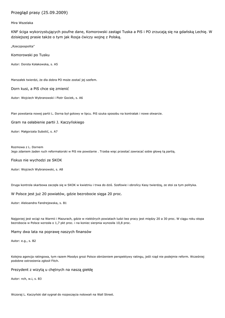 Przegląd prasy (25.09.2009) Mira Wszelaka KNF ściga wykorzystujących poufne dane, Komorowski zastąpi Tuska a PiS i PO zrzucają się na gdańską Lechię. W dzisiejszej prasie także o tym jak Rosja ćwiczy wojnę z Polską. „Rzeczpospolita” Komorowski po Tusku Autor: Dorota Kołakowska, s. A5 Marszałek twierdzi, że dla dobra PO może zostać jej szefem. Dorn kusi, a PiS chce się zmienić Autor: Wojciech Wybranowski i Piotr Gociek, s. A6 Plan powstania nowej partii L. Dorna był gotowy w lipcu. PiS szuka sposobu na kontratak i nowe otwarcie. Gram na osłabienie partii J. Kaczyńskiego Autor: Małgorzata Subotić, s. A7 Rozmowa z L. Dornem Jego zdaniem żaden ruch reformatorski w PiS nie powstanie . Trzeba więc przestać zawracać sobie głowę tą partią. Fiskus nie wychodzi ze SKOK Autor: Wojciech Wybranowski, s. A8 Druga kontrola skarbowa zaczęła się w SKOK w kwietniu i trwa do dziś. Szefowie i obrońcy Kasy twierdzą, ze stoi za tym polityka. W Polsce jest już 20 powiatów, gdzie bezrobocie sięga 20 proc. Autor: Aleksandra Fandrejewska, s. B1 Najgorzej jest wciąż na Warmii i Mazurach, gdzie w niektórych powiatach ludzi bez pracy jest między 20 a 30 proc. W ciągu roku stopa bezrobocia w Polsce wzrosła o 1,7 pkt proc. i na koniec sierpnia wynosiła 10,8 proc. Mamy dwa lata na poprawę naszych finansów Autor: e.g., s. B2 Kolejna agencja ratingowa, tym razem Moodys grozi Polsce obniżeniem perspektywy ratingu, jeśli rząd nie podejmie reform. Wcześniej podobne ostrzeżenia zgłosił Fitch. Prezydent z wizytą u chętnych na naszą giełdę Autor: nch, w.i, s. B3 Wczoraj L. Kaczyński dał sygnał do rozpoczęcia notowań na Wall Street. Współpraca w imię „Przyjaźni” Autor: Agnieszka Łakoma, s. B5 Polska spółka PERN i rosyjski potentat Transnieft będą się wzajemnie informować o stanie ropociągów i planach inwestycyjnych. W 2008 r. PERN przepompował polskim odcinkiem „Przyjaźni” 42 mln ton. „Gazeta Wyborcza” Tarcza Obamy zamiast tarczy Busha Autor: Paweł Wroński, s. 1 Stała baza oraz być może nie jedna, ale kilka wyrzutni antyrakiet – tak wyglądają nowe propozycje amerykańskie. Oferta amerykańska ma być skonkretyzowana w ciągu najbliższych dni. Zdaniem ekspertów obecność na stałe żołnierzy USA miała zwiększyć bezpieczeństwo Polski. – Dla nas najważniejsze nie są rakiety, ale obecność żołnierzy USA – twierdzi jeden z wysokich polskich dyplomatów. Zrzutka na Lechię Gdańsk za transparent o 17 września Autor: Maciej Sandecki i Dominik Uhlig, s. 5 PiS zaczął zbiórkę pieniędzy na karę za transparent jaki 17 września klub Gdańskiej Lechii wywiesili podczas meczu z napisem „17 września 1939 – IV rozbiór Polski” z domalowanym sierpem i młotem w znaku zakazu. Karę nałożyły władze piłkarskie. Do zbiórki dołączyła się PO. Sprawa Pazury: agent CBA udawał biznesmena Autor: Wojciech Czuchnowski, s. 9 Inwestor, który wręczył łapówkę Weronice Marczuk Pazurze był agentem CBA Kaczyński pogadał z Obamą Autor: Marcin Bosacki, s. 11 Rozmowy o tarczy, Bliskim Wschodzie i Kościuszce toczyły się podczas obiadu. OFE skończą w ETS Autor: Marcin Bojanowski, s. 26 Rząd nie zamierza ustąpić Brukseli, która domaga się zniesienia barier w inwestycjach zagranicznych OFE. Spór rozstrzygnie ETS. „Polska” Rosja ćwiczy wojnę z Polską Autor: Tomasz Pompowski i Agaton Koziński, s. 1 W Grodnie wybucha inspirowane przez Polaków powstanie. Przerażony prezydent Białorusi wzywa na pomoc rosyjską armię. Na zajęte przez Polaków miasto spadają tysiące komandosów. To scenariusz wielkich manewrów wielkich manewrów rosyjsko – białoruskich „Zapad 2009”. Armia ćwiczy też obronę Gazociągu Północnego. Partię Dorna czeka polityczny margines Autor: Anna Wojciechowska, s. 1 Adam Lipiński, wiceprezes PiS nie wróży partii Dorna znaczącego sukcesu w wyborach samorządowych. Sceptyczni są też przedstawiciele PO i niektórzy outsiderzy z PiS. Polacy zjedli 200 ton konserw sprzed 25 lat Autor: A. Zboińska i M. Stańczyk, s. 6 Stara wieprzowina i wołowina o wyglądzie trocin, które krakowska firma sprowadziła ze Szwecji do Polski trafiła do 12 firm produkujących gotowe dania. Miss Germany kontra szara eminencja Autor: Kazimierz Sikorski, s. 12 Mamuśka, jak nazywają kanclerz jest pewna niedzielnego zwycięstwa i pozostania na fotelu kanclerza. Frank – Walter Steinmeier chce powtórzyć sukces Schroedera. „Dziennik. Gazeta Prawna” Prywatyzacja pod napięciem Autor: Michał Majewski i Paweł Reszka, s. A1 Sprzedaż Enei budzi kontrowersje. Jej fiasko byłoby katastrofą dla rządu, który usiłuje załatać budżet. W przyszłym roku ZUS będzie musiał pożyczyć 4 mld zł Autor: Bartosz Marczuk, s. A1, B1 i B5 Fundusz Ubezpieczeń Społecznych, którym administruje ZUS, otrzyma w przyszłym roku rekordową dotację z budżetu – prawie 50 mld zł. Na koniec tego roku ZUS będzie zadłużony w bankach na 4,1 mld zł. Farfał: uznam orzeczenie sądu i od razu opuszczę gabinet w TVP Autor: Anna Nalewajk i Marcin Graczyk, s. A8 Wywiad z P. Farfałem Będzie kolejny offset wart setki milionów dolarów Autor: Dariusz Styczek, s. C1, C2 i C3 W najbliższych tygodniach MON podejmie decyzję w sprawie zakupu samolotów szkolno – bojowych. Będzie to jeden z największych kontraktów dla wojska, wart 500 – 800 mln USD. „Puls Biznesu” Coś drgnęło w partnerstwie Autor: Anna Pronińska, s. 2 Samorząd z prywatnym biznesem może zrealizować inwestycje warte okrągłe 7 mld zł. Czyżby nastąpił przełom? Niełatwo być prezesem Biotonu Autor: Agnieszka Berger, s. 4 Analitycy chwalą spółkę, ale pod powierzchnią jest niespokojnie. – Wielu chciałoby mojego odejścia – mówi prezes Janusz Guy. Ryszard Krauze, szef rady nadzorczej na razie stanął za nim murem. Lepiej poinformowani znów lepiej zarabiają Autor: Kamil Zatoński, s. 24 W tym roku KNF wy