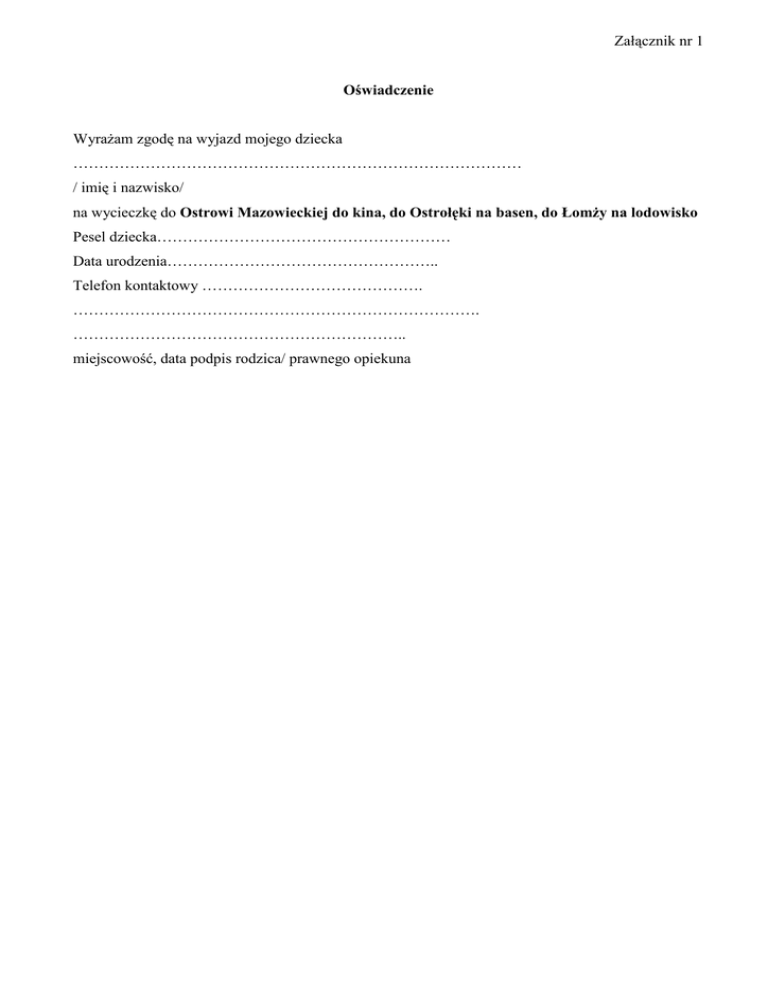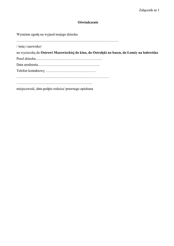 Załącznik nr 1 Oświadczenie Wyrażam zgodę na wyjazd mojego dziecka …………………………………………………………………………… / imię i nazwisko/ na wycieczkę do Ostrowi Mazowieckiej do kina, do Ostrołęki na basen, do Łomży na lodowisko Pesel dziecka………………………………………………… Data urodzenia…………………………………………….. Telefon kontaktowy ……………………………………. ……………………………………………………………………. ……………………………………………………….. miejscowość, data podpis rodzica/ prawnego opiekuna Załącznik nr 2 Oświadczenie rodziców /ferie dla dzieci z Gminy Wąsewo/ Oświadczam, że wyrażam zgodę na uczestnictwo mojego dziecka……………………………………………. w feriach zimowych. Biorę odpowiedzialność za bezpieczeństwo dziecka w czasie drogi do placówki i z powrotem. Data i miejsce urodzenia dziecka:………………………………………………………………………………………… Imiona rodziców:……………………………………………………………………………………… Adres zamieszkania:………………………………………………………………………………… Telefon kontaktowy…………………………………….. Pesel dziecka………………………………………………… ……………………………….……………… …………………………………… Miejscowość, data Podpis rodziców Szczegółowy plan zajęć: Zajęcia rozpoczynać się będą o godzinie 10:00, a kończyć o godzinie 14:00. I dzień – zajęcia sportowo-integracyjne, spotkanie profilaktyczno – edukacyjne z policjantami, warsztaty plastyczne, projekcje filmowe, II dzień - wyjazd na basen do Ostrołęki, III dzień – wyjazd do kina Ostrovia na film „Misiek w Nowym Jorku”, IV dzień – wyjazd na lodowisko, V dzień – zajęcia sportowo – rekreacyjne, turniej piłki nożnej, badmingtona, wyścigi rzędów, konkurs plastyczny. * Niepotrzebne skreślić Podczas zajęć i wycieczek dzieci mają zapewnioną opiekę przez pracowników zatrudnionych w Gminnym Centrum Sportu i Rekreacji w Wąsewie oraz Urzędzie Gminy Wąsewo oraz ZPO Wąsewo. …………………………………………. (data i podpis) Załącznik nr 3 REGULAMIN FERII ZIMOWYCH 2016 Opiekunowie na feriach dokładają wszelkich starań, by stworzyć dzieciom jak najlepsze warunki do wypoczynku, umożliwić im aktywne uczestnictwo w życiu grupy oraz zorganizować czas wolny w sposób przyjemny i pożyteczny. 1. Uczestnicy ferii przebywają pod opieką wychowawców w godzinach trwania zajęć podczas ferii. 2. Rodzice są odpowiedzialni za bezpieczną drogę dziecka do placówki i z powrotem. 3. W przypadku samodzielnego powrotu dziecka do domu rodzice są zobowiązani napisać oświadczenie. 4. Uczestnicy ferii mają prawo do: a) spokojnego wypoczynku b) uczestniczenia we wszystkich zajęciach i imprezach organizowanych podczas ferii c) korzystania ze wszystkich urządzeń, sprzętów niezbędnych do realizacji programu ferii d) wnoszenia próśb i skarg oraz propozycji zmian w programie ferii. 5. Uczestnicy mają obowiązek: a) bezwzględnie podporządkować się poleceniom wychowawców b) przestrzegać ramowego harmonogramu dnia c) brać udział w realizacji programu ferii d) zachować higienę osobistą, schludny wygląd i czystość e) szanować mienie, pomoce dydaktyczne. Za szkody wyrządzone przez dziecko materialnie odpowiedzialni są rodzice f) kulturalnie zachowywać się podczas pobytu w placówce g) przestrzegać zasad poruszania się po drogach h) mieć strój sportowy oraz obuwie zmienne sportowe. 6. Samowolne oddalenie się od opiekunów, brak dyscypliny, niewykonanie poleceń wychowawców, nieprzestrzeganie regulaminu będzie karane upomnieniem, naganą a w ostateczności wykluczeniem uczestnika z udziału w feriach. Z treścią powyższego regulaminu zapoznałem się, przyjmuję do wiadomości i akceptuję jego treść. Data………………………………….. Podpis rodzica…………………………… Podpis uczestnika ferii zimowych …………………………… Załącznik nr 4 REGULAMIN UCZESTNIKA PRAWA UCZESTNIKA 7. Uczestnik ferii ma prawo do: e) spokojnego wypoczynku f) uczestniczenia we wszystkich zajęciach i imprezach organizowanych podczas ferii g) korzystania ze wszystkich urządzeń, sprzętów niezbędnych do realizacji programu ferii h) wnoszenia próśb i skarg oraz propozycji zmian w programie ferii. OBOWIĄZKI UCZESTNIKA 1. Aktywnie uczestniczyć w życiu ferii, brać udział we wszystkich zajęciach przewidzianych w planie dnia. 2. W kontaktach z ludźmi, szczególnie z koleżankami i kolegami być uprzejmym i uczynnym. 3. Być dobrą koleżanką lub kolegą w zabawie i rozrywce, w czasie zajęć sportowych, opiekować się młodszymi, służyć im pomocą i radą. 4. Wykonywać skrupulatnie wszystkie polecenia wychowawców. 5. Przestrzegać zasad higieny osobistej, dbać o czystość, ład i porządek. 6. W czasie wycieczek i zajęć sportowych bezwzględnie podporządkować się poleceniom prowadzącego zajęcia. 7. Nie oddalać się poza obręb placówki bez zezwolenia wychowawcy. 8. Chronić dobro własne i cudze, dbać o jego jakość – ewentualne koszty uszkodzeń lub zniszczeń pokryć przed opuszczeniem placówki. 9. Na feriach dzieci zobowiązane są do chodzenia w parach, w swojej grupie u danego wychowawcy, posłuszeństwa oraz zachowania kultury osobistej. WYRÓŻNIENIA 1. Pochwała przez wychowawcę wobec grupy. 2. Pochwała przez wychowawcę wobec całej społeczności. 2. Dyplom uznania. 3. Nagroda rzeczowa. KARY 1. Upomnienie przez wychowawcę wobec grupy. 2. Nagana udzielona przez wychowawcę wobec całej społeczności. 3. Usunięcie z placówki ( w przypadkach koniec