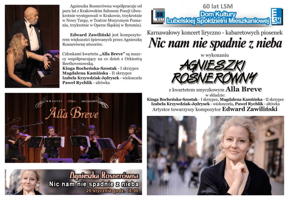 Agnieszka Rosnerówna współpracuje od paru lat z Krakowskim Salonem Poezji (dwu krotnie występowali w Krakowie, trzykrotnie w Nowy Targu, w Teatrze Muzycznym Pozna niu, trzykrotnie w Operze Sląskiej w Bytomiu). Edward Zawiliński jest kompozyto rem większości śpiewanych przez Agnieszkę Rosnerównę utworów. Członkami kwartetu „Alla Breve” są muzy cy współpracujący na co dzień z Orkiestrą Beethovenowską. Kinga BocheńskaSzostak I skrzypce Magdalena Kamińska II skrzypce Izabela KrzywdziakJędrysek wiolonczela Paweł Rychlik altówka Karnawałowy koncert liryczno kabaretowych piosenek Nic nam nie spadnie z nieba w wykonaniu z kwartetem smyczkowym Alla Breve w składzie: Kinga BocheńskaSzostak I skrzypce, Magdalena Kamińska II skrzypce Izabela KrzywdziakJędrysek wiolonczela, Paweł Rychlik altówka Artystce towarzyszy kompozytor Edward Zawiliński Agnieszka Rosnerówna wywodzi się z krakowskiego kabaretu Loch Camelot, jest laureatem nagrody publiczności na Ogólnopolskim Festiwalu Piosenki Kabaretowej O.B.O.R.A. w Poznaniu w 2005 r. Od 2009 r. prowadzi wraz z mężem, kompozytorem Edwardem Zawi lińskim, cykl spotkań litycznokabaretowych przy Czakramie w Piwnicy Go tyckiej Zamku Królewskiego w Niepołomicach. Spotkania te są polecane przez radio RMF Classic, które zamieszcza in formacje o nich na swojej stronie internetowej. By każde ze spotkań było nie powtarzalne, zapraszani są goście. Odwiedzili ich już m.in. Artur Andrus, An drzej Poniedzielski, Grzegorz Turnau, Grzegorz Halama, Marcin Daniec, Al dona Jankowska, Krzysztof Piasecki, Alosza Awdiejew, Andrzej Sikorowski, Magda Umer. Odbyło się już 68 spotkań. Karnawałowy koncert liryczno kabaretowych piosenek Nic nam nie spadnie z nieba w wykonaniu z kwartetem smyczkowym Alla Breve w składzie: Kinga BocheńskaSzostak I skrzypce, Magdalena Kamińska II skrzypce Izabela KrzywdziakJędrysek wiolonczela, Paweł Rychlik altówka Artystce towarzyszy kompozytor Edward Zawiliński Program kabaretowoliryczny Agnieszka Rosnerówna z powodzeniem wystawiła m.in.: w Teatrze Bagatela w Krakowie w ramach Małych Form Te atralnych,Teatrze Witkacego w Zakopanem, Teatrze Piosenki we Wrocławiu, Teatrze Atelier im. Agnieszki Osieckiej w Sopocie. Występowała również po za granicami kraju na zaproszenie środowisk polonijnych (dwukrotnie Bruk sela, czterokrotnie Wiedeń, Frankfurt nad Menem, Budapeszt, Tunis). W repertuarze m.in. piosenki Édith Piaf i Marleny Dietrich Koncert odbędzie się w piątek 20 stycznia 2017 r. o godz. 18.00 w sali widowiskowej Domu Kultury LSM w Lublinie, ul. K. Wallenroda 4a, tel. 81 743 48 29 www.domkulturylsm.pl B i le t 1 0 z ł
