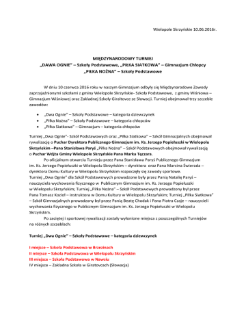 Wielopole Skrzyńskie 10.06.2016r. MIĘDZYNARODOWY TURNIEJ „DAWA OGNIE” – Szkoły Podstawowe, „PIŁKA SIATKOWA” – Gimnazjum Chłopcy „PIŁKA NOŻNA” – Szkoły Podstawowe W dniu 10 czerwca 2016 roku w naszym Gimnazjum odbyły się Międzynarodowe Zawody zaprzyjaźnionymi szkołami z gminy Wielopole Skrzyńskie- Szkoły Podstawowe, z gminy Wiśniowa – Gimnazjum Wiśniowej oraz Zakladnej Szkoły Giraltovce ze Słowacji. Turniej obejmował trzy szczeble zawodów: „Dwa Ognie” – Szkoły Podstawowe – kategoria dziewczynek „Piłka Nożna” – Szkoły Podstawowe – kategoria chłopców „Piłka Siatkowa” – Gimnazjum – kategoria chłopców Turniej „Dwa Ognie”- Szkół Podstawowych oraz „Piłka Siatkowa” – Szkół Gimnazjalnych obejmował rywalizację o Puchar Dyrektora Publicznego Gimnazjum im. Ks. Jerzego Popiełuszki w Wielopolu Skrzyńskim –Pana Stanisława Paryś „Piłka Nożna” – Szkół Podstawowych obejmował rywalizację o Puchar Wójta Gminy Wielopole Skrzyńskie Pana Marka Tęczara. Po oficjalnym otwarciu Turnieju przez Pana Stanisława Paryś Publicznego Gimnazjum im. Ks. Jerzego Popiełuszki w Wielopolu Skrzyńskim – dyrektora oraz Pana Marcina Świerada – dyrektora Domu Kultury w Wielopolu Skrzyńskim rozpoczęły się zawody sportowe. Turniej „Dwa Ognie” dla Szkół Podstawowych prowadzone były przez Panią Natalię Paryś – nauczyciela wychowania fizycznego w Publicznym Gimnazjum im. Ks. Jerzego Popiełuszki w Wielopolu Skrzyńskim; Turniej „Piłka Nożna” – Szkół Podstawowych prowadzony był przez Pana Tomasz Kozioł – instruktora w Domu Kultury w Wielopolu Skrzyńskim; Turniej „Piłka Siatkowa” – Szkół Gimnazjalnych prowadzony był przez Panią Beatę Chodak i Pana Piotra Czaje – nauczycieli wychowania fizycznego w Publicznym Gimnazjum im. Ks. Jerzego Popiełuszki w Wielopolu Skrzyńskim. Po zaciętej i sportowej rywalizacji zostały wyłonione miejsca z poszczególnych Turniejów na różnych szczeblach: Turniej „Dwa Ognie” – Szkoły Podstawowe – kategoria dziewczynek I miejsce – Szkoła Podstawowa w Brzezinach II miejsce – Szkoła Podstawowa w Wielopolu Skrzyńskim III miejsce – Szkoła Podstawowa w Nawsiu IV miejsce – Zakladna Szkoła w Giratovcach (Słowacja) Turniej „Piłka Nożna” – Szkoły Podstawowe – kategoria chłopców I miejsce – Zakladna Szkoła w Giraltovcach (Słowacja) II miejsce – Szkoła Podstawowa w Berdechów III miejsce – Szkoła Podstawowa w Brzezinach IV miejsce – Szkoła Podstawowa w Wielopolu Skrzyńskim V miejsce – Szkoła Podstawowa w Nawsiu Turniej „Piłka Siatkowa” – Szkół Gimnazjalnych – kategoria chłopców I miejsce – Gimnazjum Wiśniowej II miejsce - Publiczne Gimnazjum w Wielopolu Skrzyńskim (zespół 1) III miejsce - Publiczne Gimnazjum w Wielopolu Skrzyńskim (zespół 2) IV miejsce – Zakladna Szkoła w Giratovcach (Słowacja) Wręczone Puchary oraz dyplomy zostały przez Pana Stanisława Paryś – dyrektora Publicznego Gimnazjum im. Ks. Jerzego Popiełuszki w Wielopolu Skrzyńskiem oraz przez Pana Łukasza Dziok – zastępcę Wójta Gminy Wielopole Skrzyńskie. Opracowała: mgr Natalia Paryś nauczyciel wychowania fizycznego RELACJA FOTOGRAFICZNA