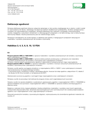 Habasit AG Power transmission and conveyor belts Römerstrasse 1 CH-4153 Reinach Tel. +41 61 715 15 15 Fax +41 61 715 15 55 www.habasit.com Deklaracja zgodności Niniejsza deklaracja zgodności dotyczy wyłącznie opisanego w niej wyrobu znajdującego się w stanie, w jakim został on wprowadzony do obrotu. Deklaracja nie obejmuje żadnych dodatkowych podzespołów, skutków postępowania z wyrobem czy wprowadzonych modyfikacji. Niniejsza deklaracja traci ważność w przypadku wykorzystywania wyrobu niezgodnie z warunkami określonymi w obowiązujących przepisach, o ile takie istnieją, oraz w dokumentacji technicznej Habasit. Wyrób przeznaczony jest do wielokrotnego użytku. Niniejszym oświadczamy że wyrób opisany w deklaracji jest zgodny z następującymi przepisami dotyczącymi materiałów i wyrobów przeznaczonych do kontaktu z żywnością. Habiblue 3, 4, 5, 6, 8, 10, 12 FDA EU Rozporządzenie (WE) nr 1935/2004 w sprawie materiałów i wyrobów przeznaczonych do kontaktu z żywnością wraz z późniejszymi zmianami. Rozporządzenie (WE) nr 2023/2006 w sprawie dobrej praktyki produkcyjnej w odniesieniu do materiałów i wyrobów przeznaczonych do kontaktu z żywnością wraz z późniejszymi zmianami. Niniejszy materiał został wyprodukowany zgodnie z odpowiednimi postanowieniami tego rozporządzenia. Rozporządzenie (WE) nr 10/2011 w sprawie materiałów i wyrobów z tworzyw sztucznych przeznaczonych do kontaktu z żywnością wraz z późniejszymi zmianami. Niniejszy wyrób spełnia wymagania określone w rozporządzeniu (WE) nr 10/2011 wraz z późniejszymi zmianami i jest przeznaczony do bezpośredniego kontaktu: - z żywnością suchą, uwodnioną, kwaśną i zawierającą alkohol, tłuszcze lub oleje zgodnie z załącznikiem III, tabela 2 - nie dłużej niż 30 minut kontaktu w temperaturze do 50°C Zastosowane surowce są zgodne z wymogami tego rozporządzenia wraz z późniejszymi zmianami. Niniejszy wyrób nie powoduje niemożliwej do przyjęcia zmiany cech organoleptycznych żywności. Opisany wyrób nie zawiera dodatków o podwójnym zastosowaniu zgodnie z rozporządzeniem (WE) nr 1333/2008 (w sprawie dodatków do żywności) i rozporządzeniem (WE) nr 1334/2008 (w sprawie środków aromatyzujących) w obecnej wersji. Badania w zakresie limitu migracji globalnej i lokalnej składników materiałów i wyrobów oraz innych ograniczeń (maksymalna dopuszczalna ilość, zawartość pierwszorzędowych amin aromatycznych itd.) zostały przeprowadzone zgodnie z tym rozporządzeniem wraz z jego późniejszymi zmianami. Stosunek powierzchni kontaktu z żywnością do objętości, wykorzystywany do stwierdzenia zgodności materiału lub wyrobu: 6 Deklaracja zgodności Habiblue 3, 4, 5, 6, 8, 10, 12 FDA 28.10.2016 1/2 Habasit AG Power transmission and conveyor belts Römerstrasse 1 CH-4153 Reinach Tel. +41 61 715 15 15 Fax +41 61 715 15 55 www.habasit.com Płyny modelowe imitujące żywność i warunki w badaniach migracji składników materiałów i wyrobów: - A (etanol 10%) 30 min w 50°C - B (kwas octowy 3%) 30 min w 50°C - D2 (olej roślinny) 30 min w 50°C USA FDA, 21 CFR parts/sections 177.2600 Rubber articles intended for repeated use, 178.2010 Antioxidants and/or stabilizers for polymers, 178.3297 Colorants for polymers. Niniejszy wyrób spełnia wymagania określone tym rozporządzeniem i jest przeznaczony do bezpośredniego kontaktu: - z żywnością uwodnioną, kwaśną i zawierającą tłuszcze/oleje zgodnie z 21 CFR 177.2600 (e) i (f), np. żywność typu I, II, III, IV-A, IV-B, V, VII-A, VII-B, IX - z żywnością zawierającą alkohol (< 8%="" alkoholu)="" zgodnie="" z 21 cfr="" 176.170(c),="" tabela="" 1,="" żywność="" typu=""> - z żywnością suchą (masa sucha z i bez warstwy wolnych tłuszczów/oleju na powierzchni) zgodnie z 21 CFR 176.170(c), tabela 1, żywność typu VIII, IX Warunki stosowania płynów modelowych E (napełnianie i przechowywanie w temperaturze pokojowej, brak obróbki cieplnej pojemnika) – G (mrożenie) zgodnie z 21 CFR 176.170(c), tabela 2 USDA AMS dairy - mleczarnie: Niniejsza taśma została sprawdzona przez dział kontroli projektów sprzętu i uznana za zgodną z wytycznymi „USDA Dairy Equipment Guidelines” (wytyczne USDA w zakresie wyposażenia mleczarni). Taśma jest zgodna również z normą sanitarną 3-A nr 20-xx „Multiple-Use Plastic Materials” (materiały z tworzyw sztucznych do wielokrotnego użytku). Producent produktu i podmiot wystawiający niniejszą deklarację zgodności: Habasit Italiana S.p.A. (Vittorio Veneto) Via A. Meucci 8 Zona Industriale I-31029 Vittorio Veneto/TV Italy Reference: Deklaracja zgodności Habiblue 3, 4, 5, 6, 8, 10, 12 FDA DS/PB 28.10.2016 2/2