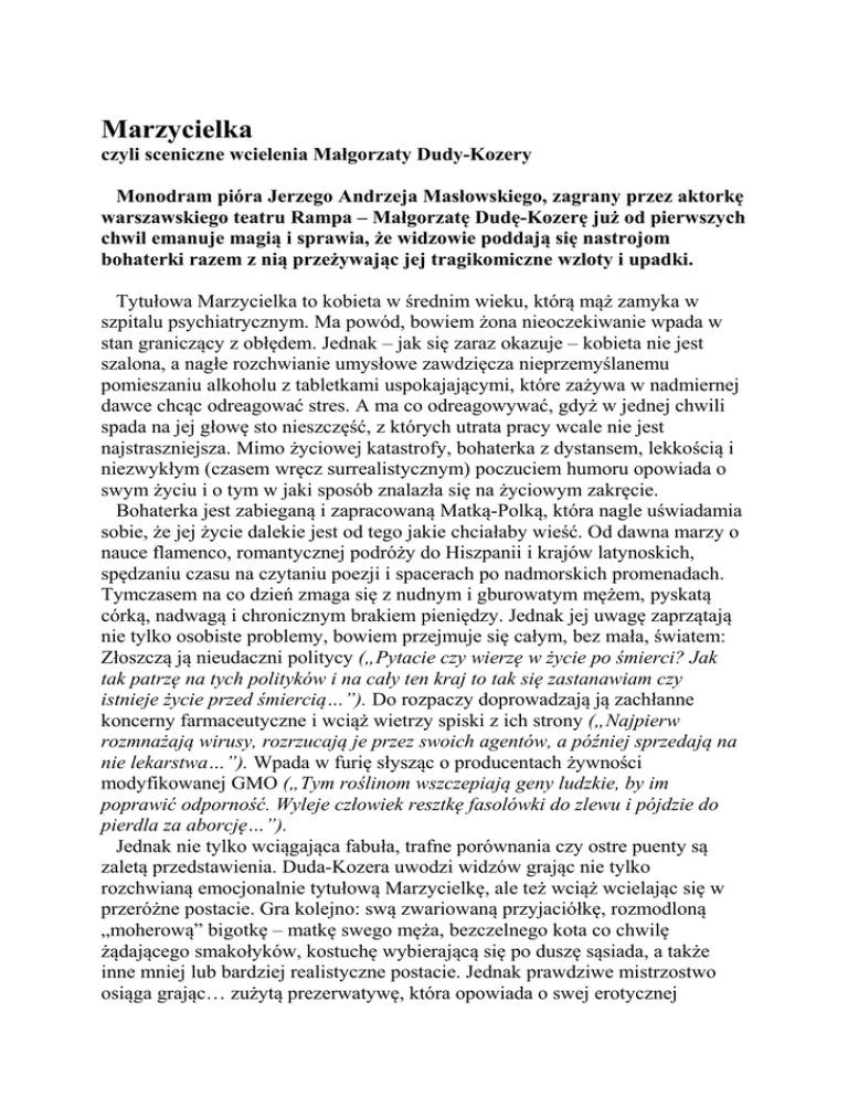 Marzycielka czyli sceniczne wcielenia Małgorzaty Dudy-Kozery Monodram pióra Jerzego Andrzeja Masłowskiego, zagrany przez aktorkę warszawskiego teatru Rampa – Małgorzatę Dudę-Kozerę już od pierwszych chwil emanuje magią i sprawia, że widzowie poddają się nastrojom bohaterki razem z nią przeżywając jej tragikomiczne wzloty i upadki. Tytułowa Marzycielka to kobieta w średnim wieku, którą mąż zamyka w szpitalu psychiatrycznym. Ma powód, bowiem żona nieoczekiwanie wpada w stan graniczący z obłędem. Jednak – jak się zaraz okazuje – kobieta nie jest szalona, a nagłe rozchwianie umysłowe zawdzięcza nieprzemyślanemu pomieszaniu alkoholu z tabletkami uspokajającymi, które zażywa w nadmiernej dawce chcąc odreagować stres. A ma co odreagowywać, gdyż w jednej chwili spada na jej głowę sto nieszczęść, z których utrata pracy wcale nie jest najstraszniejsza. Mimo życiowej katastrofy, bohaterka z dystansem, lekkością i niezwykłym (czasem wręcz surrealistycznym) poczuciem humoru opowiada o swym życiu i o tym w jaki sposób znalazła się na życiowym zakręcie. Bohaterka jest zabieganą i zapracowaną Matką-Polką, która nagle uświadamia sobie, że jej życie dalekie jest od tego jakie chciałaby wieść. Od dawna marzy o nauce flamenco, romantycznej podróży do Hiszpanii i krajów latynoskich, spędzaniu czasu na czytaniu poezji i spacerach po nadmorskich promenadach. Tymczasem na co dzień zmaga się z nudnym i gburowatym mężem, pyskatą córką, nadwagą i chronicznym brakiem pieniędzy. Jednak jej uwagę zaprzątają nie tylko osobiste problemy, bowiem przejmuje się całym, bez mała, światem: Złoszczą ją nieudaczni politycy („Pytacie czy wierzę w życie po śmierci? Jak tak patrzę na tych polityków i na cały ten kraj to tak się zastanawiam czy istnieje życie przed śmiercią…”). Do rozpaczy doprowadzają ją zachłanne koncerny farmaceutyczne i wciąż wietrzy spiski z ich strony („Najpierw rozmnażają wirusy, rozrzucają je przez swoich agentów, a później sprzedają na nie lekarstwa…”). Wpada w furię słysząc o producentach żywności modyfikowanej GMO („Tym roślinom wszczepiają geny ludzkie, by im poprawić odporność. Wyleje człowiek resztkę fasolówki do zlewu i pójdzie do pierdla za aborcję…”). Jednak nie tylko wciągająca fabuła, trafne porównania czy ostre puenty są zaletą przedstawienia. Duda-Kozera uwodzi widzów grając nie tylko rozchwianą emocjonalnie tytułową Marzycielkę, ale też wciąż wcielając się w przeróżne postacie. Gra kolejno: swą zwariowaną przyjaciółkę, rozmodloną „moherową” bigotkę – matkę swego męża, bezczelnego kota co chwilę żądającego smakołyków, kostuchę wybierającą się po duszę sąsiada, a także inne mniej lub bardziej realistyczne postacie. Jednak prawdziwe mistrzostwo osiąga grając… zużytą prezerwatywę, która opowiada o swej erotycznej przygodzie (już sam początek monologu: Łatwo mówić: nie pękaj… wywołuje u widzów fajerwerki śmiechu). Duda-Kozera nie tylko uwodzi ale też kontroluje widzów, prowadzi z nimi nieustanny dialog, niemal co chwila zaskakuje nie pozwalając, by ktokolwiek się nudził. Ta aktorsko – wokalno – taneczna ekwilibrystyka, czasem zbliżająca się do krawędzi scenicznego szaleństwa wywołuje aplauz publiczności i sprawia, że dziewięćdziesiąt minut spektaklu mija jak jedna chwila. Atutem przedstawienia są piosenki (w końcu Jerzy A. Masłowski jest znany przede wszystkim jako autor wierszy, ballad i wielu ambitnych przebojów). Utwory są zróżnicowane: śmieszą (jak choćby ten, w którym bohaterka zastanawia się czy zostać dziewczyną z sex telefonu), skłaniają do refleksji (kiedy mowa o zmierzchu miłości i małżeństwa), wzruszają do łez (śpiewana pod koniec widowiska „Nie-modlitwa” jest pełną goryczy rozmową z Bogiem). Spektakl zostawia niezapomniane wrażenie. Okazuje się, że monodram to wciąż atrakcyjna forma, na którą zawsze znajdzie się jakiś niebanalny pomysł. Okazuje się też, że komediodramat jest gatunkiem ukochanym przez widzów (można się pośmiać i powzruszać). Daje się też zauważyć, że publiczność wciąż lubi przedstawienia urozmaicone piosenkami. Przy okazji wychodzi też na jaw stara prawda, że nawet najpiękniejsze perły wymagają porządnej oprawy. A oprawy (czytaj: pieniędzy) zabrakło w tym przedstawieniu. Marzy mi się, by „Marzycielka” miała lepszą scenografię i broadwayowskie efekty audiowizualne (choć niekoniecznie 3D). A wszystkim, którzy powiedzą, że pieniądze to nie wszystko, odpowiadam: Zgoda, pieniądze to nie wszystko. Pieniądze przede wszystkim! Wrażenia z próby generalnej spisał Dawid Korbel Marzycielka Autor: Jerzy A. Masłowski Muzyka: Aleksander Nowacki Reżyseria: Ryszard Jakubisiak Teatr Rampa – Scena Kameralna Prapremiera 26 styczeń 2014 Recenzja ukazała się na portalu Teatrdlawas.pl