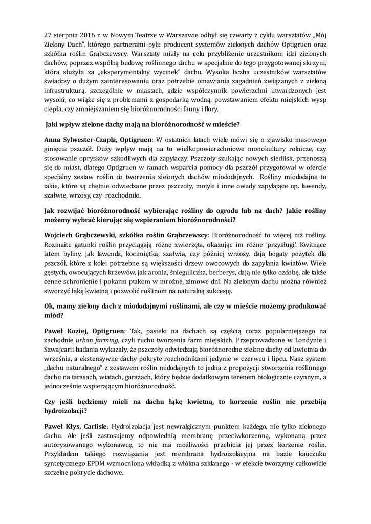 27 sierpnia 2016 r. w Nowym Teatrze w Warszawie odbył się czwarty z cyklu warsztatów „Mój Zielony Dach”, którego partnerami byli: producent systemów zielonych dachów Optigruen oraz szkółka roślin Grąbczewscy. Warsztaty miały na celu przybliżenie uczestnikom idei zielonych dachów, poprzez wspólną budowę roślinnego dachu w specjalnie do tego przygotowanej skrzyni, która służyła za „eksperymentalny wycinek” dachu. Wysoka liczba uczestników warsztatów świadczy o dużym zainteresowaniu oraz potrzebie omawiania zagadnień związanych z zieloną infrastrukturą, szczególnie w miastach, gdzie współczynnik powierzchni utwardzonych jest wysoki, co wiąże się z problemami z gospodarką wodną, powstawaniem efektu miejskich wysp ciepła, czy zmniejszaniem się bioróżnorodności fauny i flory. Jaki wpływ zielone dachy mają na bioróżnorodność w mieście? Anna Sylwester-Czapla, Optigruen: W ostatnich latach wiele mówi się o zjawisku masowego ginięcia pszczół. Duży wpływ mają na to wielkopowierzchniowe monokultury rolnicze, czy stosowanie oprysków szkodliwych dla zapylaczy. Pszczoły szukając nowych siedlisk, przenoszą się do miast, dlatego Optigruen w ramach wsparcia pomocy dla pszczół przygotował w ofercie specjalny zestaw roślin do tworzenia zielonych dachów miododajnych. Rośliny miododajne to takie, które są chętnie odwiedzane przez pszczoły, motyle i inne owady zapylające np. lawendy, szałwie, wrzosy, czy rozchodniki. Jak rozwijać bioróżnorodność wybierając rośliny do ogrodu lub na dach? Jakie rośliny możemy wybrać kierując się wspieraniem bioróżnorodności? Wojciech Grąbczewski, szkółka roślin Grąbczewscy: Bioróżnorodność to więcej niż rośliny. Rozmaite gatunki roślin przyciągają różne zwierzęta, okazując im różne ‘przysługi’. Kwitnące latem byliny, jak lawenda, kocimiętka, szałwia, czy później wrzosy, dają bogaty pożytek dla pszczół, które z kolei potrzebne są większości drzew owocowych do zapylania kwiatów. Wiele gęstych, owocujących krzewów, jak aronia, śnieguliczka, berberys, dają nie tylko ozdobę, ale także cenne schronienie i pokarm ptakom w mroźne, zimowe dni. Na zielonym dachu można również stworzyć łąkę kwietną i pozwolić roślinom na naturalną sukcesję. Ok, mamy zielony dach z miododajnymi roślinami, ale czy w mieście możemy produkować miód? Paweł Koziej, Optigruen: Tak, pasieki na dachach są częścią coraz popularniejszego na zachodnie urban farming, czyli ruchu tworzenia farm miejskich. Przeprowadzone w Londynie i Szwajcarii badania wykazały, że pszczoły odwiedzają bioróżnorodne zielone dachy od kwietnia do września, a ekstensywne dachy pokryte rozchodnikami jedynie w czerwcu i lipcu. Nasz system „dachu naturalnego” z zestawem roślin midodajnych to jedna z propozycji stworzenia roślinnego dachu na tarasach, wiatach, garażach, który będzie dodatkowym terenem biologicznie czynnym, a jednocześnie wspierającym bioróżnorodność. Czy jeśli będziemy mieli na dachu łąkę kwietną, to korzenie roślin nie przebiją hydroizolacji? Paweł Kłys, Carlisle: Hydroizolacja jest newralgicznym punktem każdego, nie tylko zielonego dachu. Ale jeśli zastosujemy odpowiednią membranę przeciwkorzenną, wykonaną przez autoryzowanego wykonawcę, to nie ma możliwości przebicia jej przez korzenie roślin. Przykładem takiego rozwiązania jest membrana hydroizolacyjna na bazie kauczuku syntetycznego EPDM wzmocniona wkładką z włókna szklanego - w efekcie tworzymy całkowicie szczelne pokrycie dachowe. Cykl warsztatów „Mój Zielony Dach” odbywał się w ramach Projektu Zielone Miasto – organizowanego przez Goethe-Institut i Ambasadę Niemiec z okazji 25-lecia Traktatu o dobrym sąsiedztwie i przyjaznej współpracy. Partnerami warsztatu były firmy Optigruen – producent systemów dachów zielonych oraz szkółka roślin Grąbczewscy, która od 80 lat zajmuje się produkcją roślin ozdobnych. Warsztat przeprowadziła pracownia architektury krajobrazu PoLandscape. Patronat nad cyklem „Mój Zielony Dach” objęło Polskie Stowarzyszenie „Dachy Zielone”. Więcej informacji na stronie organizatora: www.facebook.com/ZielonyParagraf Link do zdjęć z warsztatu: https://www.dropbox.com/sh/w7dsxlrz807q05q/AABYd6yMZmcEpO8urYnAvja3a?dl=0