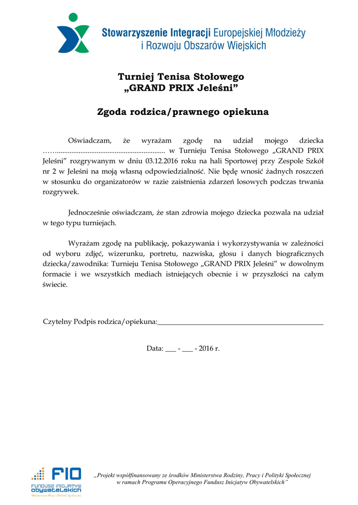 Turniej Tenisa Stołowego „GRAND PRIX Jeleśni” Zgoda rodzica/prawnego opiekuna Oświadczam, że wyrażam zgodę na udział mojego dziecka ……............................................................ w Turnieju Tenisa Stołowego „GRAND PRIX Jeleśni” rozgrywanym w dniu 03.12.2016 roku na hali Sportowej przy Zespole Szkół nr 2 w Jeleśni na moją własną odpowiedzialność. Nie będę wnosić żadnych roszczeń w stosunku do organizatorów w razie zaistnienia zdarzeń losowych podczas trwania rozgrywek. Jednocześnie oświadczam, że stan zdrowia mojego dziecka pozwala na udział w tego typu turniejach. Wyrażam zgodę na publikację, pokazywania i wykorzystywania w zależności od wyboru zdjęć, wizerunku, portretu, nazwiska, głosu i danych biograficznych dziecka/zawodnika: Turnieju Tenisa Stołowego „GRAND PRIX Jeleśni” w dowolnym formacie i we wszystkich mediach istniejących obecnie i w przyszłości na całym świecie. Czytelny Podpis rodzica/opiekuna:______________________________________________ Data: ___ - ___ - 2016 r. „Projekt współfinansowany ze środków Ministerstwa Rodziny, Pracy i Polityki Społecznej w ramach Programu Operacyjnego Fundusz Inicjatyw Obywatelskich”