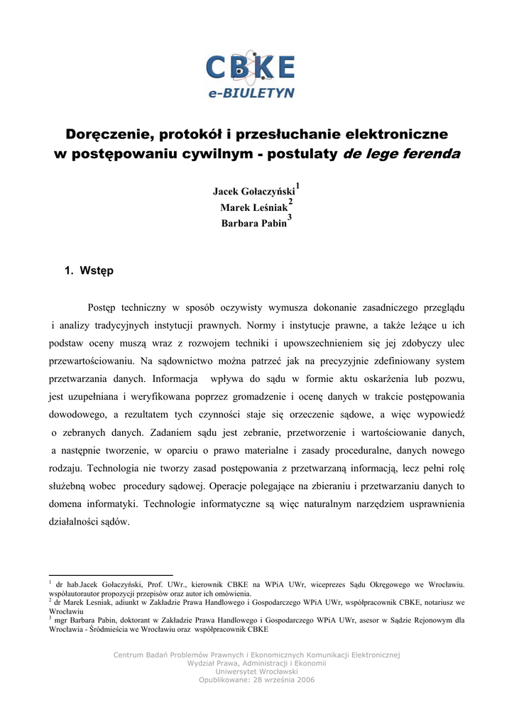 Doręczenie, protokół i przesłuchanie elektroniczne w postępowaniu cywilnym - postulaty de lege ferenda Jacek Gołaczyński Marek Leśniak Barbara Pabin 1 2 3 1. Wstęp Postęp techniczny w sposób oczywisty wymusza dokonanie zasadniczego przeglądu i analizy tradycyjnych instytucji prawnych. Normy i instytucje prawne, a także leżące u ich podstaw oceny muszą wraz z rozwojem techniki i upowszechnieniem się jej zdobyczy ulec przewartościowaniu. Na sądownictwo można patrzeć jak na precyzyjnie zdefiniowany system przetwarzania danych. Informacja wpływa do sądu w formie aktu oskarżenia lub pozwu, jest uzupełniana i weryfikowana poprzez gromadzenie i ocenę danych w trakcie postępowania dowodowego, a rezultatem tych czynności staje się orzeczenie sądowe, a więc wypowiedź o zebranych danych. Zadaniem sądu jest zebranie, przetworzenie i wartościowanie danych, a następnie tworzenie, w oparciu o prawo materialne i zasady proceduralne, danych nowego rodzaju. Technologia nie tworzy zasad postępowania z przetwarzaną informacją, lecz pełni rolę służebną wobec procedury sądowej. Operacje polegające na zbieraniu i przetwarzaniu danych to domena informatyki. Technologie informatyczne są więc naturalnym narzędziem usprawnienia działalności sądów. 1 dr hab.Jacek Gołaczyński, Prof. UWr., kierownik CBKE na WPiA UWr, wiceprezes Sądu Okręgowego we Wrocławiu. współautorautor propozycji przepisów oraz autor ich omówienia. 2 dr Marek Lesniak, adiunkt w Zakładzie Prawa Handlowego i Gospodarczego WPiA UWr, współpracownik CBKE, notariusz we Wrocławiu 3 mgr Barbara Pabin, doktorant w Zakładzie Prawa Handlowego i Gospodarczego WPiA UWr, asesor w Sądzie Rejonowym dla Wrocławia - Śródmieścia we Wrocławiu oraz współpracownik CBKE Centrum Badań Problemów Prawnych i Ekonomicznych Komunikacji Elektronicznej Wydział Prawa, Administracji i Ekonomii Uniwersytet Wrocławski Opublikowane: 28 września 2006 e–BIULETYN 3/2006 » Jacek Gołaczyński, Marek Leśniak, Barbara Pabin « Niniejsze opracowanie służyć ma wskazaniu tych obszarów postępowania sądowego, w których zastosowanie, sprawdzonych już gdzie indziej nowoczesnych technologii może przynieść znaczne usprawnienie postępowania oraz redukcję kosztów 2. Doręczenia W Rekomendacji Komitetu Ministrów Rady Europy dotyczącej wykonywania czynności sądowych i innych czynności prawnych na rzecz obywateli poprzez wykorzystanie nowych technologii 4 przedstawiono konkretne działania służące poprawie funkcjonowania sądownictwa przez wykorzystanie komunikacji elektronicznej. Sposoby te wskazują w tej sferze na wykorzystanie Internetu jako podstawowego medium służącego wymianie informacji. Komunikacja elektroniczna może w znaczny sposób zredukować koszty funkcjonowania sądownictwa. Upowszechnienie doręczania pism, wezwań i zawiadomień przez pocztę elektroniczną w oczywisty sposób ograniczy niezmiernie wysokie dziś koszty ekspedycji przesyłek sądowych i skróci czas oczekiwania przez sąd na relację poczty o skuteczności doręczenia. Niezbędne wydaje się jednak wprowadzenie ustawowych rozwiązań nakładających, na niektóre podmioty obowiązek podania sądowi adresu elektronicznego lub numeru telefaksu oraz warunków skuteczności doręczenia za pomocą tych środków komunikowania się na odległość. Należy rozważyć możliwość doręczenia pism procesowych zarówno sądowi, jak i uczestnikom postępowania (w znaczeniu strony, pełnomocnicy, interwenienci, przedstawiciele itp.), a także doręczenia elektroniczne zawiadomień i wezwań sądowych. W procedurze cywilnej istnieją już obecnie regulacje nakładające na same strony (np. w postępowaniu odrębnym w sprawach gospodarczych - art. 479 (9) § 1), czy na pełnomocników profesjonalnych (adwokatów i radców prawnych - art. 132 § 1 k.p.c.) obowiązek doręczania sobie wzajemnie pism procesowych. Ważne jest to, że doręczenia te są skuteczne jedynie za potwierdzeniem odbioru i oznaczeniem daty doręczenia. Wydaje się zatem zasadne, aby w tych przypadkach należało wprowadzić możliwość doręczania tych pism procesowych w postaci elektronicznej na adres poczty elektronicznej lub na numer telefaksu. Do ewentualnego rozważenia pozostaje, czy pisma procesowe stron doręczane w takiej postaci winny być podpisane bezpiecznym podpisem elektronicznym, ze szczególnym 4 Council of Europe Committee of Ministers Recommendation Rec(2001)3 of 28 February 2001 on the delivery of court and other legal services to the citizen through the use of new technologies, dostępne: http://cm.coe.int/ta/rec/2001/2001r3.htm, sprawdzono: 6 maja 2005 r.. Prawa autorskie © :: CBKE :: Wszystkie prawa zastrzeżone 2 e–BIULETYN 3/2006 » Jacek Gołaczyński, Marek Leśniak, Barbara Pabin « uwzględnieniem podpisu wydanego na podstawie ważnego, kwalifikowanego certyfikatu, jak również od jakiego podmiotu podpis ten miałby pochodzić? Nie można też pominąć regulacji zawartej w art. 16 ustawy o informatyzacji, która nakłada na podmiot publiczny, który prowadzi wymianę informacji, obowiązek zapewnienia wymiany informacji również w formie elektronicznej przez wymianę dokumentów elektronicznych związanych z załatwieniem spraw należących do jego zakresu działania, przy wykorzystaniu nośników danych lub środków komunikacji elektronicznej. Jednocześnie paragraf 3 tego przepisu zawiera delegację ustawową dla Prezesa rady Ministrów do określenia warunków organizacyjnotechnicznych doręczenia dokumentów elektronicznych, w tym formę urzędowego poświadczenia odbioru tych dokumentów przez adresatów, uwzględniając minimalne wymagania dla rejestrów publicznych i wymiany informacji w forami ujednolicenia obiegu dokumentów miedzy podmiotami publicznymi. Rozporządzenie Prezesa Rady Ministrów z dnia 29 września 2005r. w sprawie warunków organizacyjno-technicznych doręczania dokumentów elektronicznych 