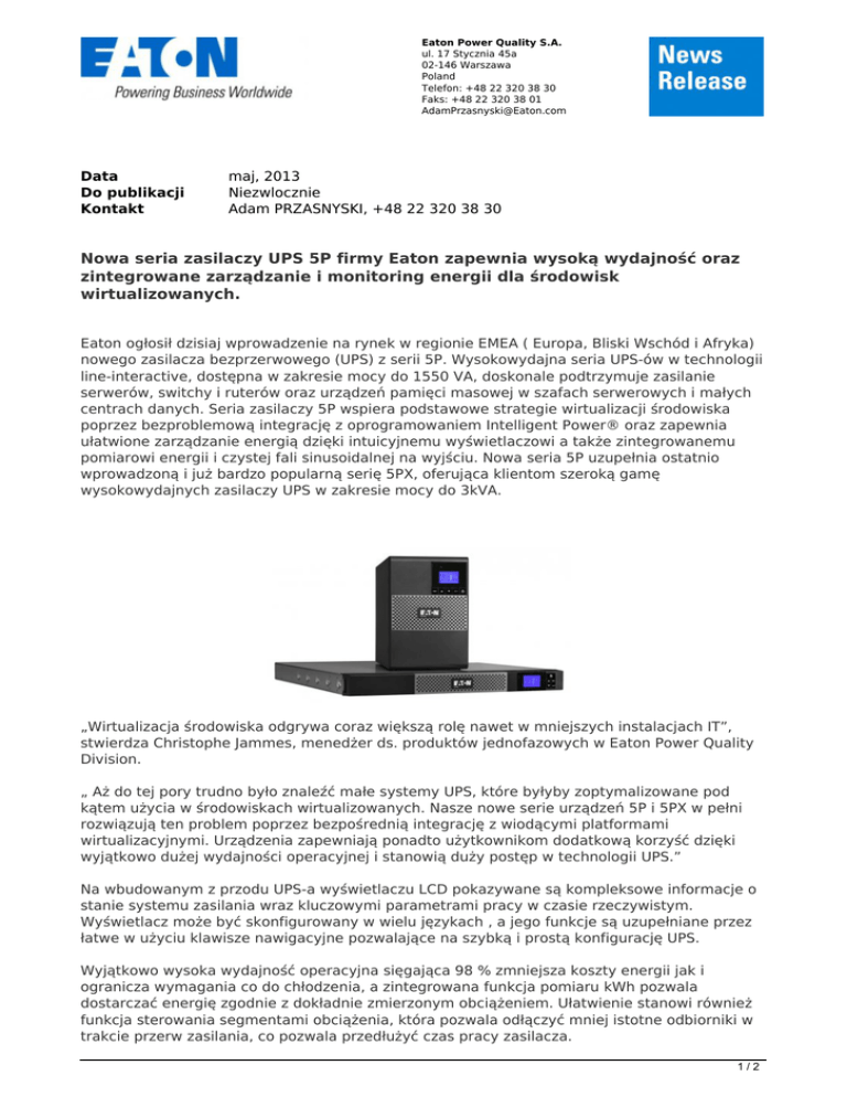 Eaton Power Quality S.A. ul. 17 Stycznia 45a 02-146 Warszawa Poland Telefon: +48 22 320 38 30 Faks: +48 22 320 38 01 [email protected] Data Do publikacji Kontakt maj, 2013 Niezwlocznie Adam PRZASNYSKI, +48 22 320 38 30 Nowa seria zasilaczy UPS 5P firmy Eaton zapewnia wysoką wydajność oraz zintegrowane zarządzanie i monitoring energii dla środowisk wirtualizowanych. Eaton ogłosił dzisiaj wprowadzenie na rynek w regionie EMEA ( Europa, Bliski Wschód i Afryka) nowego zasilacza bezprzerwowego (UPS) z serii 5P. Wysokowydajna seria UPS-ów w technologii line-interactive, dostępna w zakresie mocy do 1550 VA, doskonale podtrzymuje zasilanie serwerów, switchy i ruterów oraz urządzeń pamięci masowej w szafach serwerowych i małych centrach danych. Seria zasilaczy 5P wspiera podstawowe strategie wirtualizacji środowiska poprzez bezproblemową integrację z oprogramowaniem Intelligent Power® oraz zapewnia ułatwione zarządzanie energią dzięki intuicyjnemu wyświetlaczowi a także zintegrowanemu pomiarowi energii i czystej fali sinusoidalnej na wyjściu. Nowa seria 5P uzupełnia ostatnio wprowadzoną i już bardzo popularną serię 5PX, oferująca klientom szeroką gamę wysokowydajnych zasilaczy UPS w zakresie mocy do 3kVA. „Wirtualizacja środowiska odgrywa coraz większą rolę nawet w mniejszych instalacjach IT”, stwierdza Christophe Jammes, menedżer ds. produktów jednofazowych w Eaton Power Quality Division. „ Aż do tej pory trudno było znaleźć małe systemy UPS, które byłyby zoptymalizowane pod kątem użycia w środowiskach wirtualizowanych. Nasze nowe serie urządzeń 5P i 5PX w pełni rozwiązują ten problem poprzez bezpośrednią integrację z wiodącymi platformami wirtualizacyjnymi. Urządzenia zapewniają ponadto użytkownikom dodatkową korzyść dzięki wyjątkowo dużej wydajności operacyjnej i stanowią duży postęp w technologii UPS.” Na wbudowanym z przodu UPS-a wyświetlaczu LCD pokazywane są kompleksowe informacje o stanie systemu zasilania wraz kluczowymi parametrami pracy w czasie rzeczywistym. Wyświetlacz może być skonfigurowany w wielu językach , a jego funkcje są uzupełniane przez łatwe w użyciu klawisze nawigacyjne pozwalające na szybką i prostą konfigurację UPS. Wyjątkowo wysoka wydajność operacyjna sięgająca 98 % zmniejsza koszty energii jak i ogranicza wymagania co do chłodzenia, a zintegrowana funkcja pomiaru kWh pozwala dostarczać energię zgodnie z dokładnie zmierzonym obciążeniem. Ułatwienie stanowi również funkcja sterowania segmentami obciążenia, która pozwala odłączyć mniej istotne odbiorniki w trakcie przerw zasilania, co pozwala przedłużyć czas pracy zasilacza. 1/2 Dostępne w serii 5P programowanie Eaton Intelligent Power to innowacyjne połączenie zarządzania energią i oprogramowania zabezpieczającego Dzięki niemu użytkownicy mogą płynnie zintegrować się z oprogramowaniem wirtualizacyjnym VMware’s vCenter Server™, jak również platformami wirtualizacyjnymi takimi jak Citrix® XenServer, Microsoft SCVMM, Red Hat i innymi platformami Xen® open source. W trakcie zakłóceń w dostawach energii integracja pozwala na automatyczną i bezproblemową migrację na żywo maszyn wirtualnych do urządzeń działających bezproblemowo oraz zapewnia płynne zamykanie komputerów, maszyn wirtualnych i serwerów w trakcie dłuższych przerw w zasilaniu. Dodatkowo seria 5P oferuje złącze USB i interfejs szeregowy oraz miejsce na opcjonalną kartę komunikacyjną poprawiającą system zarządzania poprzez funkcjonalność SNMP/Web lub wyjście styków przekaźnikowych. Nowe zasilacze z serii 5P, dostępne w zakresie mocy od 650VA do 1550VA, zapewniają na wyjściu czystą falę sinusoidalną zasilająca nawet najbardziej wrażliwe odbiorniki, włączając w to serwery z aktywnym system poprawy współczynnika mocy (A-PFC). Technologia zarządzania akumulatorami ABM, opracowana przez firmę Eaton, zapewnia maksymalną żywotność baterii i niezawodność serii 5P. Technologia ta gwarantuje,że akumulatory są ładowane tylko gdy zachodzi taka konieczność, co przedłuża żywotność baterii nawet o 50%. Dodatkowo, gdy baterie wymagają konserwacji bądź wymiany, można je wymienić „na gorąco” ( hot swapping) bez przerw w dostawie energii do wrażliwych urządzeń obsługiwanych przez UPS. Seria 5P wysoko wydajnych urządzeń UPS jest dostępna w kompaktowych obudowach typu tower i wersji 1U do zabudowy rack, która zapewnia niezrównaną gęstość upakowania mocy do 1,1 kW na jedną jednostkę 1U . Wszystkie modele są oferowane ze standardową trzyletnią gwarancją na komponenty elektroniczne i dwuletnią na baterie. Więcej informacji o serii zasilaczy bezprzerwowych 5P można znaleźć odwiedzając stronę www.eaton.eu/5P. Więcej informacji dotyczących rozwiązań firmy Eaton w zakresie jakości energii jest dostępnych pod adresem www.eaton.eu/powerquality. Najnowsze informacje dostępne na Twitterze na kanale @Eaton_UPS bądź w serwisie LinkedIn na stronie Eaton EMEA. Sektor elektryczny Eaton jest globalnym liderem w dziedzinie dystrybucji zasilania i zabezpieczenia obwodów; zabezpieczenia zasilania zapasowego; regulacji i automatyki; oświetlenia i bezpieczeństwa; rozwiązań strukturalnych i sprzętu instalacyjnego; rozwiązań do pracy w surowych i niebezpiecznych warunkach; a także usług inżynieryjnych. Dzięki swojemu zestawowi globalnych rozwiązań Eaton jest w stanie sprostać najbardziej krytycznym wyzwaniom w zarządzaniu zasilaniem elektrycznym dnia dzisiejszego. Eaton to zróżnicowane przedsiębiorstwo zarządzające energią, oferujące energooszczędne rozwiązania wspomagające efektywne zarządzanie wykorzystaniem energii elektrycznej, hydraulicznej i mechanicznej. W 2012 roku firma Eaton, globalny lider w dziedzinie technologii, nabyła Cooper Industries plc. Przychód połączonych firm w 2012 roku na podstawie obliczeń pro forma wyniósł 21,8 
