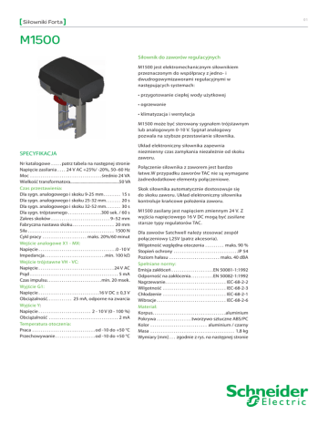 01 Siłowniki Forta M1500 Siłownik do zaworów regulacyjnych M1500 jest elektromechanicznym siłownikiem przeznaczonym do współpracy z jedno- i dwudrogowymizaworami regulacyjnymi w następujących systemach: • przygotowanie ciepłej wody użytkowej • ogrzewanie • klimatyzacja i wentylacja M1500 może być sterowany sygnałem trójstawnym lub analogowym 0-10 V. Sygnał analogowy pozwala na szybsze przestawianie siłownika. SPECYFIKACJA Nr katalogowe. . . . . . patrz tabela na następnej stronie Napięcie zasilania. . . . . 24 V AC +25%/ -20%, 50–60 Hz Moc. . . . . . . . . . . . . . . . . . . . . . . . . . . . . . . . . . średnio 24 VA Wielkość transformatora...............................................50 VA Czas przestawienia: Dla sygn. analogowego i skoku 9-25 mm. . . . . . . . . 15 s Dla sygn. analogowego i skoku 25-32 mm. . . . . . . . 20 s Dla sygn. analogowego i skoku 32-52 mm. . . . . . . . 30 s Dla sygn. trójstawnego. . . . . . . . . . . . . . . . 300 sek. / 60 s Zakres skoków. . . . . . . . . . . . . . . . . . . . . . . . . . . . . 9–52 mm Fabryczna nastawa skoku. . . . . . . . . . . . . . . . . . . . . 20 mm Siła. . . . . . . . . . . . . . . . . . . . . . . . . . . . . . . . . . . . . . . . . . 1500 N Cykl pracy . . . . . . . . . . . . . . . . . . . . . . maks. 20%/60 minut Wejście analogowe X1 - MX: Napięcie. . . . . . . . . . . . . . . . . . . . . . . . . . . . . . . . . . . . . 0 -10 V Impedancja. . . . . . . . . . . . . . . . . . . . . . . . . . . . . min. 100 kΩ Wejście trójstawne VH - VC: Napięcie. . . . . . . . . . . . . . . . . . . . . . . . . . . . . . . . . . . . 24 V AC Prąd. . . . . . . . . . . . . . . . . . . . . . . . . . . . . . . . . . . . . . . . . . . 5 mA Czas impulsu. . . . . . . . . . . . . . . . . . . . . . . . . . min. 20 msek. Wyjście G1: Napięcie. . . . . . . . . . . . . . . . . . . . . . . . . . . . . 16 V DC ± 0,3 V Obciążalność.. . . . . . . . . . . . 25 mA, odporne na zwarcia Wyjście Y: Napięcie. . . . . . . . . . . . . . . . . . . . . . . . . . 2 - 10 V (0 - 100 %) Obciążalność . . . . . . . . . . . . . . . . . . . . . . . . . . . . . . . . . . 2 mA Temperatura otoczenia: Praca. . . . . . . . . . . . . . . . . . . . . . . . . . . . . . od -10 do +50 °C Przechowywanie. . . . . . . . . . . . . . . . . . . od -10 do +50 °C Układ elektroniczny siłownika zapewnia niezmienny czas zamykania niezależnie od skoku zaworu. Połączenie siłownika z zaworem jest bardzo łatwe.W przypadku zaworów TAC nie są wymagane żadnedodatkowe elementy połączeniowe. Skok siłownika automatycznie dostosowuje się do skoku zaworu. Układ elektroniczny siłownika kontroluje krańcowe położenia zaworu. M1500 zasilany jest napięciem zmiennym 24 V. Z wyjścia napięciowego 16 V DC mogą być zasilane starsze typy regulatorów TAC. Dla zawoów Satchwell należy stosować zespół połączeniowy L2SV (patrz akcesoria). Wilgotność względna otoczenia. . . . . . . . . . maks. 90 % Stopień ochrony . . . . . . . . . . . . . . . . . . . . . . . . . . . . . . . IP 54 Poziom hałasu . . . . . . . . . . . . . . . . . . . . . . . . . maks. 40 dBA Spełniane normy: Emisja zakłóceń. . . . . . . . . . . . . . . . . . . . EN 50081-1:1992 Odporność na zakłócenia. . . . . . . . . . . EN 50082-1:1992 Nagrzewanie. . . . . . . . . . . . . . . . . . . . . . . . . . . . . . IEC-68-2-2 Wilgotność . . . . . . . . . . . . . . . . . . . . . . . . . . . . . . . IEC-68-2-3 Chłodzenie . . . . . . . . . . . . . . . . . . . . . . . . . . . . . . . IEC-68-2-1 Wibracje. . . . . . . . . . . . . . . . . . . . . . . . . . . . . . . . . . IEC-68-2-6 Materiał: Korpus. . . . . . . . . . . . . . . . . . . . . . . . . . . . . . . . . . . aluminium Pokrywa. . . . . . . . . . . . . . . . . tworzywo sztuczne ABS/PC Kolor . . . . . . . . . . . . . . . . . . . . . . . . . . . . aluminium / czarny Masa . . . . . . . . . . . . . . . . . . . . . . . . . . . . . . . . . . . . . . . . . 1,8 kg Wymiary [mm]. . . . zgodnie z rys. na następnej stronie Siłowniki Forta 02 M1500 NUMERY KATALOGOWE Oznaczenie Opis Nr katalogowy M1500 Sygnał sterujący analogowy lub trójstawny. 880-0450-000 M1500-S2 Sygnał sterujący analogowy lub trójstawny, przekaźniki położeń krańcowych. 880-0451-000 WYMIARY (mm) FUNKCJE FUNKCJE Schneider Electric Buildings Polska Sp. z o.o. , ul. Rzymowskiego 53, 02-697 Warszawa, tel.: +48 22 313 24 10, fax: +48 22 313 24 11 www.schneider-electric.com/buildings 003-3264-3 Styczeń 2008 mf © 2009 Schneider Electric. All rights reserved. Siłownik Silnik krokowy w siłowniku otrzymuje sygnał sterujący z regulatora. Ruch obrotowy wirnika przekazywany jest do przekładni zębatej a następnie zamieniany jest w układzie nakrętkaśruba na ruch liniowy trzpienia. Sygnał sterujący M1500 może być sterowany zarówno sygnałem trójstawnym jak i sygnałem analogowym napięciowym. W przypadku sygnału analogowego każdej wartości napięcia odpowiada określone położenie trzpienia siłownika. Przy sterowaniu trójstawnym, kierunek ruchu trzpienia zależy od polaryzacji sygnału sterującego. Praca ręczna Siłownik wyposażony jest w pokrętło do ręcznego ustawiania położenia (rys.2). Odchylenie pokrętła w dół powoduje wyłączenie silnika i przejście siłownika w tryb pracy ręcznej. Obracając pokrętło można ustawić dowolne położenie trzpienia siłownika. Zwrotny sygnał położenia Wszystkie siłowniki Forta P posiadają wyjście zwrotnego sygnału położenia o zakresie 2 do 10 V DC, gdzie napięcie 2 V odpowiada zawsze pozycji zamknięcia a 10 V pełnego otwarcia. Wyłączniki krańcowe Siłowniki Forta P mogą być wyposażone w zestaw wyłączników krańcowych posiadających komplet styków zwiernych i rozwiernych. Przełączanie styków następuje odpowiednio w pozycji pełnego otwarcia lub pełnego zamknięcia. Wyłączniki krańcowe mogą być wykorzystane przy pracy sekwencyjnej siłowników sterowanych sygnałem tr