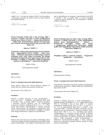 C 82/4 Dziennik Urzędowy Unii Europejskiej PL Artykuł 4 ust. 1 tiret pierwsze dyrektywy 90/435 jest bezwarunkowy i wystarczająco precyzyjny, aby można się było na niego powoływać przed sądami krajowymi. 4.4.2009 zapis na sąd polubowny, jest niezgodne z rozporządzeniem Rady (WE) nr 44/2001 z dnia 22 grudnia 2000 r. w sprawie jurysdykcji i uznawania orzeczeń sądowych oraz ich wykonywania w sprawach cywilnych i handlowych. (1) Dz.U. C 117 z 26.5.2007. (1) Dz.U. C 155 z 7.7.2007. Wyrok Trybunału (wielka izba) z dnia 10 lutego 2009 r. (wniosek o wydanie orzeczenia w trybie prejudycjalnym złożony przez House of Lords — Zjednoczone Królestwo) — Allianz SpA, dawniej Riunione Adriatica Di Sicurtà SpA oraz Generali Assicurazioni Generali SpA przeciwko West Tankers Inc. (Sprawa C-185/07) (1) Wyrok Trybunału (pierwsza izba) z dnia 12 lutego 2009 r. (wniosek o wydanie orzeczenia w trybie prejudycjalnym złożony przez Bundesgerichtshof — Niemcy) — Rechtsanwalt Christopher Seagon jako syndyk w postępowaniu upadłościowym dotyczącym majątku spółki Frick Teppichboden Supermärkte GmbH przeciwko Deko Marty Belgium NV ([Uznawanie i wykonywanie zagranicznych orzeczeń arbitrażowych — Rozporządzenie (WE) nr 44/2001 — Zakres stosowania — Właściwość sądu państwa członkowskiego w zakresie wydawania wobec strony zakazu wszczynania lub dalszego prowadzenia postępowania przed sądem innego państwa członkowskiego ze względu na niezgodność takiego postępowania z zapisem na sąd polubowny — Konwencja nowojorska]) (Współpraca sądowa w sprawach cywilnych — Postępowanie upadłościowe — Sąd właściwy) (2009/C 82/06) Język postępowania: niemiecki (Sprawa C-339/07) (1) (2009/C 82/07) Język postępowania: angielski Sąd krajowy Sąd krajowy Bundesgerichtshof (Niemcy) House of Lords Strony w postępowaniu przed sądem krajowym Strona skarżąca: Allianz SpA, dawniej Riunione Adriatica Di Sicurtà SpA oraz Generali Assicurazioni Generali SpA Strona pozwana: West Tankers Inc. Strony w postępowaniu przed sądem krajowym Strona skarżąca: Christopher Seagon jako syndyk w postępowaniu upadłościowym dotyczącym majątku spółki Frick Teppichboden Supermärkte GmbH Strona pozwana: Deko Marty Belgium NV Przedmiot Przedmiot Wniosek o wydanie orzeczenia w trybie prejudycjalnym — House od Lords — Wykładnia rozporządzenia Rady (WE) nr 44/2001 z dnia 22 grudnia 2000 r. w sprawie jurysdykcji i uznawania orzeczeń sądowych oraz ich wykonywania w sprawach cywilnych i handlowych (Dz.U. L 12, s. 1) — Właściwość sądu państwa członkowskiego w zakresie nakazania stronie niewszczynania lub zakończenia postępowania sądowego w innym państwie członkowskim ze względu na niezgodność takiego postępowania z zapisem na sąd polubowny Sentencja Wydanie wobec danej osoby przez sąd państwa członkowskiego zakazu wszczynania i dalszego prowadzenia postępowania przed sądami innego państwa członkowskiego, z tego względu że takie postępowanie narusza Wniosek o wydanie orzeczenia w trybie prejudycjalnym — Bundesgerichtshof -Wykładnia art. 3 ust. 1 rozporządzenia Rady (WE) nr 1346/2000 z dnia 29 maja 2000 r. w sprawie postępowania upadłościowego (Dz.U. L 160, s. 1) oraz art. 1 ust. 2 lit. b) rozporządzenia Rady (WE) nr 44/2001 z dnia 22 grudnia 2000 r. w sprawie jurysdykcji i uznawania orzeczeń sądowych oraz ich wykonywania w sprawach cywilnych i handlowych (Dz.U. 2001, L 12, s. 1) — Jurysdykcja sądu państwa członkowskiego, na terytorium którego znajduje się główny ośrodek podstawowej działalności dłużnika, dla wydawania orzeczeń bezpośrednio na podstawie postępowania upadłościowego i ściśle związanych z takim postępowaniem — Powództwo (Insolvenzanfechtungsklage) o zwrot zapłaconej kwoty przez wierzyciela mającego statutową siedzibę w innym państwie członkowskim