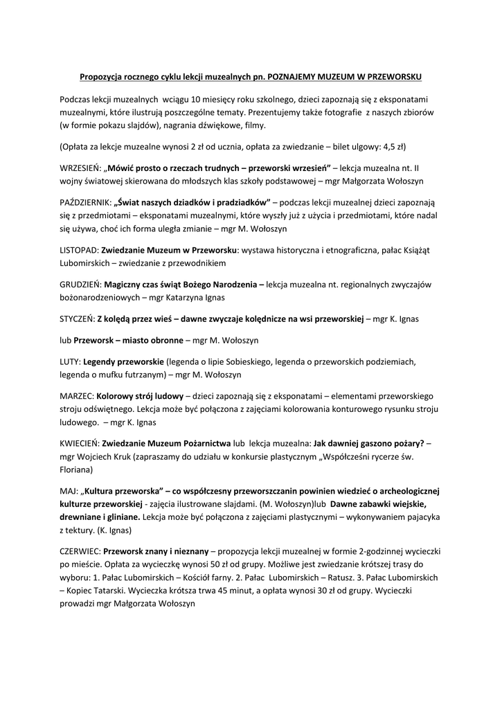 Propozycja rocznego cyklu lekcji muzealnych pn. POZNAJEMY MUZEUM W PRZEWORSKU Podczas lekcji muzealnych wciągu 10 miesięcy roku szkolnego, dzieci zapoznają się z eksponatami muzealnymi, które ilustrują poszczególne tematy. Prezentujemy także fotografie z naszych zbiorów (w formie pokazu slajdów), nagrania dźwiękowe, filmy. (Opłata za lekcje muzealne wynosi 2 zł od ucznia, opłata za zwiedzanie – bilet ulgowy: 4,5 zł) WRZESIEŃ: „Mówić prosto o rzeczach trudnych – przeworski wrzesień” – lekcja muzealna nt. II wojny światowej skierowana do młodszych klas szkoły podstawowej – mgr Małgorzata Wołoszyn PAŹDZIERNIK: „Świat naszych dziadków i pradziadków” – podczas lekcji muzealnej dzieci zapoznają się z przedmiotami – eksponatami muzealnymi, które wyszły już z użycia i przedmiotami, które nadal się używa, choć ich forma uległa zmianie – mgr M. Wołoszyn LISTOPAD: Zwiedzanie Muzeum w Przeworsku: wystawa historyczna i etnograficzna, pałac Książąt Lubomirskich – zwiedzanie z przewodnikiem GRUDZIEŃ: Magiczny czas świąt Bożego Narodzenia – lekcja muzealna nt. regionalnych zwyczajów bożonarodzeniowych – mgr Katarzyna Ignas STYCZEŃ: Z kolędą przez wieś – dawne zwyczaje kolędnicze na wsi przeworskiej – mgr K. Ignas lub Przeworsk – miasto obronne – mgr M. Wołoszyn LUTY: Legendy przeworskie (legenda o lipie Sobieskiego, legenda o przeworskich podziemiach, legenda o mufku futrzanym) – mgr M. Wołoszyn MARZEC: Kolorowy strój ludowy – dzieci zapoznają się z eksponatami – elementami przeworskiego stroju odświętnego. Lekcja może być połączona z zajęciami kolorowania konturowego rysunku stroju ludowego. – mgr K. Ignas KWIECIEŃ: Zwiedzanie Muzeum Pożarnictwa lub lekcja muzealna: Jak dawniej gaszono pożary? – mgr Wojciech Kruk (zapraszamy do udziału w konkursie plastycznym „Współcześni rycerze św. Floriana) MAJ: „Kultura przeworska” – co współczesny przeworszczanin powinien wiedzieć o archeologicznej kulturze przeworskiej - zajęcia ilustrowane slajdami. (M. Wołoszyn)lub Dawne zabawki wiejskie, drewniane i gliniane. Lekcja może być połączona z zajęciami plastycznymi – wykonywaniem pajacyka z tektury. (K. Ignas) CZERWIEC: Przeworsk znany i nieznany – propozycja lekcji muzealnej w formie 2-godzinnej wycieczki po mieście. Opłata za wycieczkę wynosi 50 zł od grupy. Możliwe jest zwiedzanie krótszej trasy do wyboru: 1. Pałac Lubomirskich – Kościół farny. 2. Pałac Lubomirskich – Ratusz. 3. Pałac Lubomirskich – Kopiec Tatarski. Wycieczka krótsza trwa 45 minut, a opłata wynosi 30 zł od grupy. Wycieczki prowadzi mgr Małgorzata Wołoszyn