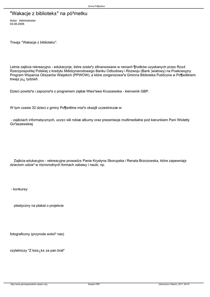 Gmina Po¶wiêtne "Wakacje z bibliotek±" na pó³metku Autor: Administrator 04.08.2008. Trwaj± "Wakacje z bibliotek±". Letnie zajêcia rekreacyjno - edukacynje, które zosta³y sfinansowane w ramach ¶rodków uzyskanych przez Rz±d Rzeczpospolitej Polskiej z kredytu Miêdzynarodowego Banku Odbudowy i Rozwoju (Bank ¦wiatowy) na Poakcesyjny Program Wsparcia Obszarów Wiejskich (PPWOW), a które zorganizowa³a Gminna Biblioteka Publiczna w Po¶wiêtnem trwaj± ju¿ tydzieñ. Dzieci powita³a i zapozna³a z programem zajêæ Wies³awa Kruszewska - kierownik GBP. W tym czasie 32 dzieci z gminy Po¶wiêtne mia³o okazjê uczestniczæ w: - zajêciach informatycznych, ucz±c siê robiæ albumy oraz prezentacje multimedialne pod kierunkiem Pani Wioletty Go³aszewskiej Zajêcia edukacyjno - rekreacyjne prowadz± Panie Krystyna Skorupska i Renata Brzozowska, które zapewniaj± dzieciom udzia³ w róznorodnych formach zabawy i nauki, np. - konkursy: plastyczny na plakat o projekcie fotograficzny (przyroda wokó³ nas) czytelniczy "Z ksi±¿k± za pan brat" http://www.gminaposwietne.vipserv.org Kreator PDF Utworzono 4 March, 2017, 09:10 Gmina Po¶wiêtne - wycieczki do kina Helios na film Panda kung-fu do Fikolandu (Centrum zabaw dla dzieci) w Bia³ymstoku p³ywalniê do Wysokiego Mazowieckiego. W czasie wolnym od zajêæ dzieci mog³y cieszyæ siê zabaw±, braæ udzia³ w zgaduj - zgadulach, weso³ej zabawie. W czasie "Wakacji z bibliotek±" dzieci maj± równie¿ mo¿liwo¶æ posilenia siê w czasie wolnym zajêæ, o co dba Pani Teresa Modzelewska, której kanapki smakuj± wyj±tkowo (nawet niejadkom). Przed nami jeszcze tydzieñ atrakcji....... http://www.gminaposwietne.vipserv.org Kreator PDF Utworzono 4 March, 2017, 09:10