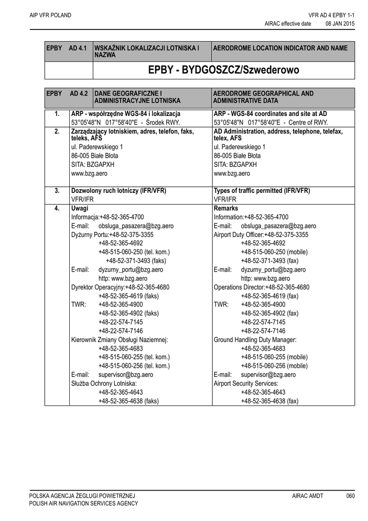 AIP VFR POLAND VFR AD 4 EPBY 1-1 AIRAC effective date 08 JAN 2015 EPBY AD 4.1 WSKAŹNIK LOKALIZACJI LOTNISKA I NAZWA AERODROME LOCATION INDICATOR AND NAME EPBY - BYDGOSZCZ/Szwederowo EPBY 1. 2. 3. 4. AD 4.2 DANE GEOGRAFICZNE I ADMINISTRACYJNE LOTNISKA AERODROME GEOGRAPHICAL AND ADMINISTRATIVE DATA ARP - współrzędne WGS-84 i lokalizacja 53°05'48''N 017°58'40''E - Środek RWY. Zarządzający lotniskiem, adres, telefon, faks, teleks, AFS ul. Paderewskiego 1 86-005 Białe Błota SITA: BZGAPXH www.bzg.aero ARP - WGS-84 coordinates and site at AD 53°05'48''N 017°58'40''E - Centre of RWY. AD Administration, address, telephone, telefax, telex, AFS ul. Paderewskiego 1 86-005 Białe Błota SITA: BZGAPXH www.bzg.aero Dozwolony ruch lotniczy (IFR/VFR) VFR/IFR Uwagi Informacja:+48-52-365-4700 E-mail: [email protected] Dyżurny Portu:+48-52-375-3355 +48-52-365-4692 +48-515-060-250 (tel. kom.) +48-52-371-3493 (faks) E-mail: [email protected] http: www.bzg.aero Dyrektor Operacyjny:+48-52-365-4680 +48-52-365-4619 (faks) TWR: +48-52-365-4900 +48-52-365-4902 (faks) +48-22-574-7145 +48-22-574-7146 Kierownik Zmiany Obsługi Naziemnej: +48-52-365-4683 +48-515-060-255 (tel. kom.) +48-515-060-256 (tel. kom.) E-mail: [email protected] Służba Ochrony Lotniska: +48-52-365-4643 +48-52-365-4638 (faks) Types of traffic permitted (IFR/VFR) VFR/IFR Remarks Information:+48-52-365-4700 E-mail: [email protected] Airport Duty Officer:+48-52-375-3355 +48-52-365-4692 +48-515-060-250 (mobile) +48-52-371-3493 (fax) E-mail: [email protected] http: www.bzg.aero Operations Director:+48-52-365-4680 +48-52-365-4619 (fax) TWR: +48-52-365-4900 +48-52-365-4902 (fax) +48-22-574-7145 +48-22-574-7146 Ground Handling Duty Manager: +48-52-365-4683 +48-515-060-255 (mobile) +48-515-060-256 (mobile) E-mail: [email protected] Airport Security Services: +48-52-365-4643 +48-52-365-4638 (fax) POLSKA AGENCJA ŻEGLUGI POWIETRZNEJ POLISH AIR NAVIGATION SERVICES AGENCY AIRAC AMDT 060 AIP VFR POLAND VFR AD 4 EPBY 1-2 AIRAC effective date 23 JUN 2016 EPBY 1. 2. 3. EPBY 1. 2. 3. 4. EPBY 1. AIRAC AMDT AD 4.3 GODZINY PRACY (UTC1)) OPERATIONAL HOURS (UTC1)) Zarządzający lotniskiem MON 0600 - MON 2300 (MON 0500 - MON 2200) TUE 0600 - TUE 2300 (TUE 0500 - TUE 2200) WED 0600 - WED 2300 (WED 0500 - WED 2200) THU 0600 - THU 2300 (THU 0500 - THU 2200) FRI 0600 - FRI 2300 (FRI 0500 - FRI 2200) SAT 0700 - SAT 1900 (SAT 0600 - SAT 1800) SUN 0700 - SUN 1900 (SUN 0600 - SUN 1800) Służby Ruchu Lotniczego MON 0600 - MON 2300 (MON 0500 - MON 2200) TUE 0600 - TUE 2300 (TUE 0500 - TUE 2200) WED 0600 - WED 2300 (WED 0500 - WED 2200) THU 0600 - THU 2300 (THU 0500 - THU 2200) FRI 0600 - FRI 2300 (FRI 0500 - FRI 2200) SAT 0700 - SAT 1900 (SAT 0600 - SAT 1800) SUN 0700 - SUN 1900 (SUN 0600 - SUN 1800) Uwagi Aerodrome Administration MON 0600 - MON 2300 (MON 0500 - MON 2200) TUE 0600 - TUE 2300 (TUE 0500 - TUE 2200) WED 0600 - WED 2300 (WED 0500 - WED 2200) THU 0600 - THU 2300 (THU 0500 - THU 2200) FRI 0600 - FRI 2300 (FRI 0500 - FRI 2200) SAT 0700 - SAT 1900 (SAT 0600 - SAT 1800) SUN 0700 - SUN 1900 (SUN 0600 - SUN 1800) ATS MON 0600 - MON 2300 (MON 0500 - MON 2200) TUE 0600 - TUE 2300 (TUE 0500 - TUE 2200) WED 0600 - WED 2300 (WED 0500 - WED 2200) THU 0600 - THU 2300 (THU 0500 - THU 2200) FRI 0600 - FRI 2300 (FRI 0500 - FRI 2200) SAT 0700 - SAT 1900 (SAT 0600 - SAT 1800) SUN 0700 - SUN 1900 (SUN 0600 - SUN 1800) Remarks 1) 1) - patrz VFR GEN 2.1. - see VFR GEN 2.1. AD 4.4 SŁUŻBY I URZĄDZENIA HANDLINGOWE HANDLING SERVICES AND FACILITIES Rodzaje paliwa i oleju AVGAS 100LL, JET A-1/NIL Możliwość hangarowania dla przylatujących statków powietrznych Dostępny po uzgodnieniu. Urządzenia naprawcze dla przylatujących statków powietrznych NIL Uwagi PETROLOT Sp. z o.o. Filia Bydgoszcz - Szwederowo +48-52-375-3403 +48-52-375-3387 (faks) E-mail: [email protected] Warunki płatności za paliwo: - karty płatnicze: VISA, VISA ELECTRON, MASTERCARD, AMERICAN EXPRESS; - karty paliwowe: AIR BP, MULTI SERVICE, AVCARD, AIR ROUTING, UVAIR, WORD FUEL SERVICES. Dostępny agregat rozruchowy (ASU) - 1. Fuel/Oil types AVGAS 100LL, JET A-1/NIL Hangar space for visiting aircraft Available after consultation. Repair facilities for visiting aircraft NIL Remarks PETROLOT Ltd Bydgoszcz - Szwederowo subsidiary +48-52-375-3403 +48-52-375-3387 (fax) E-mail: [email protected] Fuel payment conditions: - credit cards: VISA, VISA ELECTRON, MASTERCARD, AMERICAN EXPRESS; - fuel carnets: AIR BP, MULTI SERVICE, AVCARD, AIR ROUTING, UVAIR, WORD FUEL SERVICES. Air starter unit (ASU) available - 1. AD 4.5 UŁATWIENIA DLA PASAŻERÓW PASSENGER FACILITIES Hotele W mieście. Hotels Hotels in the city. 079 POLSKA AGENCJA ŻEGLUGI POWIETRZNEJ POLISH AIR NAVIGATION SERVICES AGENCY AIP VFR POLAND EPBY 1. EPBY 1. 2. 3. EPBY VFR AD 4 EPBY 1-3 AIRAC effective date 17 SEP 2015 AD 4.6 SŁUŻBA RATOWNICZA I PRZECIWPOŻAROWA RESCUE AND FIRE FIGHTING SERVICES Kategoria lotniska w zakresie ochrony przeciwpożarowej CAT 7 ICAO Aerodrome category for fire fighting AD 4.7 ZAPEWNIANE INFORMACJE METEOROLOGICZNE METEOROLOGICAL INFORMATION PROVIDED Biuro MET Lotniskowa Stacja Meteorologiczna BydgoszczSzwederowo. Godziny pracy/Zastępcze biuro MET Centralne Biuro Prognoz Lotniczych - Meteorologiczne Biuro Nadzoru 24 HR Informacje dodatkowe (przerwy w działaniu służb itd.) RVR tylko na żądanie TWR. Lotniskowa Stacja Meteorologiczna: Telefaks: +48-52-365-4911 E-mail: [email protected] Centralne Biuro Prognoz Lotniczych - Meteorologiczne Biuro Nadzoru: Tel.: +48-22-846-0682 +48-22-569-4592 Faks: +48-22-846-3818 E-mail: [email protected] AD 4.8 PRZESTRZEŃ SŁUŻB RUCHU LOTNICZEGO Oznaczenie przestrzeni powietrznej oraz współrzędne geograficzne jej granic bocznych (WGS-84) Airspace designation and geographical coordinates of its lateral limits (WGS-84) 1 BYDGOSZCZ/Szwederowo CTR 53°08'46''N 017°40'46''E 53°10'42''N 017°53'47''E 53°12'57''N 018°14'27''E 53°11'56''N 018°18'58''E 53°09'37''N 018°21'57''E 53°06