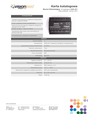 Karta katalogowa Neuron Ściemniający Nr katalogowy DIM-4CT Data publikacji: marzec 2014 Funkcjonalność Interfejs komunikacyjny urządzenia zrealizowany poprzez magistralę RS485 Cztery niezależne kanały oświetleniowe Możliwość płynnej regulacji natężenia oświetlenia zakresie 0% do 100% Sposób montażu – szyna TH 35mm Sygnalizacja stanu pracy oraz komunikacji za pomocą diod LED Kompatybilność z systemem VISION BMS Wyjścia Liczba kanałów: Obciążalność: Znamionowe napięcie odbiorników: Element wykonawczy: Metoda sterowania: Praca równoległa: Chłodzenie: 4 200W AC1 (wyłącznie obciążenie rezystancyjne!) AC 230V Triak Sterowanie fazowe NIE! Pasywne Zasilanie Napięcie zasilania: 10 ÷ 30V DC Maksymalny pobór prądu: 0,3A/24V DC Bezpiecznik : Temperatura pracy: Maksymalna wilgotność względna powietrza: Wymiary: Waga: SMD zwłoczny 1,5 A +5°C ÷ +40°C 80% (bez kondensacji) 90 x 105 x 65 mm 0,300 kg
