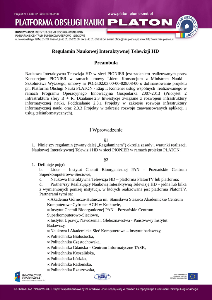 Regulamin Naukowej Interaktywnej Telewizji HD Preambuła Naukowa Interaktywna Telewizja HD w sieci PIONIER jest zadaniem realizowanym przez Konsorcjum PIONIER w ramach umowy Lidera Konsorcjum z Ministrem Nauki i Szkolnictwa Wyższego, umowy nr POIG.02.03.00-00-028/08-00 o dofinansowanie projektu pn. Platforma Obsługi Nauki PLATON - Etap I: Kontener usług wspólnych realizowanego w ramach Programu Operacyjnego Innowacyjna Gospodarka 2007-2013 (Priorytet 2 Infrastruktura sfery B + R, Działanie 2.3 Inwestycje związane z rozwojem infrastruktury informatycznej nauki, Poddziałanie 2.3.1 Projekty w zakresie rozwoju infrastruktury informatycznej nauki oraz 2.3.3 Projekty w zakresie rozwoju zaawansowanych aplikacji i usług teleinformatycznych). I Wprowadzenie §1 1. Niniejszy regulamin (zwany dalej „Regulaminem”) określa zasady i warunki realizacji Naukowej Interaktywnej Telewizji HD w sieci PIONIER w ramach projektu PLATON. §2 1. Definicje pojęć: b. Lider – Instytut Chemii Bioorganicznej PAN – Poznańskie Centrum Superkomputerowo-Sieciowe; c. Naukowa Interaktywna Telewizja HD – platforma PlatonTV lub platforma; d. Partner/rzy Realizujący Naukową Interaktywną Telewizję HD – jedna lub kilka z wymienionych poniżej instytucji, w których realizowana jest platforma PlatonTV. Partnerami tymi są: • Akademia Górniczo-Hutnicza im. Stanisława Staszica Akademickie Centrum Komputerowe Cyfronet AGH w Krakowie, • Instytut Chemii Bioorganicznej PAN – Poznańskie Centrum Superkomputerowo-Sieciowe, • Instytut Uprawy, Nawożenia i Gleboznawstwa - Państwowy Instytut Badawczy, • Naukowa i Akademicka Sieć Komputerowa – instytut badawczy, • Politechnika Białostocka, • Politechnika Częstochowska, • Politechnika Gdańska – Centrum Informatyczne TASK, • Politechnika Koszalińska, • Politechnika Łódzka, • Politechnika Radomska, • Politechnika Rzeszowska, • Politechnika Śląska Centrum Komputerowe, • Politechnika Świętokrzyska w Kielcach, • Politechnika Wrocławska Wrocławskie Centrum Sieciowo– Superkomputerowe, • Uniwersytet Marii Curie-Skłodowskiej LubMAN UMCS, • Uniwersytet Mikołaja Kopernika w Toruniu, • Uniwersytet Opolski, • Uniwersytet Technologiczno-Przyrodniczy im. Jana i Jędrzeja Śniadeckich, • Uniwersytet Warmińsko-Mazurski, • Uniwersytet Warszawski, • Uniwersytet Zielonogórski • Zachodniopomorski Uniwersytet Technologiczny w Szczecinie, Akademickie Centrum Informatyki, e. Świadczący – członek Konsorcjum PIONIER udostępniający Naukową Interaktywną Telewizję HD; f. Sieć MAN (ang. Metropolitan Area Network) – szerokopasmowa sieć miejska zarządzana przez członka Konsorcjum PIONIER; g. Sieć PIONIER - ogólnopolska szerokopasmowa sieć optyczna stanowiąca bazę dla badań naukowych i prac rozwojowych w obszarze informatyki i telekomunikacji, nauk obliczeniowych, aplikacji oraz usług dla społeczeństwa informacyjnego. Obecnie łączy 21 ośrodków Miejskich Sieci Komputerowych (sieci MAN) i 5 Centrów Komputerów Dużej Mocy za pomocą własnych łączy światłowodowych; h. Konsorcjum PIONIER - jest formalnym porozumieniem zawartym przez 21 Miejskich Sieci Komputerowych MAN i 5 Centrów Komputerów Dużej Mocy (KDM); i. Rada Konsorcjum PIONIER - jest organem o uprawnieniach inicjatywnych, opiniodawczych i nadzorczych, a także podejmuje wszelkie decyzje dotyczące zasad współfinansowania eksploatowanej infrastruktury Sieci PIONIER; j. Jednostka – jednostka prowadząca działalność naukową lub edukacyjną, do której stosuje się przepisy ustawy z dnia 30 kwietnia 2010 r. o zasadach finansowania nauki (dz. U. Z 2010 r. Nr 96, poz. 615, Art. 2, lit. 9) oraz instytucja edukacyjna i oświatowa, jednostka administracji rządowej i samorządowej, instytucja kulturalna, biblioteka, jednostka służby zdrowia, instytucja wyższej użyteczności i pożytku publicznego, mająca zawartą umowę na realizację usług telekomunikacyjnych w sieci MAN, tj. będąca abonentem sieci MAN; k. Korzystający – Jednostka, która zaakceptowała niniejszy Regulamin i podpisała deklarację korzystania z platformy PlatonTV; l. Użytkownik – pracownik Korzystającego bądź osoba realizująca prace zlecone lub zlecone dzieło na rzecz Korzystającego; m. Dostawca treści – Korzystający produkujący lub posiadający treści audiowizualne, które mogą zostać udostępnione na platformie PlatonTV; n. Zestaw produkcyjny – Studio Produkcyjne, Studio Nagrań lub Wóz realizatorski wdrożone w ramach projektu Platon; o. Repozytorium treści – system do składowania, rekodowania i udostępniania treści audiowizualnych do dystrybucji, stanowiący element infrastruktury platformy PlatonTV, którego użytkownikami są Dostawcy treści; p. System Emisyjny – system do zarządzania emisją audycji „na żywo” oraz akwizycji tych treści, stanowiący element infrastruktury platformy PlatonTV, którego użytkownikami są Dostawcy treści; q. System Dostarczania Treści – system do dystrybucji i udostępniania treści audiowizualnych, którego węzły wdrożono w sieciach MAN, stanowiący element infrastruktury platformy PlatonTV; r. Portal AoD – (ang. Application on Demond) system do prezentacji oferty i udostępniania treści oraz narzędzi interaktywnych na platformie PlatonTV, stanowiący element infrastruktury tej platformy; s. Subportal AoD - system do prezentacji oferty i udostępniania treści oraz narzędzi interaktywnych na platformie PlatonTV, stanowiący element infrastruktury tej platformy, udostępniany Korzystającym i Partnerom Realizującym; t. Odbiorca – osoba korzystająca z treści i narzędzi udostępnianych za pośrednictwem portalu AoD, która zaakceptowała niniejszy Regulamin. II Dostęp do Naukowej Interaktywnej Telewizji HD §3 1. Platforma PlatonTV stanowi wydzieloną warstwę zasobów sieci PIONIER przeznaczonych do realizacji telewizji naukowej w Internecie, pozwalających na tworze