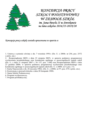 KONCEPCJA PRACY SZKOŁY PODSTAWOWEJ W ZESPOLE SZKÓŁ im. Jana Pawła II w Smrokowie na lata szkolne 2014/152014/15-2019/20 2019/20 Koncepcja pracy szkoły została opracowana w oparciu o: 1. Ustawę o systemie oświaty z dn. 7 września 1991r. (Dz. U. z 2004r. nr 256, poz. 2572 z późn. zm.) 2. Rozporządzenie MEN z dnia 23 sierpnia 2007r. w sprawie podstawy programowej wychowania przedszkolnego oraz kształcenia ogólnego w poszczególnych typach szkół (Dz. U. z dnia 31 sierpnia 2007 r. Nr 157, poz. 1100) oraz Rozporządzenie MEN z dnia 23 grudnia 2008r. w sprawie podstawy programowej wychowania przedszkolnego oraz kształcenia ogólnego w poszczególnych typach szkół (Dz. U. z 2009r. nr 4, poz. 17). 3. Kartę Nauczyciela z dn. 26 stycznia 1982r. (Dz. U. z 2006r. nr 97, poz. 674 z późn. zm.). 4. Konwencję o prawach dziecka z dnia 20 listopada 1989r. 5. Statut Szkoły Podstawowej. 6. Program wychowawczy. 7. Program profilaktyczny. MISJA: ISJA: Słowa Patrona Szkoły Świętego Jana Pawła II: „Musicie od siebie wymagać, nawet gdyby inni od was nie wymagali” zobowiązują społeczność szkolną do podejmowania aktywności na rzecz własnego rozwoju. Podstawą naszego działania jest rzetelne przekazywanie wiedzy i kształcenie umiejętności. Szkoła Podstawowa w Zespole Szkół im. Jana Pawła II w Smrokowie jest szkołą: 1) WSPIERAJĄCĄ: a) każdego ucznia w osiąganiu sukcesów edukacyjnych na miarę swoich możliwości, b) rodzinę w zakresie wychowania i opieki; 2) MOTYWUJĄCĄ: a) uczniów do systematycznej pracy nad sobą i rozwijania zainteresowań, b) BEZPIECZNĄ i przyjazną, c) PROMUJĄCĄ wartości głoszone przez Świętego Jana Pawła II. WIZJA: Wizją naszej szkoły jest harmonijne współdziałanie wszystkich organów szkoły i środowiska oraz spełnianie oczekiwań wszystkich zainteresowanych podmiotów szkoły. Wychowujemy uczniów w oparciu o system uniwersalnych wartości, jakie głosił Patron Szkoły Papież Jan Paweł II. Dążymy do umożliwienia uczniom wszechstronnego rozwoju z uwzględnieniem ich indywidualnych zainteresowań i predyspozycji. PRIORYTETY SZKOŁY : 1. Wychowanie ku wartościom duchowym i społecznym (przeciwdziałanie korupcji). 2. Wychowanie przez sport. 3. Wychowanie patriotyczne i regionalne ze szczególnym uwzględnieniem kształcenia poczucia tożsamości narodowej. 4. Edukacja europejska. MODEL ABSOLWENTA ABSOLWENTA …jest aktywny … jest ciekawy świata ... jest odpowiedzialny …jest otwarty - posiada zainteresowania i rozwija je na miarę swoich możliwości, - ma swoje upodobania jako twórca i odbiorca sztuki, - wykazuje się samodzielnością, - stara się poszerzać swoje wiadomości korzystając z różnych źródeł, - lubi i chce się uczyć, - wrażliwy na piękno przyrody (świadomość ekologiczna), - umie podejmować działania i przewidywać ich konsekwencje, - umie rozwiązywać problemy, - cieszy się z sukcesów i potrafi akceptować porażki, - zna swoje słabe strony i potrafi nad nimi pracować, - umie dokonać samooceny, - łatwo nawiązuje kontakty z rówieśnikami, - umie współdziałać w grupie, - prezentuje swój punkt widzenia i rozważa poglądy innych, - jest dobrym organizatorem, …jest optymistą - jest pogodny, - pozytywnie patrzy na świat, - wierzy w siebie, …jest prawy - umie odróżniać dobro od zła, - cechuje go uczciwość i prawdomówność, - zna normy dobrego zachowania się i według nich postępuje, - zna symbole narodowe, regionalne i wie jak się wobec nich zachować, …jest tolerancyjny - rozumie, że różnice między ludźmi są czymś naturalnym, - jest wrażliwy na potrzeby innych, …jest krytyczny - selekcjonuje i porządkuje zdobyte informacje, ocenia ich przydatność do określonego celu, … jest świadomy - zna swoją wartość swoich praw, - zna i respektuje prawa innych osób. Koncepcja rozwoju szkoły w poszczególnych obszarach działalności: działalności: I. Zarządzanie i organizacja. 1. Rozbudowa szkoły. 2. Utworzenie zaplecza sportowego przy sali gimnastycznej. 3. Modernizacja sal lekcyjnych – systematyczne wyposażanie ich w sprzęt multimedialny. 4. Rozbudowa i unowocześnienie pracowni informatycznej. 5. Pozyskiwanie środków na doskonalenie zawodowe nauczycieli. 6. Zakup nowoczesnych pomocy dydaktycznych. 7. Realizacja programów edukacyjnych, np.: „Lepsza szkoła” . 8. Rozbudowa placu zabaw dla dzieci klas 0-3. 9. Objęcie opieką specjalistyczną przez logopedę i psychologa uczniów klas 0-3. 10. Utworzenie stołówki dla przedszkolaków. 11. Współpraca z Urzędem Miejskim w Słomnikach. 12. Pozyskiwanie sponsorów na nowe inwestycje. 13. Wzbogacanie księgozbioru biblioteki szkolnej. 14. Wzbogacanie bazy szkoły o nowe meble i sprzęt sportowy. 15. Realizacja programu „Szkoła Promująca Zdrowie” oraz „Bezpieczna Szkoła”. 16. Zapewnienie uczniom ciepłego posiłku. 17. Ścisła współpraca z Radą Rodziców. 18. Współpraca z instytucjami działającymi w środowisku lokalnym. 19. Współpraca ze Stowarzyszeniem Szkół noszących imię Jana Pawła II. 20. Zapewnienie uczniom bogatej oferty zajęć pozalekcyjnych. II. Wychowanie i opieka. 1. Diagnoza sytuacji i potrzeb wychowawczych. 2. Organizacja i udzielanie pomocy pedagogicznej, psychologicznej i logopedycznej uczniom i rodzicom. 3. Zapewnienie szczególnej opieki nad dziećmi z orzeczeniami PPP. 4. Diagnoza i monitoring realizacji obowiązku szkolnego. 5. Organizacja alternatywnych sposobów spędzania wolnego czasu (zajęcia świetlicowe, kółka zainteresowań, zajęcia sportowe, wyjścia edukacyjne, wycieczki). 6. Organizacja udziału dzieci w konkursach pozaszkolnych. 7. Realizacja działań wynikających z programu wychowawczego szkoły. 8. Realizacja programu „Bezpieczna Szkoła”. 9. Realizacja działań z zakresu profilaktyki zdrowia. 10. Realizacja działań z zakresu przeciwdziałania demoralizacji i niedostosowaniu społecznemu. 11. Prowadzenie zaję