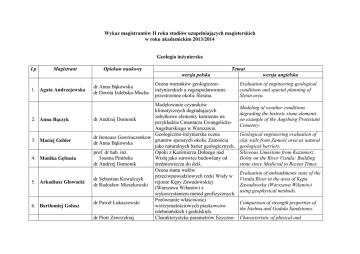 Wykaz magistrantów II roku studiów uzupełniających magisterskich w roku akademickim 2013/2014 Geologia inżynierska Lp Magistrant Opiekun naukowy Temat wersja polska 1. Agata Andrzejewska 2. Anna Bączyk 3. Maciej Gebler 4. Monika Gębusia 5. Arkadiusz Głowacki 6. Bartłomiej Gołasz dr Anna Bąkowska dr Dorota Izdebska-Mucha Ocena warunków geologicznoinżynierskich a zagospodarowanie przestrzenne okolic Ślesina. Modelowanie czynników klimatycznych degradujących zabytkowe elementy kamienne na dr Andrzej Domonik przykładzie Cmentarza EwangelickoAugsburskiego w Warszawie. Geologiczno-inżynierska ocena dr Ireneusz Gawriuczenkow gruntów spoistych okolic Zamościa dr Anna Bąkowska jako naturalnych barier geologicznych. prof. dr hab. inż. Opoki z Kazimierza Dolnego nad Joanna Pinińska Wisłą jako surowiec budowlany od dr Andrzej Domonik średniowiecza do dziś. Ocena stanu wałów przeciwpowodziowych rzeki Wisły w dr Sebastian Kowalczyk rejonie Kępy Zawadowskiej dr Radosław Mieszkowski (Warszawa Wilanów) z wykorzystaniem metod geofizycznych. Porównanie właściwości dr Paweł Łukaszewski wytrzymałościowych piaskowców istebniańskich i godulskich. dr Piotr Zawrzykraj Charakterystyka parametrów fizyczno- wersja angielska Evaluation of engineering-geological conditions and spacial planning of Ślesin area. Modeling of weather conditions degrading the historic stone elements on example of the Augsburg Protestant Cemetery. Geological engineering evaluation of clay soils from Zamość area as natural geological barriers. Siliceous Limestone from Kazimierz Dolny on the River Vistula: Building stone since Medieval to Recent Times. Evaluation of embankments state of the Vistula River in the area of Kępa Zawadowska (Warszawa Wilanów) using geophysical methods. Comparison of strength properties of the Istebna and Godula Sandstones. Characteristic of phisical and 7. Michał Gruczek dr Dorota Izdebska-Mucha 8. Sylwia Grzesik dr Ireneusz Gawriuczenkow Ocena ekspansywności gruntów dr Anna Bąkowska spoistych z okolic Zamościa. 9. Ewa Janiszewska 10. Sylwia Jasińska 11. Sylwia Kamionowska 12. Krzysztof Kępiński 13. Anna Koc 14. Kamil Koniński 15. Aleksandra Kucharz mechanicznych iłów zastoiskowych z okolic Wierzbicy k/Serocka. Geologiczno-inżynierska ocena warunków gruntowych w rejonie planowej Południowej Obwodnicy Warszawy na odcinku „węzeł” Puławska-Most Południowy. Badania wybranych właściwości geologiczno-inżynierskich gruntów z dr Dorota Izdebska-Mucha rejonu Kobyłki pod kątem oceny ich przydatności do budowy sztucznych barier geologicznych. Ocena właściwości deformacyjnych dr Ireneusz Gawriuczenkow gruntów z okolic Kobyłki /k Warszawy. Zobrazowanie powierzchni stropowej dr Sebastian Kowalczyk gruntów słabo przepuszczalnych z dr Radosław Mieszkowski wykorzystaniem metod geofizycznych w rejonie Tarchomina. Geologiczno – inżynierskie warunki dr hab., prof. UW projektowania południowej trasy Paweł Dobak mostowej w dzielnicy Wilanów w dr Sebastian Kowalczyk Warszawie. Wpływ warunków geologicznodr Piotr Zawrzykraj inżynierskich na możliwości dr Dominik Łukasiak zagospodarowania przestrzennego miejscowości Dawidy k/Warszawy. Charakterystyka czynników dr Dorota Izdebska-Mucha kształtujących właściwości pęczniejące prof. dr hab. Stanisław Matysiak dr Sebastian Kowalczyk mechanical parameters of ice-dammed clays from Wierzbica near Serock area. Evaluation of expansiveness of cohesive soils from Zamość area. Evaluation of engineering-geological conditions in the region of planned South Ring Road of Warsaw on the section “junction” Puławska-South Brigde. Analysis of selected geological engineering properties of soils from Kobyłka k/Warszawy area in the aspect of their barrier properties. Evaluation of deformation properties of soils from the Kobyłka area near Warsaw. Imaging of the top surface of aquitard? using geophysical methods in the area of Tarchomin. Engineering – geological conditions of the south bridge route designing in the Wilanów district in Warsaw. Influence of engineering geological conditions on site planning in the Dawidy area near Warsaw. Characteristic of factors determining swelling of selected clay soils from 16. Piotr Malczyk dr Jerzy Trzciński dr Stanisław Kamiński wybranych typów gruntów spoistych Polski . Analiza porównawcza uziarnienia badanego z zastosowaniem urządzenia optyczno-elektronicznego IPS U/A i metod normowych dla surowców skalnych z kopalni Kowala (Góry Świętokrzyskie) używanych w budownictwie drogowym. Zastosowania wybranych metod geofizycznych do obrazowania obiektów archeologicznych na przykładzie pradziejowych kopalń krzemienia w okolicach Borowni (k/ Ostrowca Świętokrzyskiego). 17. Piotr Mazur dr Radosław Mieszkowski dr Fabian Welc 18. Maciej Mokrzewski Ocena właściwości deformacyjnych dr Ireneusz Gawriuczenkow gruntów z okolic Wysokiego dr Emilia Wójcik Mazowieckiego. 19. Wojciech Mostowski 20. Bartłomiej Nuszkiewicz 21. Paweł Orliński dr hab., prof. UW Paweł Dobak dr Artur Dziedzic dr Artur Dziedzic Wpływ rynny szczęśliwicko – żoliborskiej na warunki geologiczno inżynierskie linii warszawskiego metra na odcinku od stacji Rondo Daszyńskiego do stacji Księcia Janusza. Porównanie właściwości geomechanicznych piaskowców godulskich z Wisły i Brennej. Geomechaniczna ocena odporności piaskowca tumlińskiego na działanie wybranych czynników deterioracyjnych. Poland. Comparative analysis of grain-size distribution with application of optical electronic analyzer IPS U/A and standard methods for rock raw materials from mine Kowala (Holy Cross Mountains) used in road construction. Applications of selected geophysical methods to imagining of archaeological objects by example of prehistoric flint mines in Borownia (near Ostrowiec Świętokrzyski). Evaluation of deformation properties of soils from Wysokie Mazowieckie area. Influence of Szczę