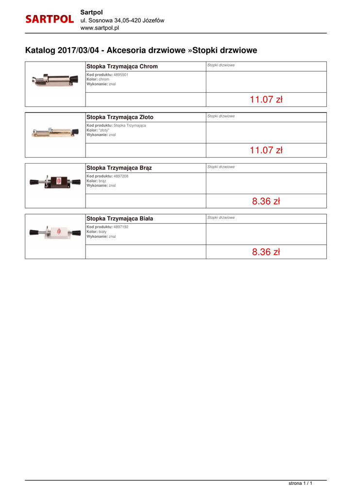 Sartpol ul. Sosnowa 34,05-420 Józefów www.sartpol.pl Katalog 2017/03/04 - Akcesoria drzwiowe »Stopki drzwiowe Stopka Trzymająca Chrom Stopki drzwiowe Kod produktu: 4895501 Kolor: chrom Wykonanie: znal 11.07 zł Stopka Trzymająca Złoto Stopki drzwiowe Kod produktu: Stopka Trzymająca Kolor: "złoty" Wykonanie: znal 11.07 zł Stopka Trzymająca Brąz Stopki drzwiowe Kod produktu: 4897208 Kolor: brąz Wykonanie: znal 8.36 zł Stopka Trzymająca Biała Stopki drzwiowe Kod produktu: 4897192 Kolor: biały Wykonanie: znal 8.36 zł strona 1 / 1