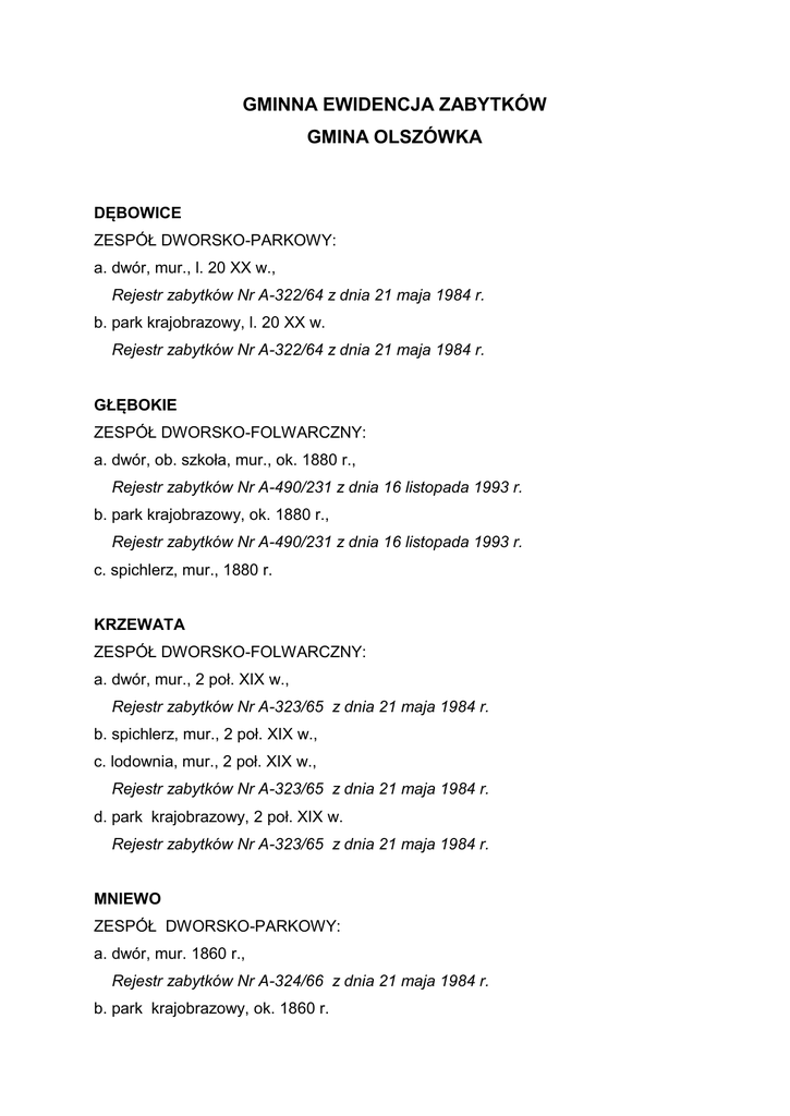 GMINNA EWIDENCJA ZABYTKÓW GMINA OLSZÓWKA DĘBOWICE ZESPÓŁ DWORSKO-PARKOWY: a. dwór, mur., l. 20 XX w., Rejestr zabytków Nr A-322/64 z dnia 21 maja 1984 r. b. park krajobrazowy, l. 20 XX w. Rejestr zabytków Nr A-322/64 z dnia 21 maja 1984 r. GŁĘBOKIE ZESPÓŁ DWORSKO-FOLWARCZNY: a. dwór, ob. szkoła, mur., ok. 1880 r., Rejestr zabytków Nr A-490/231 z dnia 16 listopada 1993 r. b. park krajobrazowy, ok. 1880 r., Rejestr zabytków Nr A-490/231 z dnia 16 listopada 1993 r. c. spichlerz, mur., 1880 r. KRZEWATA ZESPÓŁ DWORSKO-FOLWARCZNY: a. dwór, mur., 2 poł. XIX w., Rejestr zabytków Nr A-323/65 z dnia 21 maja 1984 r. b. spichlerz, mur., 2 poł. XIX w., c. lodownia, mur., 2 poł. XIX w., Rejestr zabytków Nr A-323/65 z dnia 21 maja 1984 r. d. park krajobrazowy, 2 poł. XIX w. Rejestr zabytków Nr A-323/65 z dnia 21 maja 1984 r. MNIEWO ZESPÓŁ DWORSKO-PARKOWY: a. dwór, mur. 1860 r., Rejestr zabytków Nr A-324/66 z dnia 21 maja 1984 r. b. park krajobrazowy, ok. 1860 r. Rejestr zabytków Nr A-324/66 z dnia 21 maja 1984 r. OLSZÓWKA POZOSTAŁOŚCI PARKU DWORSKIEGO, pocz. XX w. PONĘTÓW GÓRNY DRUGI PARK DWORSKI, ok. poł. XIX w. SZCZEPANÓW CMENTARZ EWANGELICKI, pocz. XX w. TOMASZEW WIATRAK KOŹLAK, drew., XIX w. Rejestr zabytków Nr A-353/95 z dnia 19 czerwca 1984 r. UMIEŃ ZESPÓŁ KOŚCIOŁA PAR. P. W. ŚW. MICHAŁA ARCHANIOŁA a. kościół, drew., 2 poł. XVII w., dobudowa kruchty 1993 r. Rejestr zabytków Nr A-118/705 z dnia 2 sierpnia 1969 r. b. dzwonnica, drew., XVIII w. ZESPÓŁ CMENTARZA RZYMSKOKATOLICKIEGO: a. cmentarz, pocz. XIX w., b. kaplica grobowa rodziny Byszewskich, mur., 1868 r. ZAWADKA CMENTARZ EWANGELICKI, XIX w. CMENTARZ EWANGELICKI, XIX w.