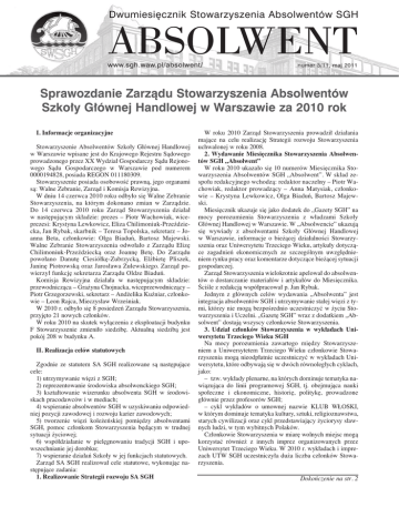 Dwumiesi´cznik Stowarzyszenia Absolwentów SGH ABSOLWENT www.sgh.waw.pl/absolwent/ numer 3/11, maj 2011 Sprawozdanie Zarzàdu Stowarzyszenia Absolwentów Szko∏y G∏ównej Handlowej w Warszawie za 2010 rok I. Informacje organizacyjne Stowarzyszenie Absolwentów Szko∏y G∏ównej Handlowej w Warszawie wpisane jest do Krajowego Rejestru Sàdowego prowadzonego przez XX Wydzia∏ Gospodarczy Sàdu Rejonowego Sàdu Gospodarczego w Warszawie pod numerem 0000194828, posiada REGON 011180309. Stowarzyszenie posiada osobowoÊç prawnà, jego organami sà: Walne Zebranie, Zarzàd i Komisja Rewizyjna. W dniu 14 czerwca 2010 roku odby∏o si´ Walne Zebranie Stowarzyszenia, na którym dokonano zmian w Zarzàdzie. Do 14 czerwca 2010 roku Zarzàd Stowarzyszenia dzia∏a∏ w nast´pujàcym sk∏adzie: prezes – Piotr Wachowiak, wiceprezesi: Krystyna Lewkowicz, Eliza Chilimoniuk-Przeêdziecka, Jan Rybak, skarbnik – Teresa Topolska, sekretarz – Joanna Beta, cz∏onkowie: Olga Biaduƒ, Bartosz Majewski. Walne Zebranie Stowarzyszenia odwo∏a∏o z Zarzàdu Eliz´ Chilimoniuk-Przeêdzieckà oraz Joann´ Bet´. Do Zarzàdu powo∏ano Danut´ Ciesió∏k´-Zubrzyckà, El˝biet´ Pliszek, Janin´ Piotrowskà oraz Jaros∏awa ˚ulewskiego. Zarzàd powierzy∏ funkcj´ sekretarza Zarzàdu Oldze Biaduƒ. Komisja Rewizyjna dzia∏a∏a w nast´pujàcym sk∏adzie: przewodniczàca – Gra˝yna Chojnacka, wiceprzewodniczàcy – Piotr Grzegorzewski, sekretarz – And˝elika Kuêniar, cz∏onkowie – Leon Rajca, Mieczys∏aw WrzeÊniak. W 2010 r. odby∏o si´ 8 posiedzeƒ Zarzàdu Stowarzyszenia, przyj´to 21 nowych cz∏onków. W roku 2010 na skutek wy∏àczenia z eksploatacji budynku F Stowarzyszenie zmieni∏o siedzib´. Aktualnà siedzibà jest pokój 208 w budynku A. II. Realizacja celów statutowych Zgodnie ze statutem SA SGH realizowane sà nast´pujàce cele: 1) utrzymywanie wi´zi z SGH; 2) reprezentowanie Êrodowiska absolwenckiego SGH; 3) kszta∏towanie wizerunku absolwenta SGH w Êrodowiskach pracodawców i w mediach; 4) wspieranie absolwentów SGH w uzyskiwaniu odpowiedniej pozycji zawodowej i rozwoju karier zawodowych; 5) tworzenie wi´zi kole˝eƒskiej pomi´dzy absolwentami SGH, pomoc cz∏onkom Stowarzyszenia b´dàcym w trudnej sytuacji ˝yciowej; 6) wspó∏dzia∏anie w piel´gnowaniu tradycji SGH i upowszechnianie jej dorobku; 7) wspieranie dzia∏aƒ Szko∏y w jej funkcjach statutowych. Zarzàd SA SGH realizowa∏ cele statutowe, wykonujàc nast´pujàce zadania: 1. Realizowanie Strategii rozwoju SA SGH W roku 2010 Zarzàd Stowarzyszenia prowadzi∏ dzia∏ania majàce na celu realizacj´ Strategii rozwoju Stowarzyszenia uchwalonej w roku 2008. 2. Wydawanie Miesi´cznika Stowarzyszenia Absolwentów SGH „Absolwent” W roku 2010 ukaza∏o si´ 10 numerów Miesi´cznika Stowarzyszenia Absolwentów SGH „Absolwent”. W sk∏ad zespo∏u redakcyjnego wchodzà: redaktor naczelny – Piotr Wachowiak, redaktor prowadzàcy – Anna Matysiak, cz∏onkowie – Krystyna Lewkowicz, Olga Biaduƒ, Bartosz Majewski. Miesi´cznik ukazuje si´ jako dodatek do „Gazety SGH” na mocy porozumienia Stowarzyszenia z w∏adzami Szko∏y G∏ównej Handlowej w Warszawie. W „Absolwencie” ukazujà si´ wywiady z absolwentami Szko∏y G∏ównej Handlowej w Warszawie, informacje o bie˝àcej dzia∏alnoÊci Stowarzyszenia oraz Uniwersytetu Trzeciego Wieku, artyku∏y dotyczàce zagadnieƒ ekonomicznych ze szczególnym uwzgl´dnieniem rynku pracy oraz komentarze dotyczàce bie˝àcej sytuacji gospodarczej. Zarzàd Stowarzyszenia wielokrotnie apelowa∏ do absolwentów o dostarczanie materia∏ów i artyku∏ów do Miesi´cznika. ÂciÊle z redakcjà wspó∏pracowa∏ p. Jan Rybak. Jednym z g∏ównych celów wydawania „Absolwenta” jest integracja absolwentów SGH i utrzymywanie sta∏ej wi´zi z tymi, którzy nie mogà bezpoÊrednio uczestniczyç w ˝yciu Stowarzyszenia i Uczelni. „Gazet´ SGH” wraz z dodatkiem „Absolwent” dostajà wszyscy cz∏onkowie Stowarzyszenia. 3. Udzia∏ cz∏onków Stowarzyszenia w wyk∏adach Uniwersytetu Trzeciego Wieku SGH Na mocy porozumienia zawartego mi´dzy Stowarzyszeniem a Uniwersytetem Trzeciego Wieku cz∏onkowie Stowarzyszenia mogà nieodp∏atnie uczestniczyç w wyk∏adach Uniwersytetu, które odbywajà si´ w dwóch równoleg∏ych cyklach, jako: – tzw. wyk∏ady plenarne, na których dominuje tematyka nawiàzujàca do linii programowej SGH, tj. obejmujàca nauki spo∏eczne i ekonomiczne, histori´, polityk´, prowadzone g∏ównie przez profesorów SGH; – cykl wyk∏adów o umownej nazwie KLUB W¸OSKI, w którym dominuje tematyka kultury, sztuki, religioznawstwa, starych cywilizacji oraz cykl przedstawiajàcy ˝yciorysy s∏awnych ludzi, w tym wybitnych Polaków. Cz∏onkowie Stowarzyszenia w miar´ wolnych miejsc mogà korzystaç równie˝ z innych imprez organizowanych przez Uniwersytet Trzeciego Wieku. W 2010 r. wyk∏adach i imprezach UTW SGH uczestniczy∏a du˝a liczba cz∏onków Stowarzyszenia. Dokoƒczenie na str. 2 Dokoƒczenie ze str. 1 4. Wydawanie Karty Absolwenta SGH Stowarzyszenie we wspó∏pracy z SGH do lipca 2010 r. wydawa∏o Kart´ Absolwenta SGH. Otrzyma∏o jà ok. 30 absolwentów. Zosta∏ wzbogacony program rabatowy. Zarzàd podpisa∏ porozumienie z w∏adzami Uczelni dotyczàce zasad korzystania z Karty Absolwenta od 1 lipca 2010 r. 5. Udzia∏ w zorganizowaniu uroczystoÊci wr´czenia dyplomów licencjata i magistra absolwentom SGH Zarzàd Stowarzyszenia uczestniczy∏ w zorganizowaniu uroczystoÊci wr´czenia dyplomów licencjata i magistra absolwentom SGH. Podczas uroczystoÊci Prezes Stowarzyszenia przedstawi∏ dzia∏alnoÊç Stowarzyszenia. 6. Utrzymywanie kontaktów z w∏adzami Uczelni W roku 2010 r. Prezes Stowarzyszenia uczestniczy∏ we wszystkich posiedzeniach Senatu SGH, p. Jan Rybak uczestniczy∏ w posiedzeniach Rady Bibliotecznej SGH. 7. Kontynuowanie prac dotyczàcych wydania II tomu „Ksi´g