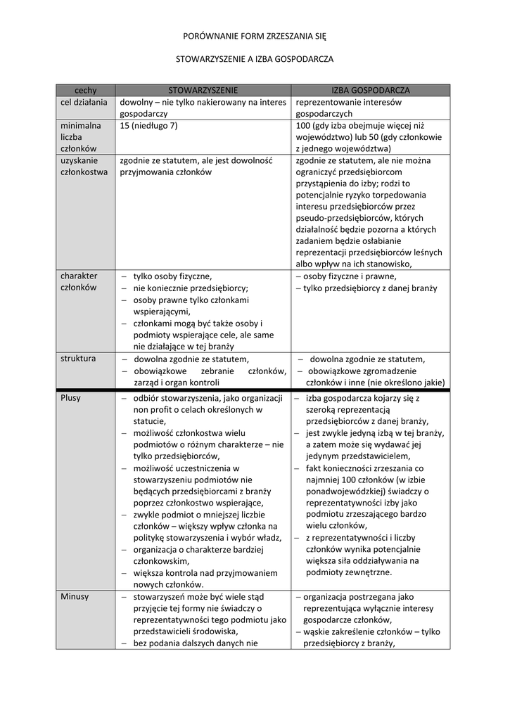 PORÓWNANIE FORM ZRZESZANIA SIĘ STOWARZYSZENIE A IZBA GOSPODARCZA cechy cel działania minimalna liczba członków uzyskanie członkostwa charakter członków struktura Plusy Minusy STOWARZYSZENIE dowolny – nie tylko nakierowany na interes gospodarczy 15 (niedługo 7) zgodnie ze statutem, ale jest dowolność przyjmowania członków tylko osoby fizyczne, nie koniecznie przedsiębiorcy; osoby prawne tylko członkami wspierającymi, członkami mogą być także osoby i podmioty wspierające cele, ale same nie działające w tej branży dowolna zgodnie ze statutem, obowiązkowe zebranie członków, zarząd i organ kontroli odbiór stowarzyszenia, jako organizacji non profit o celach określonych w statucie, możliwość członkostwa wielu podmiotów o różnym charakterze – nie tylko przedsiębiorców, możliwość uczestniczenia w stowarzyszeniu podmiotów nie będących przedsiębiorcami z branży poprzez członkostwo wspierające, zwykle podmiot o mniejszej liczbie członków – większy wpływ członka na politykę stowarzyszenia i wybór władz, organizacja o charakterze bardziej członkowskim, większa kontrola nad przyjmowaniem nowych członków. stowarzyszeń może być wiele stąd przyjęcie tej formy nie świadczy o reprezentatywności tego podmiotu jako przedstawicieli środowiska, bez podania dalszych danych nie IZBA GOSPODARCZA reprezentowanie interesów gospodarczych 100 (gdy izba obejmuje więcej niż województwo) lub 50 (gdy członkowie z jednego województwa) zgodnie ze statutem, ale nie można ograniczyć przedsiębiorcom przystąpienia do izby; rodzi to potencjalnie ryzyko torpedowania interesu przedsiębiorców przez pseudo-przedsiębiorców, których działalność będzie pozorna a których zadaniem będzie osłabianie reprezentacji przedsiębiorców leśnych albo wpływ na ich stanowisko, osoby fizyczne i prawne, tylko przedsiębiorcy z danej branży dowolna zgodnie ze statutem, obowiązkowe zgromadzenie członków i inne (nie określono jakie) izba gospodarcza kojarzy się z szeroką reprezentacją przedsiębiorców z danej branży, jest zwykle jedyną izbą w tej branży, a zatem może się wydawać jej jedynym przedstawicielem, fakt konieczności zrzeszania co najmniej 100 członków (w izbie ponadwojewódzkiej) świadczy o reprezentatywności izby jako podmiotu zrzeszającego bardzo wielu członków, z reprezentatywności i liczby członków wynika potencjalnie większa siła oddziaływania na podmioty zewnętrzne. organizacja postrzegana jako reprezentująca wyłącznie interesy gospodarcze członków, wąskie zakreślenie członków – tylko przedsiębiorcy z branży, PORÓWNANIE FORM ZRZESZANIA SIĘ STOWARZYSZENIE A IZBA GOSPODARCZA sposób ocenić liczby członków stowarzyszenia jako podmiotu dużego (przecież wystarczy 15 a niedługo 7 członków żeby je założyć) brak możliwości blokowania dostępu do organizacji (możliwy przerost i oderwanie się interesów władz od interesów członków), związane z brakiem możliwości blokowania dostępu – „przejęcie” organizacji przez pseudoprzedsiębiorców albo podmioty zainteresowane osłabieniem stanowiska przedsiębiorców leśnych, droższa w utrzymaniu (ze względu na utrzymywanie biura organizacji, rozbudowaną strukturę organizacyjną) W mojej ocenie izba gospodarcza jest formułą bardziej dopasowaną do ochrony interesów gospodarczych dużej grupy przedsiębiorców, będąc de facto „wyspecjalizowanym stowarzyszeniem”. Przy wszystkich minusach związanych z oderwaniem władz od członków i ograniczeniem członkostwa izba budzi skojarzenie z podmiotem o charakterze ogólnopolskim i powszechnym – w przeciwieństwie do stowarzyszenia. Stowarzyszenie mogłoby bronić się na polu reprezentatywności albo poprzez uwypuklenie takiego charakteru w nazwie (np. „Ogólnopolskie Stowarzyszenie Przedsiębiorców Leśnych”) albo poprzez zjednoczenie sił z innymi stowarzyszeniami w związku stowarzyszeń o nazwie wskazującej na powszechność reprezentacji. Oczywiście najlepszą „obroną” jest powszechność wyrażająca się w liczbie członków – co należałoby podkreślać. Jak wynika z powyższego przewaga formy izby gospodarczej przejawia się w zasadzie jedynie w odbiorze tego podmiotu na zewnątrz, a więc w czynniku psychologicznym. W szczegółach rozwiązań merytorycznych i korzystności dla poszczególnych członków lepiej w porównaniu zdaje się wypadać stowarzyszenie, jako podmiot bardziej elastyczny. Samo utworzenie izby gospodarczej należałoby oceniać pozytywnie w sytuacji, gdyby brak było dotychczas jednolitej lub co najmniej większościowej reprezentacji interesów przedsiębiorców leśnych. W sytuacji, gdy taka istnieje, tworzenie nowego podmiotu powoduje tylko rozbicie dotychczasowej reprezentacji i osłabienie pozycji przedsiębiorców, którzy będą reprezentowani przez więcej niż jedną dużą organizację. Zamiast jednoczyć spowoduje to zatem podział – chyba, że wszyscy członkowie SPL zostaliby również członkami Izby - co nie jest wykluczone, ale stawiałoby pod znakiem zapytania celowość istnienia takiej podwójnej reprezentacji.
