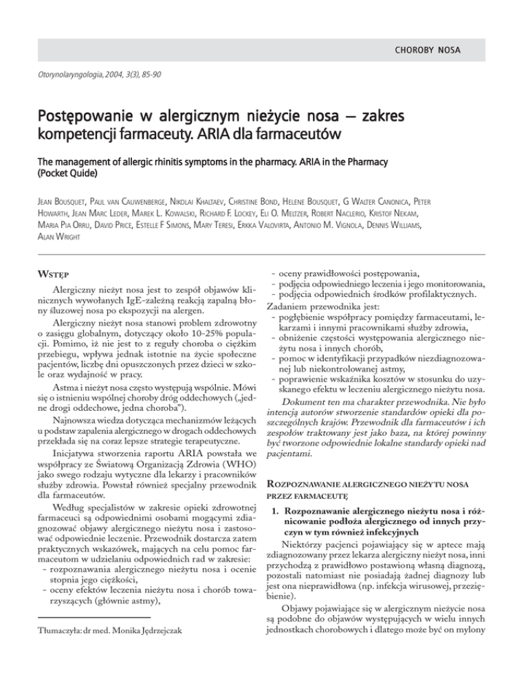 Bousquet J., van Cauwenberge P., Khaltaev M. i wsp.: Postêpowanie w alergicznym nie¿ycie nosa – zakres kompetencji farmaceuty. . . . 85 CHOROBY NOSA Otorynolaryngologia, 2004, 3(3), 85-90 Postêpowanie w alergicznym nie¿ycie nosa – zakres kompetencji farmaceuty farmaceuty.. ARIA dla farmaceutów The management of allergic rhinitis symptoms in the pharmacy pharmacy.. ARIA in the Pharmacy (Pocket Quide) JEAN BOUSQUET, PAUL VAN CAUWENBERGE, NIKOLAI KHALTAEV, CHRISTINE BOND, HELENE BOUSQUET, G WALTER CANONICA, PETER HOWARTH, JEAN MARC LEDER, MAREK L. KOWALSKI, RICHARD F. LOCKEY, ELI O. MELTZER, ROBERT NACLERIO, KRISTOF NEKAM, MARIA PIA ORRU, DAVID PRICE, ESTELLE F SIMONS, MARY TERESI, ERKKA VALOVIRTA, ANTONIO M. VIGNOLA, DENNIS WILLIAMS, ALAN WRIGHT WSTÊP Alergiczny nie¿yt nosa jest to zespó³ objawów klinicznych wywo³anych IgE-zale¿n¹ reakcj¹ zapaln¹ b³ony œluzowej nosa po ekspozycji na alergen. Alergiczny nie¿yt nosa stanowi problem zdrowotny o zasiêgu globalnym, dotycz¹cy oko³o 10-25% populacji. Pomimo, i¿ nie jest to z regu³y choroba o ciê¿kim przebiegu, wp³ywa jednak istotnie na ¿ycie spo³eczne pacjentów, liczbê dni opuszczonych przez dzieci w szkole oraz wydajnoœæ w pracy. Astma i nie¿yt nosa czêsto wystêpuj¹ wspólnie. Mówi siê o istnieniu wspólnej choroby dróg oddechowych („jedne drogi oddechowe, jedna choroba”). Najnowsza wiedza dotycz¹ca mechanizmów le¿¹cych u podstaw zapalenia alergicznego w drogach oddechowych przek³ada siê na coraz lepsze strategie terapeutyczne. Inicjatywa stworzenia raportu ARIA powsta³a we wspó³pracy ze Œwiatow¹ Organizacj¹ Zdrowia (WHO) jako swego rodzaju wytyczne dla lekarzy i pracowników s³u¿by zdrowia. Powsta³ równie¿ specjalny przewodnik dla farmaceutów. Wed³ug specjalistów w zakresie opieki zdrowotnej farmaceuci s¹ odpowiednimi osobami mog¹cymi zdiagnozowaæ objawy alergicznego nie¿ytu nosa i zastosowaæ odpowiednie leczenie. Przewodnik dostarcza zatem praktycznych wskazówek, maj¹cych na celu pomoc farmaceutom w udzielaniu odpowiednich rad w zakresie: - rozpoznawania alergicznego nie¿ytu nosa i ocenie stopnia jego ciê¿koœci, - oceny efektów leczenia nie¿ytu nosa i chorób towarzysz¹cych (g³ównie astmy), T³umaczy³a: dr med. Monika Jêdrzejczak - oceny prawid³owoœci postêpowania, - podjêcia odpowiedniego leczenia i jego monitorowania, - podjêcia odpowiednich œrodków profilaktycznych. Zadaniem przewodnika jest: - pog³êbienie wspó³pracy pomiêdzy farmaceutami, lekarzami i innymi pracownikami s³u¿by zdrowia, - obni¿enie czêstoœci wystêpowania alergicznego nie¿ytu nosa i innych chorób, - pomoc w identyfikacji przypadków niezdiagnozowanej lub niekontrolowanej astmy, - poprawienie wskaŸnika kosztów w stosunku do uzyskanego efektu w leczeniu alergicznego nie¿ytu nosa. Dokument ten ma charakter przewodnika. Nie by³o intencj¹ autorów stworzenie standardów opieki dla poszczególnych krajów. Przewodnik dla farmaceutów i ich zespo³ów traktowany jest jako baza, na której powinny byæ tworzone odpowiednie lokalne standardy opieki nad pacjentami. ROZPOZNAWANIE ALERGICZNEGO NIE¯Y TU NOSA PRZEZ FARMACEUTÊ 1. Rozpoznawanie alergicznego nie¿ytu nosa i ró¿nicowanie pod³o¿a alergicznego od innych przyczyn w tym równie¿ infekcyjnych Niektórzy pacjenci pojawiaj¹cy siê w aptece maj¹ zdiagnozowany przez lekarza alergiczny nie¿yt nosa, inni przychodz¹ z prawid³owo postawion¹ w³asn¹ diagnoz¹, pozostali natomiast nie posiadaj¹ ¿adnej diagnozy lub jest ona nieprawid³owa (np. infekcja wirusowej, przeziêbienie). Objawy pojawiaj¹ce siê w alergicznym nie¿ycie nosa s¹ podobne do objawów wystêpuj¹cych w wielu innych jednostkach chorobowych i dlatego mo¿e byæ on mylony Otorynolaryngologia, 2004, 3(3), 85-90 86 z infekcj¹ wirusow¹, tzw. przeziêbieniem lub z przewlek³ym zapaleniem zatok. O alergicznym nie¿ycie nosa œwiadczy zazwyczaj obecnoœæ œwi¹du nosa, wodnistego wycieku z nosa, kichania oraz objawów ze strony oczu. Objawy sugeruj¹ce alergiczny nie¿yt nosa Wystêpowanie dwóch lub wiêcej z poni¿szych objawów przez ponad godzinê w wiêkszoœæ dni - wyciek wodnistej wydzieliny z nosa - kichanie, szczególnie napadowe - zatkanie nosa - œwi¹d nosa - zapalenie spojówek Zaklasyfikuj i okreœl stopieñ ciê¿koœci choroby Objawy zazwyczaj nie zwi¹zane z alergicznym nie¿ytem nosa - objawy ze strony jamy ustnej - zatkanie nosa bez innych objawów towarzysz¹cych - wydzielina œluzowo-ropna - sp³ywanie wydzieliny po tylnej œcianie gard³a - z pogrubieniem œluzówki - z/bez wycieku wodnistej wydzieliny z nosa - ból - krwawienie z nosa - brak wêchu Odeœlij pacjenta natychmiast do lekarza 2. Ocena stopnia ciê¿koœci alergicznego nie¿ytu nosa Wed³ug obecnej klasyfikacji alergiczny nie¿yt nosa dzielimy na okresowy i przewlek³y w miejsce poprzedniego podzia³u na sezonowy i ca³oroczny. Okresowy • przez mniej ni¿ 4 dni w tygodniu • lub krócej ni¿ 4 tygodnie £agodny normalny sen Pr zewlek³y * przez wiêcej ni¿ 4 dni w tygodniu * i trwaj¹cy ponad 4 tygodnie Umiarkowany – ciê¿ki jeden lub wiêcej z poni¿szych objawów • objawy nie wp³ywaj¹ na czynnoœci * zaburzenia snu codzienne chorego, uprawianie sportu, * zaburzenia wykonywania czynnoœci wypoczynek codziennych, uprawiania sportu • normalna, wydajna praca i nauka i wypoczynku • brak objawów sprawiaj¹cych istotne * trudnoœci w wykonywaniu pracy i nauce utrudnienia w ¿yciu codziennym * wystêpowanie uci¹¿liwych objawów 3. Rola farmaceuty w decydowaniu o odes³aniu pacjenta do lekarza Odes³anie pacjenta do lekarza nale¿y rozwa¿yæ w nastêpuj¹cych sytuacjach: - przewlekle wystêpuj¹ce objawy alergicznego nie¿ytu nosa o stopniu umiarkowanym lub ciê¿kim (wstêpne leczenie mo¿e byæ prowadzone przez farmaceutê w okresie oczekiwania na wizytê u lekarza), - objawy kliniczne sugeruj¹ce niezdiagnozowan¹ lub niekontrolowan¹ astmê (np. œwis
