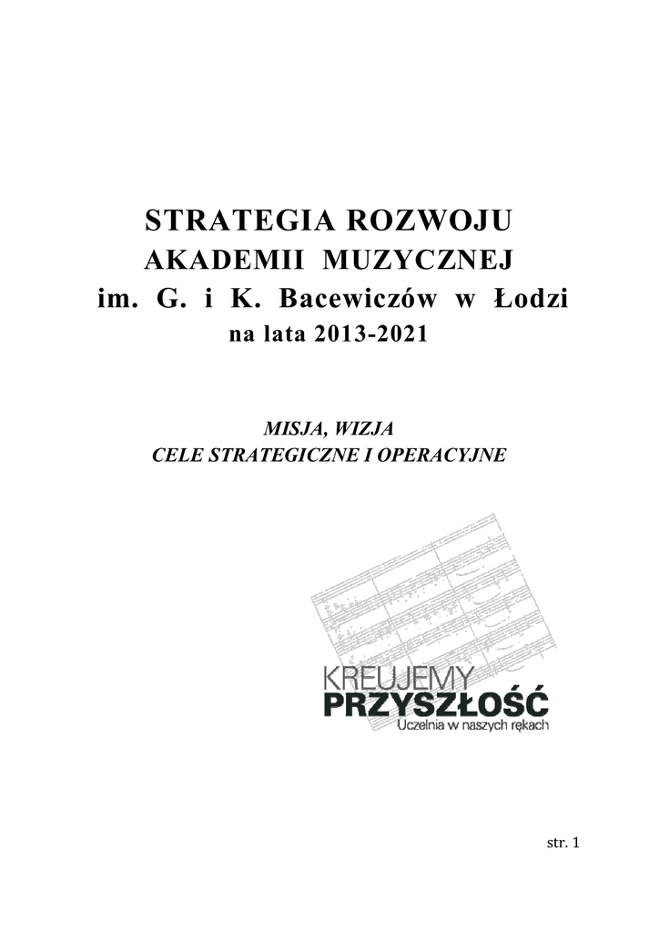 STRATEGIA ROZWOJU AKADEMII MUZYCZNEJ im. G. i K. Bacewiczów w Łodzi na lata 2013-2021 MISJA, WIZJA CELE STRATEGICZNE I OPERACYJNE str. 1 KREUJEMY PRZYSZŁOŚĆ: UCZELNIA W NASZYCH RĘKACH MISJA WIZJA --------------------------------------------------------------------------------------------------------------------------NOWOCZESNOŚĆ WROŚNIĘTA W TRADYCJĘ - humanistyczna postawa i mistrzowski warsztat - klasyczne instrumentarium i nowoczesne media elektroniczne - twórcy i wykonawcy nowoczesnej muzyki STANDARDY I NOWATORSTWO nowoczesne metody pedagogiczne i badawcze kierunki unikatowe związane z nowymi mediami i technologiami specjalizacja w wykonywaniu muzyki dawnej i najnowszej KREOWANIE SZTUKI I ARTYSTÓW - wszechstronna edukacja od licencjatu do doktoratu - autorytet mistrza kształtujący osobowość adepta sztuki - partnerstwo motywujące do ciągłego rozwoju AUTORYTET W SPRAWACH MUZYCZNYCH wysoko wykwalifikowani muzycy i teoretycy znajomość najnowszych nurtów artystycznych funkcje opiniotwórcze w dziedzinie sztuki elitarnej SZTUKA W SYMBIOZIE Z NAUKĄ - talent i intuicja artystyczna ugruntowane wiedzą - badania własne w zakresie historii muzyki, teorii i estetyki - uczestnictwo w ruchu naukowym i artystycznym WSPÓŁPRACA INSTYTUCJONALNA powiązania z uczelniami w regionie międzyregionalna sieć uczelni muzycznych umowy partnerskie i wymiana międzynarodowa WZBOGACANIE DZIEDZICTWA KULTURY - koncerty i spektakle operowe - nagrania archiwalne i komercyjne - publikacje prac naukowych OFERTA RYNKOWA impresariat i biuro karier profesjonalne studio nagrań dla potrzeb fonografii i filmu wydawnictwo muzyczne: nuty, książki, czasopismo DLA MIASTA I REGIONU - kształcenie kadr - wiodąca rola w animacji kultury i kształtowaniu gustów - udział w projektach multimedialnych UDZIAŁ W STRATEGII ROZWOJU MIASTA I REGIONU kształtowanie środowiska i wydarzeń artystycznych centrum kultury, edukacji i dokumentacji muzycznej promocja miasta poprzez osiągnięcia artystyczne i naukowe - str. 2 KREUJEMY PRZYSZŁOŚĆ: UCZELNIA W NASZYCH RĘKACH MISJA i WIZJA AKADEMII MUZYCZNEJ W ŁODZI I.MISJA 1. NOWOCZESNOŚĆ WROŚNIĘTA W TRADYCJĘ 1.1. Humanistyczna postawa i mistrzowski warsztat Akademia jako wspólnota Pedagogów i Studentów kieruje się ideałami wolności i tolerancji artystycznej i intelektualnej. Sztuka traktowana jest jako nośnik wartości artystycznych oraz etycznych, wpływających na rozwój jednostki i więzi społecznych. Dla spełnienia tej funkcji niezbędne jest dążenie do prawdy artystycznej i naukowej, uczciwość wobec siebie i innych oraz ciągłe doskonalenie warsztatu artystycznego i naukowego, gwarantujące utrzymywanie elitarnego poziomu. 1.2. Klasyczne instrumentarium i nowoczesne media elektroniczne Kultura muzyczna postrzegana jest jako całość rozciągająca się między biegunami sztuki dawnej i nowoczesnej, obejmująca rozległy wachlarz stylów i wartości, traktowanych jako równoprawne i jednakowo ważne. Łączymy tradycję z nowoczesnością – kultywując tradycyjne estetyki, środki i techniki wykonawcze, z jednoczesnym zainteresowaniem najnowszymi nurtami artystycznymi. 1.3. Twórcy i wykonawcy nowoczesnej muzyki Nastawieni na kreację muzyki przyszłości profesorowie i studenci kompozycji dostarczają wykonawcom okazji do bezpośredniego kontaktu i oswojenia się ze specyfiką sztuki awangardowej. Współpraca między nimi przyczynia się do konfrontacji idei z praktyką, do rozszerzania repertuaru, pogłębiania wrażliwości artystycznej, rozwoju osobowości. Przygotowuje do podejmowania w przyszłości nieznanych jeszcze wyzwań artystycznych. 2. KREOWANIE SZTUKI I ARTYSTÓW 2.1. Wszechstronna edukacja od licencjatu do doktoratu Akademia stwarza pełną ofertę edukacyjną – w zakresie sztuki wykonawczej, teorii muzyki i kompozycji, edukacji muzycznej, rytmiki i choreografii, na wszystkich szczeblach wyższej str. 3 uczelni. Umożliwia wybór własnej ścieżki edukacyjnej – tak w kierunku wąskiej specjalizacji, jak i współdziałania ze specjalistami z różnych dziedzin sztuk muzycznych lub innych specjalności. Dzięki temu absolwenci Akademii znajdują zatrudnienie w różnych placówkach w kraju i za granicą, jak również są zdolni prowadzić samodzielną działalność. 2.2. Autorytet mistrza kształtujący osobowość adepta sztuki Podstawową formą edukacji jest indywidualny kontakt adepta sztuki z pedagogiem posiadającym bogaty dorobek, wiedzę, umiejętności i doświadczenie. Relacja mistrz – uczeń symbolizuje trwałe wartości sztuki i rangę indywidualności artystycznej. Zawiera ładunek emocjonalny, wzmacniający efektywność procesu dydaktycznego, dzięki czemu uczeń stopniowo staje się partnerem mistrza. Poczucie etycznej odpowiedzialności za skutki swego oddziaływania motywuje mistrza do weryfikacji metod, autorefleksji, do ciągłego doskonalenia się. Konsekwencją jest indywidualizacja procesu dydaktycznego, poszukiwanie najbardziej efektywnego sposobu dzielenia się tajnikami warsztatu wykonawczego, kształtowania postawy estetycznej i etycznej, wpajania nawyków artystycznych. Bycie mistrzem przejawia się poprzez postawę otwartą i gotowość do uczenia się przez całe życie. 2.3. Partnerstwo motywujące do ciągłego rozwoju Właściwie rozumiane partnerstwo jest dla ucznia dopingiem do większego wysiłku i staranności w realizacji zadań. Rozwija dyscyplinę wewnętrzną i nawyk poszukiwania rozwiązań poprzez adaptację wiedzy i wzorców postępowania do nowych sytuacji. Partnerski model edukacji kształtuje postawę samodzielności i systematyczności działania, ciągłego uczenia się i doskonalenia. Rola partnera doceniana jest również na etapie działalności profesjonalnej, kiedy dawny nauczyciel pozostaje doradcą i mentorem. Dzięki temu modelowi nawet wybitni artyści są skłonni do podejmowania pracy pedagogicznej. 3. SZTUKA W SYMBIOZIE Z NAUKĄ 3.1. Talent i intui