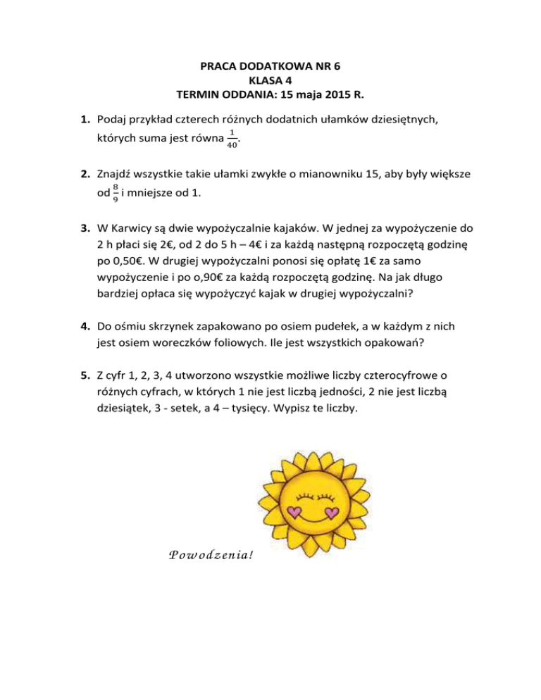 PRACA DODATKOWA NR 6 KLASA 4 TERMIN ODDANIA: 15 maja 2015 R. 1. Podaj przykład czterech różnych dodatnich ułamków dziesiętnych, których suma jest równa . 2. Znajdź wszystkie takie ułamki zwykłe o mianowniku 15, aby były większe od i mniejsze od 1. 3. W Karwicy są dwie wypożyczalnie kajaków. W jednej za wypożyczenie do 2 h płaci się 2€, od 2 do 5 h – 4€ i za każdą następną rozpoczętą godzinę po 0,50€. W drugiej wypożyczalni ponosi się opłatę 1€ za samo wypożyczenie i po o,90€ za każdą rozpoczętą godzinę. Na jak długo bardziej opłaca się wypożyczyć kajak w drugiej wypożyczalni? 4. Do ośmiu skrzynek zapakowano po osiem pudełek, a w każdym z nich jest osiem woreczków foliowych. Ile jest wszystkich opakowań? 5. Z cyfr 1, 2, 3, 4 utworzono wszystkie możliwe liczby czterocyfrowe o różnych cyfrach, w których 1 nie jest liczbą jedności, 2 nie jest liczbą dziesiątek, 3 - setek, a 4 – tysięcy. Wypisz te liczby. Pow odzenia! PRACA DODATKOWA NR 6 KLASA 5 TERMIN ODDANIA: 15 maja 2015 R. 1. Dwie przekątne wychodzące z jednego wierzchołka pięciokąta dzielą go na dwa różne trójkąty równoboczne i jeden trójkąt prostokątny równoramienny. Ustal miary kątów tego pięciokąta. 2. Oto stan oszczędności klas VI-tych: klasa VI a – 360 zł, klasa VI b – 240 zł, klasa VI c – 300 zł, VI d 300zł. Jak sprawiedliwie podzielić między nimi nagrodę za oszczędzanie w wysokości 60 zł? 3. W pokoju znajdują się 4 osoby. Średnia ich wieku wynosi 15 1 roku. 2 Przyszła piąta osoba - Matylda i średnia wieku w pokoju była teraz 16 lat. Ile lat ma Matylda? 4. Balbina miała 100 cukierków. Wszystkie cukierki włożyła do pięciu miseczek w ten sposób, że w pierwszych dwóch miseczkach jest łącznie 30 cukierków, w drugiej i trzeciej miseczce są łącznie 33 cukierki, w trzeciej i czwartej miseczce jest razem 41 cukierków, a w piątej miseczce jest o 11 cukierków więcej niż w pierwszej. Do której miseczki Balbina włożyła najmniej cukierków? 5. W trapezie prostokątnym ABCD, 90°. Oblicz pozostałe kąty tego trapezu wiedząc, że jest dwa razy mniejszy od kąta, jaki tworzy przekątna AC z podstawą AB i jest jednocześnie 6 razy mniejszy od kąta utworzonego między tą samą przekątną AC, a ramieniem BC. Pow odzenia!