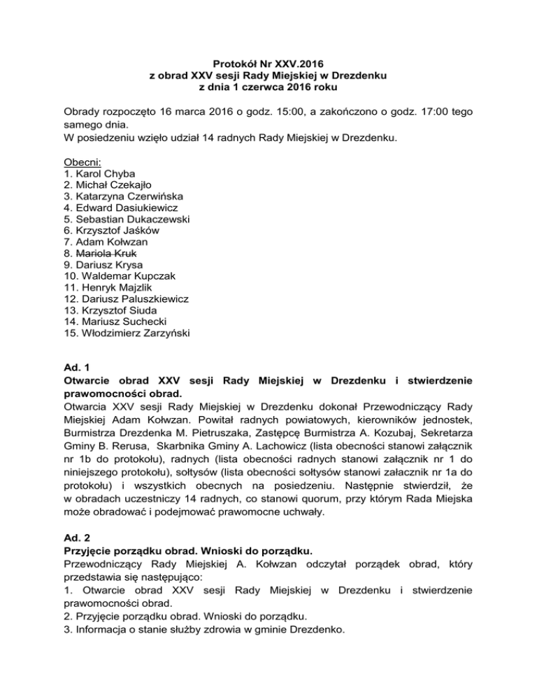 Protokół Nr XXV.2016 z obrad XXV sesji Rady Miejskiej w Drezdenku z dnia 1 czerwca 2016 roku Obrady rozpoczęto 16 marca 2016 o godz. 15:00, a zakończono o godz. 17:00 tego samego dnia. W posiedzeniu wzięło udział 14 radnych Rady Miejskiej w Drezdenku. Obecni: 1. Karol Chyba 2. Michał Czekajło 3. Katarzyna Czerwińska 4. Edward Dasiukiewicz 5. Sebastian Dukaczewski 6. Krzysztof Jaśków 7. Adam Kołwzan 8. Mariola Kruk 9. Dariusz Krysa 10. Waldemar Kupczak 11. Henryk Majzlik 12. Dariusz Paluszkiewicz 13. Krzysztof Siuda 14. Mariusz Suchecki 15. Włodzimierz Zarzyński Ad. 1 Otwarcie obrad XXV sesji Rady Miejskiej w Drezdenku i stwierdzenie prawomocności obrad. Otwarcia XXV sesji Rady Miejskiej w Drezdenku dokonał Przewodniczący Rady Miejskiej Adam Kołwzan. Powitał radnych powiatowych, kierowników jednostek, Burmistrza Drezdenka M. Pietruszaka, Zastępcę Burmistrza A. Kozubaj, Sekretarza Gminy B. Rerusa, Skarbnika Gminy A. Lachowicz (lista obecności stanowi załącznik nr 1b do protokołu), radnych (lista obecności radnych stanowi załącznik nr 1 do niniejszego protokołu), sołtysów (lista obecności sołtysów stanowi załacznik nr 1a do protokołu) i wszystkich obecnych na posiedzeniu. Następnie stwierdził, że w obradach uczestniczy 14 radnych, co stanowi quorum, przy którym Rada Miejska może obradować i podejmować prawomocne uchwały. Ad. 2 Przyjęcie porządku obrad. Wnioski do porządku. Przewodniczący Rady Miejskiej A. Kołwzan odczytał porządek obrad, który przedstawia się następująco: 1. Otwarcie obrad XXV sesji Rady Miejskiej w Drezdenku i stwierdzenie prawomocności obrad. 2. Przyjęcie porządku obrad. Wnioski do porządku. 3. Informacja o stanie służby zdrowia w gminie Drezdenko. 4. Wnioski i interpelacje radnych Rady Miejskiej w Drezdenku i sołtysów Gminy Drezdenko. 5. Odpowiedzi na wnioski i interpelacje radnych Rady Miejskiej w Drezdenku i sołtysów Gminy Drezdenko. 6. Projekt uchwały w/s przystąpienia do sporządzenia miejscowego planu zagospodarowania przestrzennego w miejscowości Osów - druk nr 253/16. 7. Projekt uchwały w/s udzielenia dotacji dla Parafii Rzymskokatolickiej p.w. Najświętszego Serca Pana Jezusa w Trzebiczu - druk nr 254/16. 8. Projekt uchwały w/s "Planu Gospodarki Niskoemisyjnej dla Gminy Drezdenko do roku 2022" - druk nr 255/16. 9. Rozpatrzenie sprawozdania z wykonania budżetu za 2015 rok: a) Opinia Regionalnej Izby Obrachunowej o sprawozdaniu z wykonania budżetu Gminy Drezdenko za 2015 rok wraz z informacją o stanie mienia Gminy. b) Opinia Komisji Rewizyjnej dotycząca wykonania budżetu oraz wniosek w sprawie udzielenia absolutorium Burmistrzowi Drezdenka. c) Opinia Regionalnej Izby Obrachunkowej dotycząca sprawozdania i wniosku Komisji Rewizyjnej w sprawie absolutorium. d) Dyskusja. 10. Projekt uchwały w/s rozpatrzenia sprawozdania z wykonania budżetu Gminy Drezdenko - druk nr 256/16. 11. Projekt uchwały w/s udzielenia absolutorium Burmistrzowi Drezdenka za 2015 rok - druk nr 257/16. 12. Projekt uchwały w/s udzielenia pomocy finansowej dla Powiatu StrzeleckoDrezdeneckiego z przeznaczeniem na odstrzał bobrów w celu ochrony przeciwpowodziowej na terenie gminy Drezdenko - druk nr 258/16. 13. Projekt uchwały w/s zmiany uchwały budżetowej Gminy Drezdenko na 2016 rok druk nr 259/16. 14. Projekt uchwały w/s zmiany Wieloletniej Prognozy Finansowej Gminy Drezdenko na lata 2016-2021 - druk nr 260/16. 15. Wolne wnioski. 16. Zamknięcie obrad XXV sesji Rady Miejskiej w Drezdenku. Radni nie wnieśli uwag. Ad. 3 Informacja o stanie służby zdrowia w gminie Drezdenko. Przewodniczący Rady Miejskiej A. Kołwzan poinformował, że do Prezesa Szpitala Powiatowego w Drezdenku Wandy Szumnej zostało wysłane zaproszenie na dzisiejszą sesję Rady Miejskiej. Dodał, że W. Szumna nie przybyła jak również nie dostarczono żadnego materiału. Radni nie wnieśli uwag. Ad. 4 Wnioski i interpelacje radnych Rady Miejskiej w Drezdenku i sołtysów Gminy Drezdenko. W dyskusji wzięli udział: - Adam Kołwzan - Waldemar Kupczak - Włodzimierz Zarzyński - Krzysztof Jaśków - Michał Czekajło - Karol Chyba - Edward Dasiukiewicz - Michał Czekajło - Mariusz Suchecki - Sebastian Dukaczewski - Katarzyna Czerwińska - Dariusz Krysa - Danuta Saj - Andrzej Zych - Dariusz Paluszkiewicz - Paulina Pieluszczak-Suchodolska Przewodniczący Rady Miejskiej A. Kołwzan: 1. Na prośbę Burmistrza Drezdenka poinformował, że do publicznego wglądu wyłożony został projekt Studium uwarunkowań i kierunków zagospodarowania przestrzennego gminy Drezdenko, w dniach 24 maja – 24 czerwca 2016r. w Urzędzie Miejskim w Drezdenku, ul. Warszawska 1, 66-530 Drezdenko w pokoju nr 11. Dodał, że dyskusja nad przyjętymi w projekcie Studium rozwiązaniami odbędzie się w dn. 10 czerwca br. o godz. 11:00 w Urzędzie Miejskim przy ul. Warszawskiej 1 w Drezdenku w sali sesyjnej. 2. W związku z obietnicą złożoną Staroście Powiatu Strzelecko-Drezdeneckiego E. Tyranowiczowi sprostował swoją wypowiedź z poprzedniej sesji RM. Powiedział, że nie wie skąd starosta powziął wiedzę, że miał oficjalne informacje na temat tego, że powiat nigdy nie otrzyma żadnych pieniedzy z PGNiG-u. Dodał, że jeżli ktokolwiek tak zrozumiał jego wypowiedź to jest w błędzie. Poinformował, że przekazał jedynie informacje i odczucia jego kierowników a nie dyrekcji. Podsumowując A. Kołwzan powiedział, że jego wypowiedź nie była oficjalnym stanowiskiem dyrekcji PGNiG-u. 3. W uzupełnieniu wypowiedzi radnego S. Dukaczewskiego odczytał tekst ślubowania radnego: "Wierny Konstytucji i prawu Rzeczypospolitej Polskiej, ślubuję uroczyście obowiązki radnego sprawować godnie, rzetelnie i uczciwie, mając na względzie dobro mojej gminy i jej mieszkańców." Przytoczył jedocześnie fragment wpisu radnej Aleksandry Czekajło na jednym z portali społecznościowych (…) Jako specjaliści od wtrącania się w nie swoje sprawy znów zajęli si