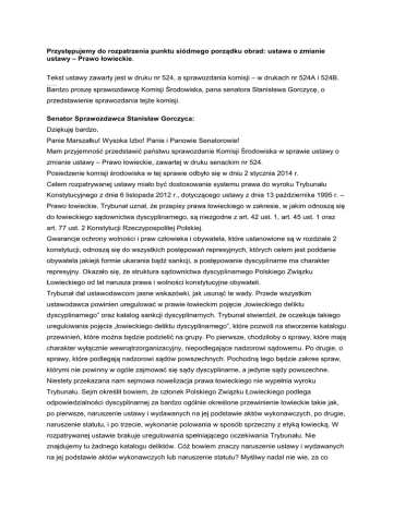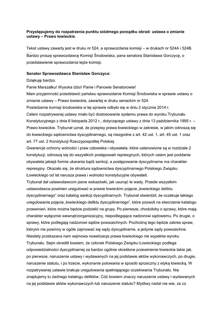 Przystępujemy do rozpatrzenia punktu siódmego porządku obrad: ustawa o zmianie ustawy – Prawo łowieckie. Tekst ustawy zawarty jest w druku nr 524, a sprawozdania komisji – w drukach nr 524A i 524B. Sprawozdanie Komisji Środowiska Bardzo proszę sprawozdawcę Komisji Środowiska, pana senatora Stanisława Gorczycę, o przedstawienie sprawozdania tejże komisji. Senator Sprawozdawca Stanisław Gorczyca: Dziękuję bardzo. Panie Marszałku! Wysoka Izbo! Panie i Panowie Senatorowie! Mam przyjemność przedstawić państwu sprawozdanie Komisji Środowiska w sprawie ustawy o zmianie ustawy – Prawo łowieckie, zawartej w druku senackim nr 524. Posiedzenie komisji środowiska w tej sprawie odbyło się w dniu 2 stycznia 2014 r. Celem rozpatrywanej ustawy miało być dostosowanie systemu prawa do wyroku Trybunału Konstytucyjnego z dnia 6 listopada 2012 r., dotyczącego ustawy z dnia 13 października 1995 r. – Prawo łowieckie. Trybunał uznał, że przepisy prawa łowieckiego w zakresie, w jakim odnoszą się do łowieckiego sądownictwa dyscyplinarnego, są niezgodne z art. 42 ust. 1, art. 45 ust. 1 oraz art. 77 ust. 2 Konstytucji Rzeczypospolitej Polskiej. Gwarancje ochrony wolności i praw człowieka i obywatela, które ustanowione są w rozdziale 2 konstytucji, odnoszą się do wszystkich postępowań represyjnych, których celem jest poddanie obywatela jakiejś formie ukarania bądź sankcji, a postępowanie dyscyplinarne ma charakter represyjny. Okazało się, że struktura sądownictwa dyscyplinarnego Polskiego Związku Łowieckiego od lat narusza prawa i wolności konstytucyjne obywateli. Trybunał dał ustawodawcom jasne wskazówki, jak usunąć te wady. Przede wszystkim ustawodawca powinien uregulować w prawie łowieckim pojęcie „łowieckiego deliktu dyscyplinarnego” oraz katalog sankcji dyscyplinarnych. Trybunał stwierdził, że oczekuje takiego uregulowania pojęcia „łowieckiego deliktu dyscyplinarnego”, które pozwoli na stworzenie katalogu przewinień, które można będzie podzielić na grupy. Po pierwsze, chodziłoby o sprawy, które mają charakter wyłącznie wewnątrzorganizacyjny, niepodlegające nadzorowi sądowemu. Po drugie, o sprawy, które podlegają nadzorowi sądów powszechnych. Pochodną tego będzie zakres spraw, którymi nie powinny w ogóle zajmować się sądy dyscyplinarne, a jedynie sądy powszechne. Niestety przekazana nam sejmowa nowelizacja prawa łowieckiego nie wypełnia wyroku Trybunału. Sejm określił bowiem, że członek Polskiego Związku Łowieckiego podlega odpowiedzialności dyscyplinarnej za bardzo ogólnie określone przewinienie łowieckie takie jak, po pierwsze, naruszenie ustawy i wydawanych na jej podstawie aktów wykonawczych, po drugie, naruszenie statutu, i po trzecie, wykonanie polowania w sposób sprzeczny z etyką łowiecką. W rozpatrywanej ustawie brakuje uregulowania spełniającego oczekiwania Trybunału. Nie znajdujemy tu żadnego katalogu deliktów. Cóż bowiem znaczy naruszenie ustawy i wydawanych na jej podstawie aktów wykonawczych lub naruszenie statutu? Myśliwy nadal nie wie, za co konkretnie może być ukarany. Definicja przewinienia łowieckiego w proponowanym kształcie jest nieprecyzyjna, a odpowiedzialność za nie jest uzależniona od nieostrych pojęć i aktów prawa wewnętrznego. Na tę wadę już wcześniej zwracała uwagę Helsińska Fundacja Praw Człowieka. Kontrowersje budzi też zapis ustawy, zgodnie z którym postępowanie dyscyplinarne o ten sam czyn toczy się niezależnie od postępowania karnego. Przepis ten należy czytać łącznie z innym przepisem nowej ustawy, zgodnie z którym w sprawach o utratę członkostwa w kole łowieckim, nabycia bądź utratę członkostwa w Polskim Związku Łowieckim, po wyczerpaniu postępowania wewnątrzorganizacyjnego, stronom przysługuje odwołanie do sądu okręgowego. Tak więc członek Polskiego Związku Łowieckiego uniewinniony przez sąd powszechny może być ukarany przez sąd dyscyplinarny za ten sam czyn, po czym może się odwołać od decyzji sądu dyscyplinarnego do sądu okręgowego, który ma jeszcze raz rozpoznać tę samą sprawę. Najwyższa Izba Kontroli zauważyła, że w większości postępowań dyscyplinarnych zasada jest taka, że gdy postępowanie kończy się przed sądem powszechnym, to automatycznie zawiesza się postępowanie dyscyplinarne. Wysoka Izbo, na posiedzeniu komisji odbyła się dyskusja, podczas której wskazano na wady przedłożonej ustawy. W posiedzeniu niestety nie brał udziału nikt z wnioskodawców z Sejmu, który mógłby choć po części intencje projektodawców wyjaśnić. Senackie Biuro Legislacyjne zgłosiło pięć uwag i zaproponowało poprawki, które usuwały część wad. Czego dotyczyły te uwagi? Otóż w ustawie przewidziano, że obwiniony ustanawia obrońcę spośród osób mających wykształcenie prawnicze lub członków Polskiego Związku Łowieckiego. Redakcja powyższego przepisu pozwala przypuszczać, że intencją ustawodawcy było umożliwienie obwinionemu skorzystania z pomocy profesjonalnego obrońcy. Jednakże przyjęte sejmowe rozwiązanie zakłada obowiązkowe ustanowienie obrońcy przez obwinionego. Ustanowienie obrońcy jest prawem, jakie przysługuje… Nie może to być obowiązek. Obecna na posiedzeniu komisji przedstawicielka Najwyższej Izby Kontroli zauważyła, że w postępowaniu dyscyplinarnym nie powinno być żadnego graniczenia co do tego, kogo obwiniony wybiera na obrońcę. Obwiniony sam powinien wybrać osobę, z którą chce współpracować. To nie jest sąd powszechny, w przypadku którego są wymagania co do wykształcenia czy funkcji. Dalej: w ustawie zaproponowano, że Naczelna Rada Łowiecka powołuje sędziów Głównego Sądu Łowieckiego i głównego rzecznika dyscyplinarnego, natomiast okręgowe rady łowieckie powołują okręgowe sądy łowieckie i okręgowych rzeczników dyscyplinarnych. Biuro Legislacyjne zauważyło, że to rozwiązanie