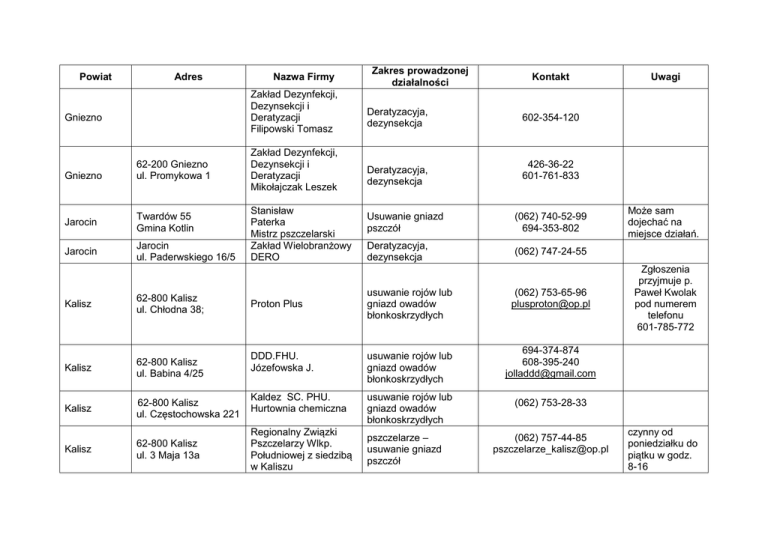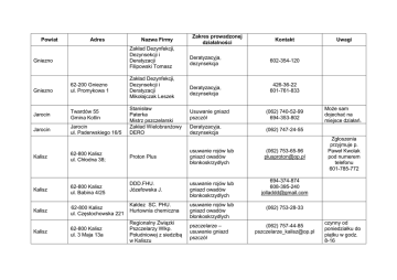 Powiat Adres Zakład Dezynfekcji, Dezynsekcji i Deratyzacji Filipowski Tomasz Gniezno Gniezno Nazwa Firmy 62-200 Gniezno ul. Promykowa 1 Jarocin Twardów 55 Gmina Kotlin Jarocin Jarocin ul. Paderwskiego 16/5 Kalisz 62-800 Kalisz ul. Chłodna 38; Kalisz 62-800 Kalisz ul. Babina 4/25 Kalisz 62-800 Kalisz ul. Częstochowska 221 Kalisz 62-800 Kalisz ul. 3 Maja 13a Zakład Dezynfekcji, Dezynsekcji i Deratyzacji Mikołajczak Leszek Stanisław Paterka Mistrz pszczelarski Zakład Wielobranżowy DERO Zakres prowadzonej działalności Deratyzacyja, dezynsekcja Deratyzacyja, dezynsekcja Kontakt Uwagi 602-354-120 426-36-22 601-761-833 Usuwanie gniazd pszczół (062) 740-52-99 694-353-802 Deratyzacyja, dezynsekcja (062) 747-24-55 Proton Plus usuwanie rojów lub gniazd owadów błonkoskrzydłych (062) 753-65-96 [email protected] DDD.FHU. Józefowska J. usuwanie rojów lub gniazd owadów błonkoskrzydłych 694-374-874 608-395-240 [email protected] Kaldez SC. PHU. Hurtownia chemiczna usuwanie rojów lub gniazd owadów błonkoskrzydłych (062) 753-28-33 Regionalny Związki Pszczelarzy Wlkp. Południowej z siedzibą w Kaliszu pszczelarze – usuwanie gniazd pszczół (062) 757-44-85 [email protected] Może sam dojechać na miejsce działań. Zgłoszenia przyjmuje p. Paweł Kwolak pod numerem telefonu 601-785-772 czynny od poniedziałku do piątku w godz. 8-16 Kępno Kępno ul. Rynek 41/8 Kępno Wieruszów ul. Kępińska 12/4 Koło Koło Konin 62-600 Koło Borki ul. Polna 8 62-510 Konin ul. Spółdzielców 31/1 Konin ul. 11 Listopada 34/44 Jerzy Śpiewak tylko pszczoły Władysław Zabłocki usuwanie rojów lub gniazd owadów błonkoskrzydłych Usuwanie os. pszczół, szerszeni 607-058-523 P.U.H. "KAJA" Usuwanie os. pszczół, szerszeni (063) 222-94-00 608-180-048 604-084-478 PHU „TERMIT” W. Jesiołowski, Usługi pszczelarskie Bogdan Kaniewski, Usługi pszczelarskie Konin Konin ul. Szeligowskiego3/63 Jan Czeszejko, Usługo pszczelarskie Konin Sługocinek 14, gm. Golina Mariusz Wojciechowski Usługi Pszczelarskie Konin Lubstów ul. Jeziorna 9a gm. Sompolno Andrzej Rzeźnik Usługi pszczelarskie Konin (062) 581-00-81 Kolasa Joanna. Zakład dezynfekcji i deratyzacji Żychlin, ul. Jodłowa 7 gm. St. Miasto Konin ul. Aleje 1-go Maja 8/7 Konin 662-105-872 Usuwanie zagrożeń owadów błonkoskrzydłych (osy, szerszenie), deratyzacja, dezynsekcja, dezynfekcja Usuwanie gniazd pszczół. Usuwanie gniazd pszczół. Usuwanie gniazd pszczół oraz zagrożeń od os i szerszeni. Usuwanie gniazd pszczół. Usuwanie gniazd pszczół, istnieje możliwość usunięcia os i szerszeni. 604-226-353 (063) 245-10-10 609-205-861 (063) 244-25-58 606-922-565 691-533-140 (063) 244-96-34 (063) 247-46-17 668-005-775 605-516-428 Konin Leszno Dębowiec ul. Towarzystwo 3 gm. Wilczyn 64-100 Leszno ul. Holenderska 9/6 Nowy Tomyśl 64 – 300 Nowy Tomyśl ul. Poznańska 36 / 1 Nowy Tomyśl 64 – 300 Nowy Tomyśl ul. Piłsudzkiego 47 / 1 Jacek Biernacki Usługi pszczelarskie Higiena Sanitarna Piotr Skorupiński Usługowy zakład dezynfekcji, dezynsekcji, deratyzacji. Leszek Garski Specjalistyczny Zakład DDD. Paweł Słaboszewski Specjalistyczny Zakład Dezynfekcji, Dezynsekcji i Deratyzacji „ BLEGS ” Nowy Tomyśl 64 – 300 Nowy Tomyśl Chojniki 24 Nowy Tomyśl 64 – 300 Nowy Tomyśl pl. Chopina 17 Wichert Jacek Nowy Tomyśl 64 -300 Nowy Tomyśl os. S. Batorego 50 / 8 Świderski Henryk Nowy Tomyśl 64 – 300 Nowy Tomyśl os. S. Batorego 41 Kasper Michał Nowy Tomyśl Nowy Tomyśl Piechowiak Bronisław Usuwanie gniazd pszczół Usuwanie os i szerszeni Deratyzacyja, dezynsekcja Usuwanie os i szerszeni Deratyzacyja, dezynsekcja pszczelarze – usuwanie gniazd pszczół pszczelarze – usuwanie gniazd pszczół pszczelarze – usuwanie gniazd pszczół pszczelarze – usuwanie gniazd pszczół 607-107-413 (065) 526-16-06 605-271-707 (061) 442-20-45 603-275-197 510-879-910 (061) 442-40-96 660-418-753 606-335-880 (061) 442-25-68 505-019-957 (061) 291-30-04 880-534-309 (061) 442-31-79 501-375-398 (061) 442-81-18 działa również na terenie Grodziska Wlkp. Nowy Tomyśl os. S. Batorego 33 / 3 Gola Zbigniew Nowy Tomyśl Wąsowo ul. Wybudowanie Poł. 15 Rogal Alfons Nowy Tomyśl Opalenica Nowy Tomyśl ul. Powstańców Wlkp. 64 – 310 Lwówek Jarnot Kazimierz Oborniki Poznań, Os. Zwycięstwa 9i SPEC Oborniki Poznań ul. Taczaka18 ROBALEX Oborniki Poznań ul. Jagodowa 20 Leszek Pranke pszczelarz Oborniki Luboń ul. Kościuszki 51/10 RAPIDO Oborniki Gorzewo Zbąszyniak Henryk - pszczelarz Oborniki 64-500 Szamotuły ul. 3 Maja 9d/3 Ostrów Wlkp. 63-400 Ostrów Wlkp. ul. Nałkowskiej 18, Bartkowiak Dariusz PESTEX Dezynfekcja, Dezynsekcja i Deratyzacja. Andrzej Kubik pszczelarze – usuwanie gniazd pszczół pszczelarze – usuwanie gniazd pszczół pszczelarze – usuwanie gniazd pszczół pszczelarze – usuwanie gniazd pszczół Usuwanie wszystkich owadów błonkoskrzydłych Usuwanie wszystkich owadów błonkoskrzydłych Usuwanie wszystkich owadów błonkoskrzydłych Usuwanie wszystkich owadów błonkoskrzydłych (061) 442-53-46 602-252-437 (061) 447-29-26 domowy: 0614479210, kom: 603075030. kom: 783567511 602-814-648 603-124-380 609-490-798 (061) 879-80-13 601-731-267 (061) 810-31-38 Usuwanie pszczół 695-713-056 (067) 283-77-22 dezynfekcja, dezynsekcja (likwidacja owadów błonkoskrzydłych), deratyzacja tel. 530 77 45 33 tel./faks 61 639 33 31 e-mail: [email protected] Dezynfekcja, Dezynsekcja i Deratyzacja (062) 738-32-50 608-475-195 Ostrzeszów Ostrzeszów ul. Kochanowskiego 4 Ostrzeszów Ostrów Wlkp. ul. Nałkowskiej 18 Piła Piła ul. Dąbrowskiego 87 Piła Piła ul. Śniadeckich 5 c/4 Piła Kruszewo ul. Towarowa 6 Poznań Poznań osoba prywatna Dezynfekcja, Dezynsekcja i Deratyzacja. Andrzej Kubik CIMEX Specjalistyczny Zakład Dezynfekcji, Dezynsekcji i Deratyzacji Specjalistyczny Zakład Dezynfekcji Dezynsekcji i Deratyzacji Jerzy Spychała chemik Przedsiębiorstwo Specjalistyczne „ANPOŻ” Łukasz Perz Poznań, ul. Raszkowska 