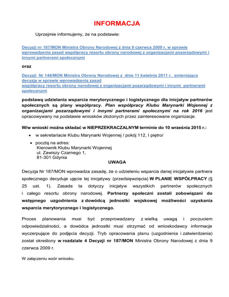 INFORMACJA Uprzejmie informujemy, że na podstawie: Decyzji nr 187/MON Ministra Obrony Narodowej z dnia 9 czerwca 2009 r. w sprawie wprowadzenia zasad współpracy resortu obrony narodowej z organizacjami pozarządowymi i innymi partnerami społecznymi oraz Decyzji Nr 146/MON Ministra Obrony Narodowej z dnia 11 kwietnia 2011 r. zmieniająca decyzję w sprawie wprowadzenia zasad współpracy resortu obrony narodowej z organizacjami pozarządowymi i innymi partnerami społecznymi podstawą udzielania wsparcia merytorycznego i logistycznego dla inicjatyw partnerów społecznych są plany współpracy. Plan współpracy Klubu Marynarki Wojennej z organizacjami pozarządowymi i innymi partnerami społecznymi na rok 2016 jest opracowywany na podstawie wniosków złożonych przez zainteresowane organizacje. W/w wnioski można składać w NIEPRZEKRACZALNYM terminie do 10 września 2015 r.: w sekretariacie Klubu Marynarki Wojennej / pokój 112, I piętro/ pocztą na adres: Kierownik Klubu Marynarki Wojennej ul. Zawiszy Czarnego 1, 81-301 Gdynia UWAGA Decyzja Nr 187/MON wprowadza zasadę, że o udzieleniu wsparcia danej inicjatywie partnera społecznego decyduje ujęcie tej inicjatywy (przedsięwzięcia) W PLANIE WSPÓŁPRACY (§ 25 ust. 1). Zasada ta dotyczy inicjatyw wszystkich partnerów społecznych i całego resortu obrony narodowej. Partnerzy społeczni zostali zobowiązani do wstępnego uzgodnienia z dowódcą jednostki wojskowej możliwości uzyskania wsparcia merytorycznego i logistycznego. Proces planowania musi być przeprowadzany z wielką uwagą i poczuciem odpowiedzialności, a dowódca jednostki musi otrzymać od wnioskodawcy informacje wyczerpujące do podjęcia decyzji. Tryb opracowania planu (uzgodnienia i zatwierdzenia) został określony w rozdziale 4 Decyzji nr 187/MON Ministra Obrony Narodowej z dnia 9 czerwca 2009 r. W załączeniu wzór wniosku. WZÓR DANE WNIOSKODAWCY: Pełna nazwa………………………….. Adres wnioskodawcy………………… NR KRS lub innej ewidencji…………. NR REGON…………………………... Telefon kontaktowy………………….. DOWÓDCA JEDNOSTKI WOJSKOWEJ /wspierającej przedsięwzięcie/ WNIOSEK * do planu współpracy jednostki wojskowej z organizacjami pozarządowymi i innymi partnerami społecznymi na rok 2016 r. Data dd.mm.rr Lp. Nazwa przedsięwzięcia Szczegółowy zakres oczekiwanej pomocy Miejsce realizacji Nazwy innych jednostek wojskowych, które będą wspierały to przedsięwzięcie Wnioskodawca 1. Krótki opis przedsięwzięcia Planowany udział innych JW, które będą udzielały wsparcia dla tego przedsięwzięcia - proszę podać nazwę każdej jednostki, do której został skierowany/będzie skierowany wniosek do planu współpracy dotyczący tego przedsięwzięcia, razem z zakresem oczekiwanej pomocy Wskazanie podmiotu ponoszącego koszty wnioskowanej pomocy Przewidywana liczba uczestników przedsięwzięcia Planowane działania promocyjne Źródła finansowania przedsięwzięcia Współorganizatorzy przedsięwzięcia Pieczęć i podpis osoby reprezentującej partnera społecznego Dane osoby odpowiedzialnej za przedsięwzięcie /imię, nazwisko i numer telefonu kontaktowego/ * Wzór wniosku został opracowany na podstawie znowelizowanej Decyzji nr 187/MON Ministra Obrony Narodowej z dnia 9 czerwca 2009 r. w sprawie wprowadzenia zasad współpracy resortu obrony narodowej z organizacjami pozarządowymi i innymi partnerami społecznymi Do uzgodnień i dalszych konsultacji w powyższej sprawie upoważnieni zostali: główny specjalista kierownik działu pan Marek Gałęzowski (tel. kontaktowy CA MON 261 26-38-04) specjalista pani Beata Kępa (tel. kontaktowy CA MON 261 26-37-32).