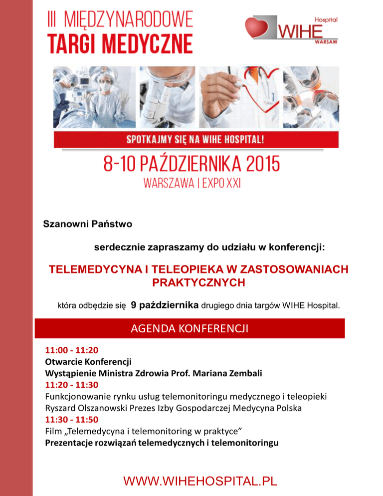 Szanowni Państwo serdecznie zapraszamy do udziału w konferencji: TELEMEDYCYNA I TELEOPIEKA W ZASTOSOWANIACH PRAKTYCZNYCH która odbędzie się 9 października drugiego dnia targów WIHE Hospital. AGENDA KONFERENCJI 11:00 - 11:20 Otwarcie Konferencji Wystąpienie Ministra Zdrowia Prof. Mariana Zembali 11:20 - 11:30 Funkcjonowanie rynku usług telemonitoringu medycznego i teleopieki Ryszard Olszanowski Prezes Izby Gospodarczej Medycyna Polska 11:30 - 11:50 Film „Telemedycyna i telemonitoring w praktyce” Prezentacje rozwiązań telemedycznych i telemonitoringu WWW.WIHEHOSPITAL.PL 11:50 - 13:00 E’Medicina - Hybrydowa Rehabilitacja Kardiologiczna MedApp - Mobilne EKG Śląskie Centrum Chorób Serca - Specjalistyczna telekonsultacja kardiologiczna Sidly - Multisensoryczny aparat do monitoringu parametrów życiowych Nestmsdic - Pregnabit - pierwsze na świecie telemedyczne KTG do monitoringu zagrożeń płodu w przebiegu ciąży Medspire - Telemonitoring farmakoterapii lekami wziewnymi Polsko - Japońska Akademia Technik Komputerowych - Nowoczesne technologie informatyczne w monitorowaniu i analizie postępów rehabilitacji 13:00 - 13:20 - Przerwa 13:20 - 14:40 Comarch - Zdalna opieka medyczna: produkty i usługi E-leczenie 24 - Modele telekonsultacji psychologicznej Edu4med - e’Edukacja w ochronie zdrowia Seventica - Komunikacja bez barier, jak skutecznie obsługiwać osoby niesłyszące Honest Technolgy Clutch / Etos - WHSpot - Bezpieczna Platforma Wsparcia Seniorów IC Solution - Pióro cyfrowe w zastosowaniach Elektronicznej Dokumentacji Medycznej (EDM) MedGo - Funkcjonowanie „Centrum Telemonitoringu” Silvermedia - Oprogramowanie wspomagające pracę Centrum Telemonitoringu 14:40 - 15:00 - Podsumowanie konferencji ZAPRASZAMY! WWW.WIHEHOSPITAL.PL
