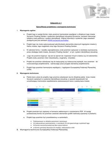 Załącznik nr 1 Specyfikacja projektowa i wymagania techniczne 1. 2. Wymagania ogólne a. Projekt logo w swojej formie i stylu powinno harmonijnie współgrać z oficjalnym logo miasta Szczecin Floating Garden i systemem identyfikacji wizualnej Szczecina, zarazem stanowiąc odrębny znak graficzny i system identyfikacji. Więcej informacji o systemie i jego zasadach dostępne jest pod adresem WWW.szczecina.eu/marka/. b. Projekt logo nie może wykorzystywać jakichkolwiek elementów obecnych logotypów miasta tj: Herbu miasta, logo magistratu oraz logo Szczecin Floating Garden. c. W zakresie formy i kształtu zaprojektowany znak powinien wpisywać w stylistykę wyznaczoną przez strategię marki miasta „Szczecin Floating Garden” w tym system identyfikacji wizualnej; d. Logo nie powinno kojarzyć się lub na wprost lub kopiować innych znaków czy ich elementów. Projekt znaku powinien mieć indywidualny, oryginalny charakter. e. Projekt nie powinien odwoływać się do tradycyjnej czy historycznej stylistyki, lecz powinien do nowoczesnego projektowania, wykraczając poza przyjęte standardy projektowania; f. Projekt logo powinien harmonijnie współgrać z logotypem Europejskiej Federacji Pływackiej (LEN) Wymagania techniczne a. Paleta barw użyta do projektu logo powinna odwoływać się do oficjalnej palety braw miasta Szczecin opisanych w systemie identyfikacji wizualnej, w sposób bezpośredni lub umożliwiający harmonijne współistnienie zastosowanych barw z paletą barw miasta. b. Projekt powinien być zapisany w formacie wektorowym o rozszerzeniu PDF. W swojej podstawowej formie nie powinien zawierać elementów grafiki rastrowej (opisanej w pixelach). c. Projekt logo powinien być przedstawiony w wariantach: • • • Podstawowym w układzie poziomym i pionowym W maksymalnym pomniejszeniu o szerokości 25 mm gwarantując czytelność logo W formie monochormatycznej (bez użycia koloru) w formie symulacji tłoczenia ma medalu, wykrawania w folii • 3. Wymagania techniczne Europejskiej Federacji Pływackiej a. Logo miasta powinni harmonijnie wpisywać się w moduł graficzny wymagany przez LEN precyzyjnie pokazany na poniższym rysunku: