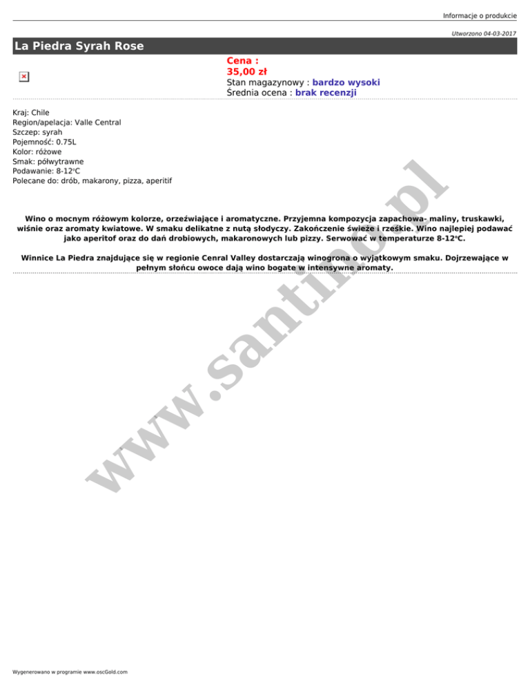 Informacje o produkcie Utworzono 04-03-2017 La Piedra Syrah Rose Cena : 35,00 zł Stan magazynowy : bardzo wysoki Średnia ocena : brak recenzji pl Kraj: Chile Region/apelacja: Valle Central Szczep: syrah Pojemność: 0.75L Kolor: różowe Smak: półwytrawne Podawanie: 8-12oC Polecane do: drób, makarony, pizza, aperitif in o. Wino o mocnym różowym kolorze, orzeźwiające i aromatyczne. Przyjemna kompozycja zapachowa- maliny, truskawki, wiśnie oraz aromaty kwiatowe. W smaku delikatne z nutą słodyczy. Zakończenie świeże i rześkie. Wino najlepiej podawać jako aperitof oraz do dań drobiowych, makaronowych lub pizzy. Serwować w temperaturze 8-12oC. w w w .s an t Winnice La Piedra znajdujące się w regionie Cenral Valley dostarczają winogrona o wyjątkowym smaku. Dojrzewające w pełnym słońcu owoce dają wino bogate w intensywne aromaty. Wygenerowano w programie www.oscGold.com