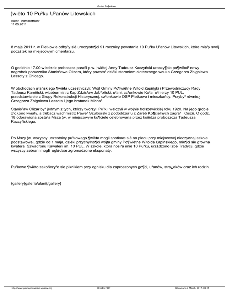 8 maja 2011 r. w Pietkowie odby³y siê uroczysto¶ci 91 rocznicy powstania 10 Pu³ku U³anów Litewskich, które mia³y swój